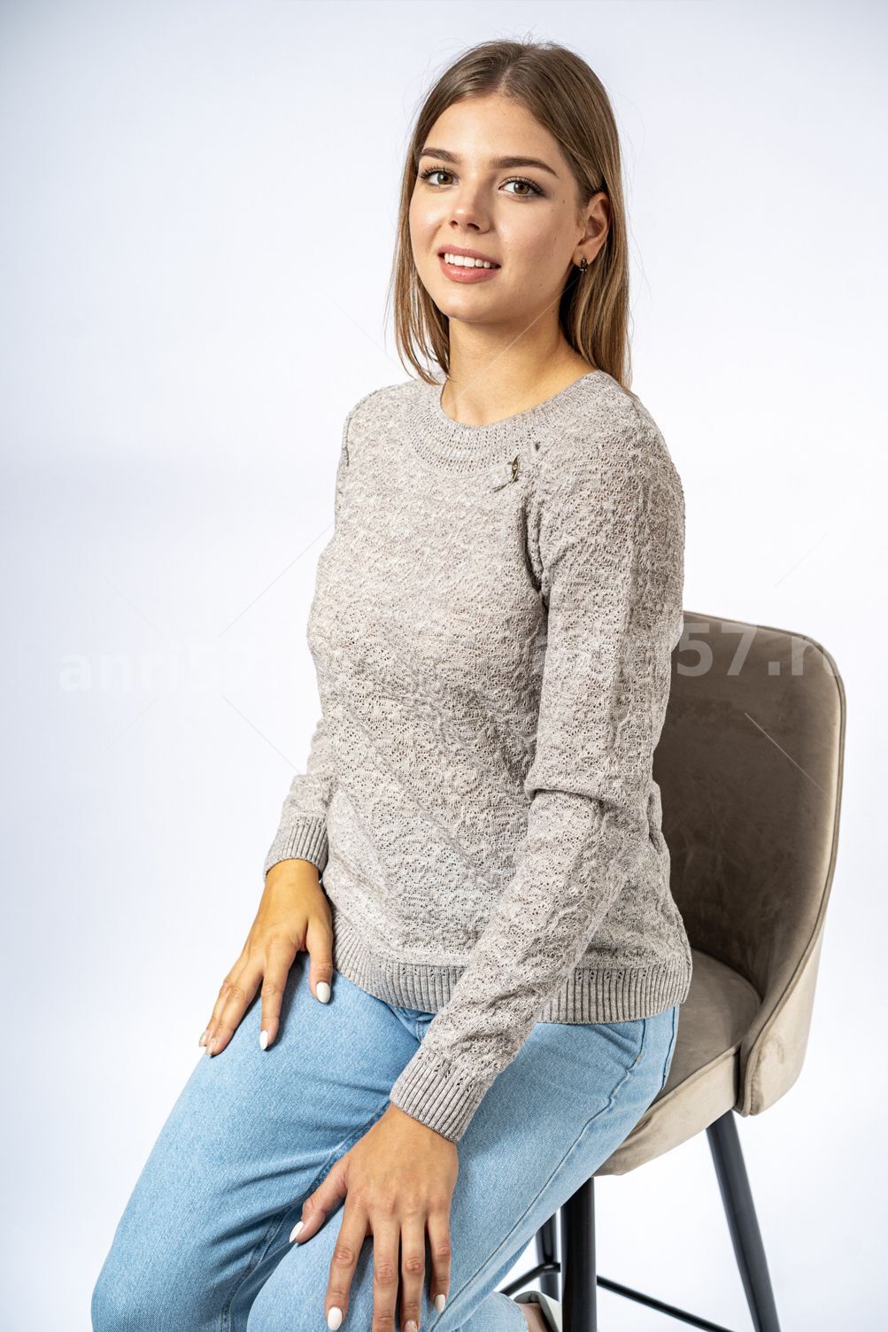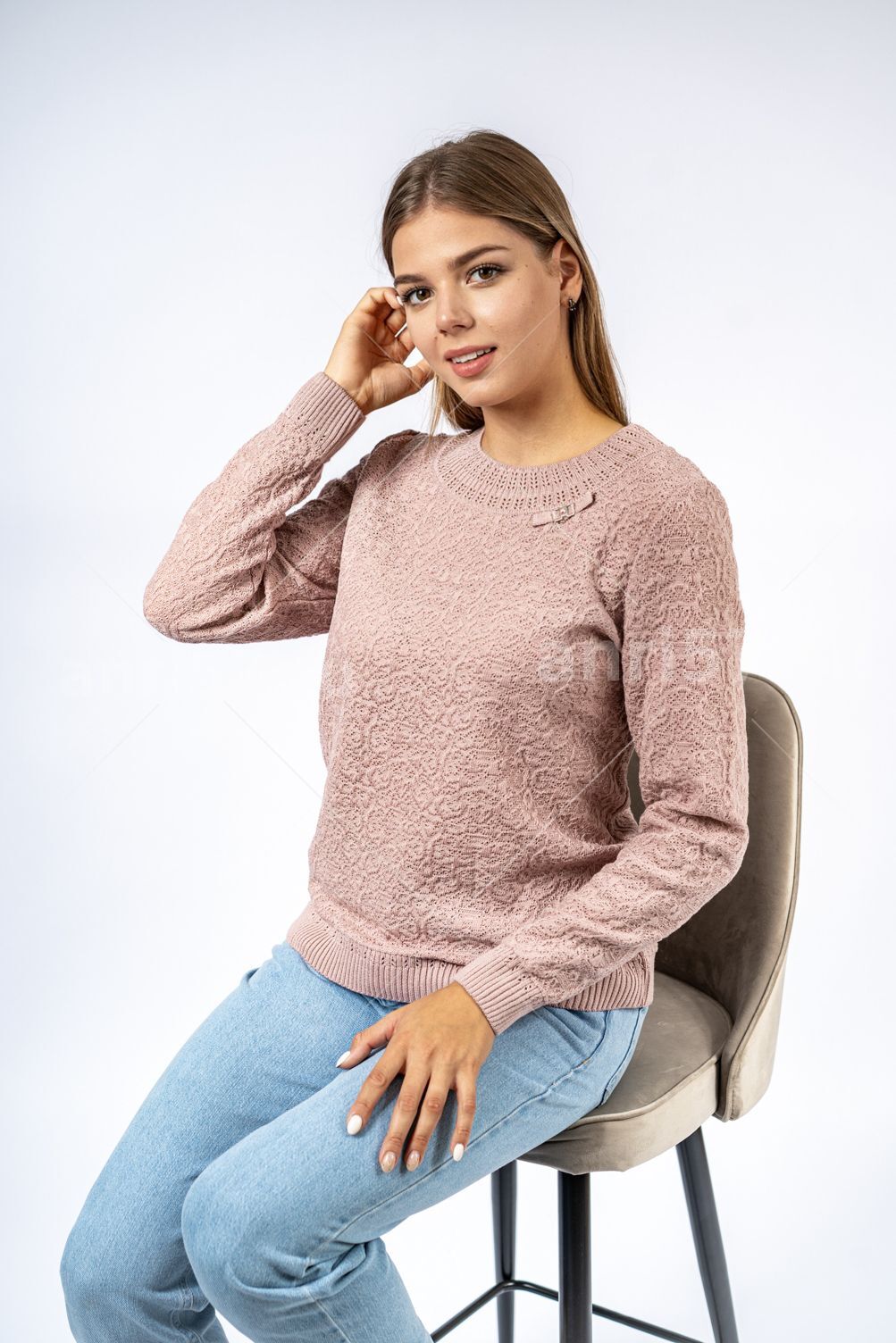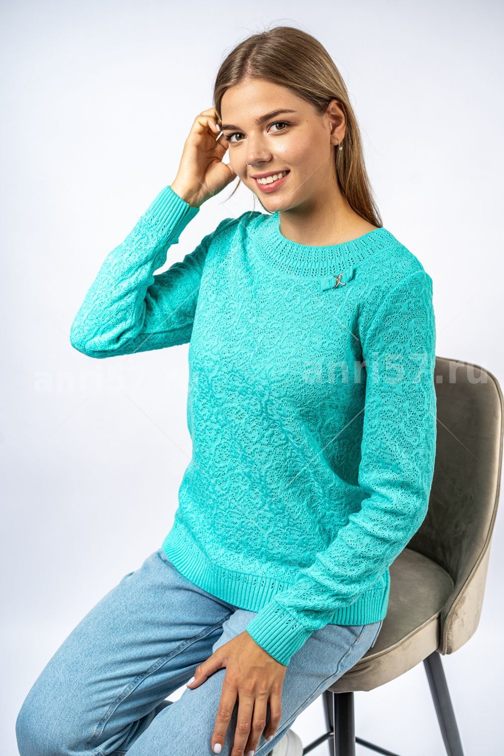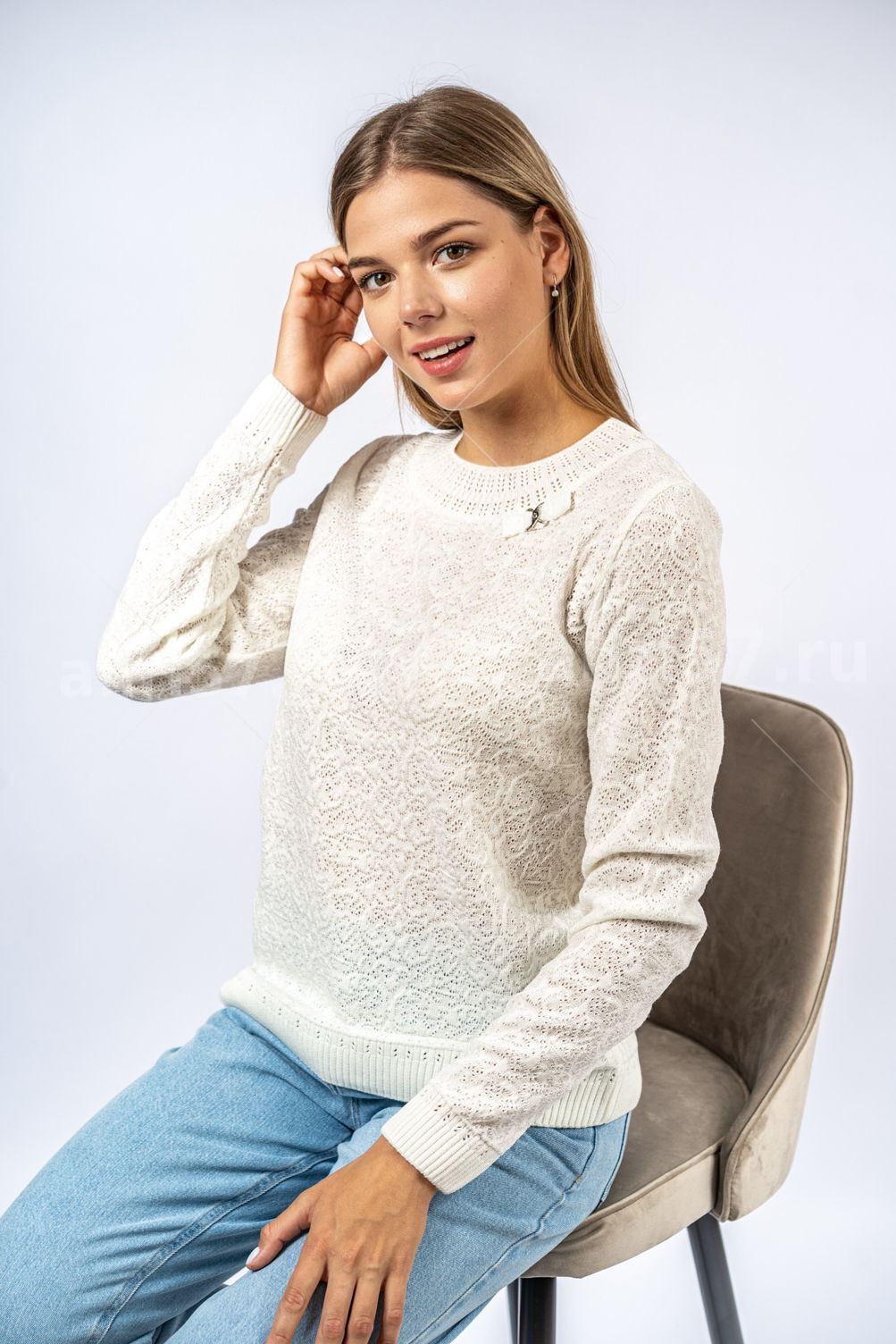 Джемпер женский ж0306. Джемпер из тонкого вязаного полотна с фактурным узором. Горловина округлой формы с обтачкой в виде "кокетки", декорированной тесьмой и украшением из металла. Рукав втачной, прямой. Низ изделия и низ рукава на "резинке". Состав: 30% Шерсть, 70% ПАН.