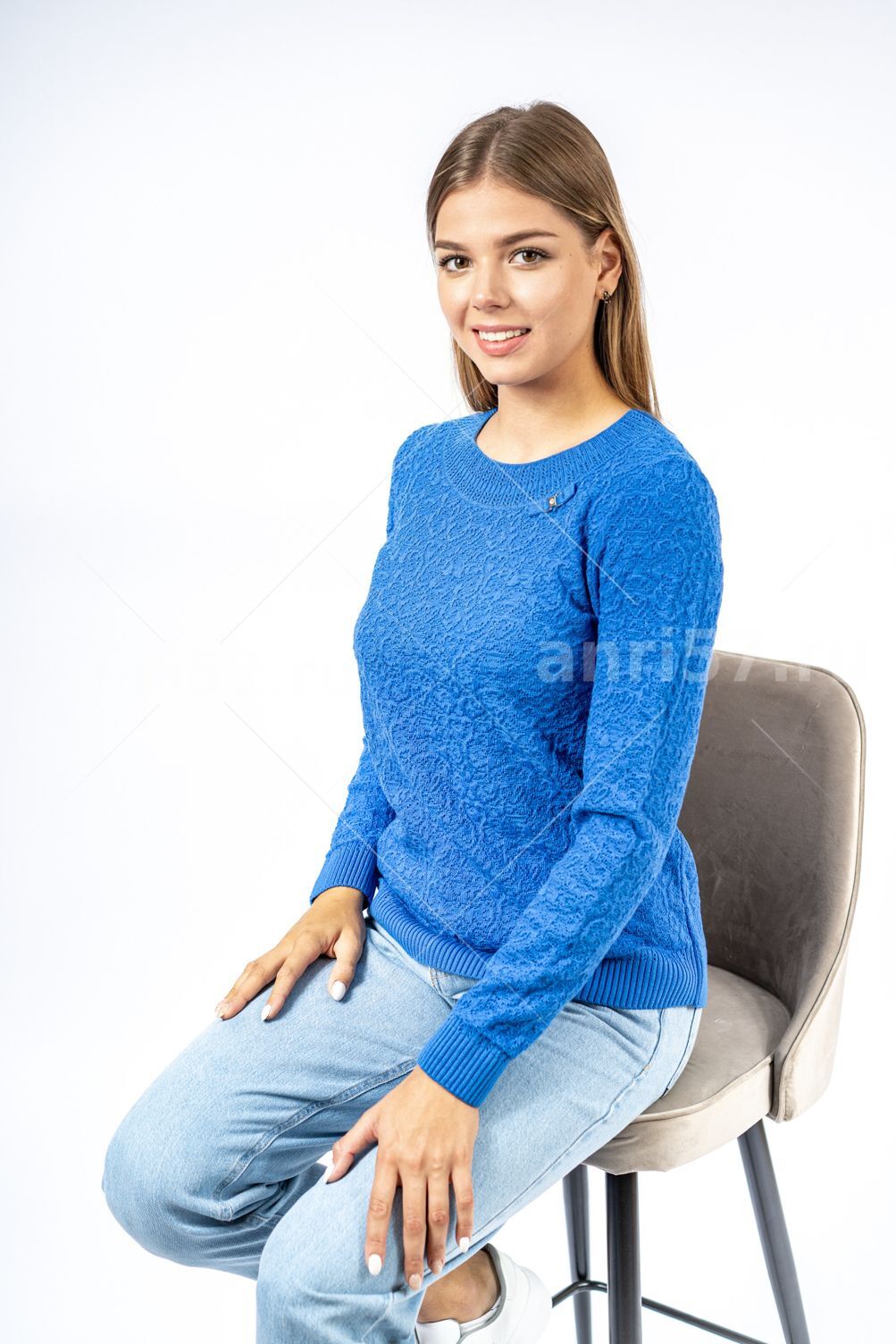 Джемпер женский ж0306. Джемпер из тонкого вязаного полотна с фактурным узором. Горловина округлой формы с обтачкой в виде "кокетки", декорированной тесьмой и украшением из металла. Рукав втачной, прямой. Низ изделия и низ рукава на "резинке". Состав: 30% Шерсть, 70% ПАН.