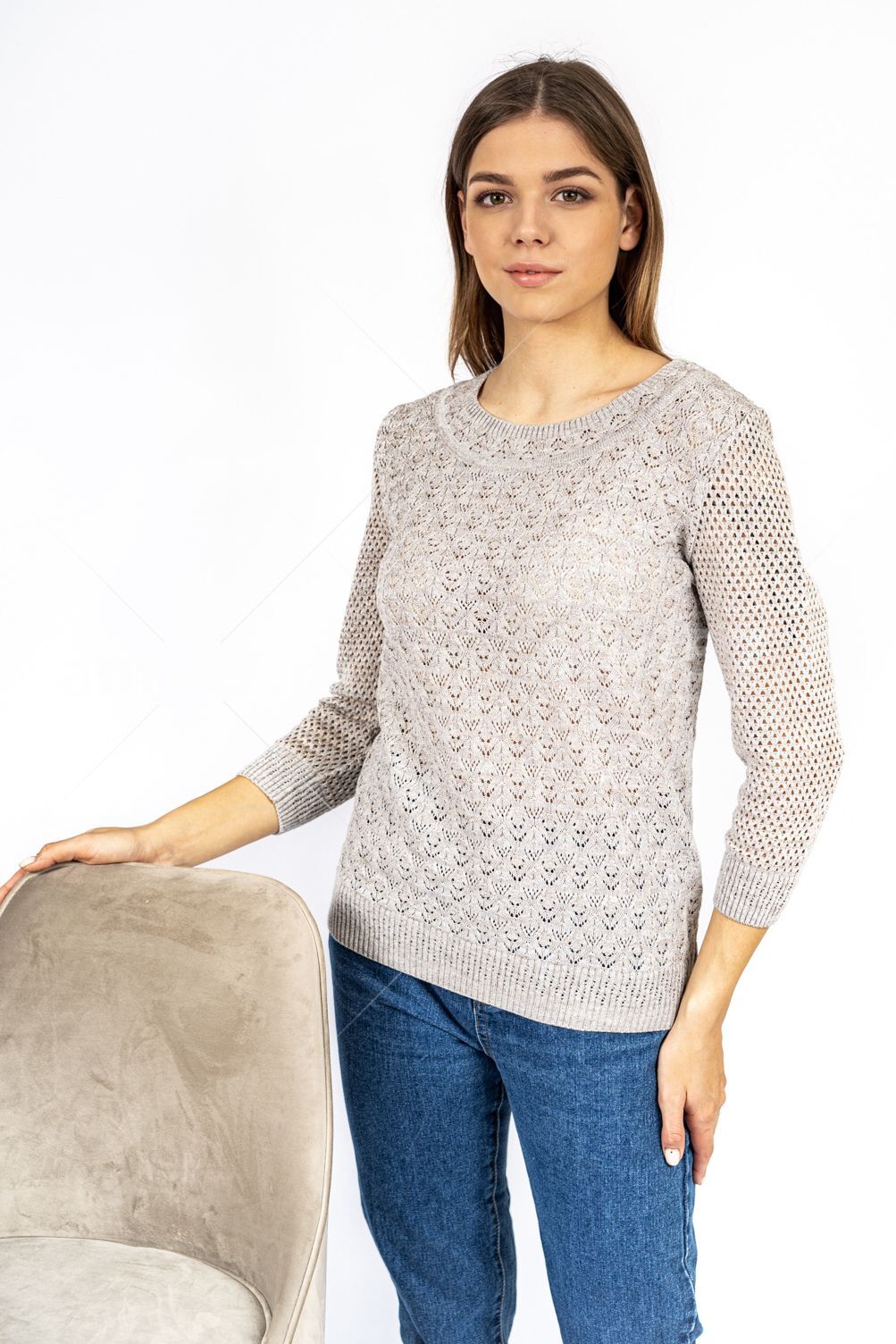 Джемпер женский ж0549. Джемпер полуприлегающего силуэта из ажурного вязаного полотна. Горловина округлой формы с обтачкой. Рукав втачной, укороченный, сетчатой фактуры. Низ изделия, низ рукава на "резинке". Состав: 50% Хлопок, 50% ПАН.