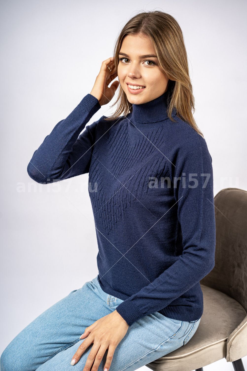 Джемпер женский ж0621. Джемпер полуприлегающего силуэта изготовлен по бесшовной технологии, из мягкой эластичной пряжи. Горловина с воротником "хомут". На полочке частичный фактурный узор. Состав: 50% Акрил,20% Меринос,20% Эластан,10% П/А.