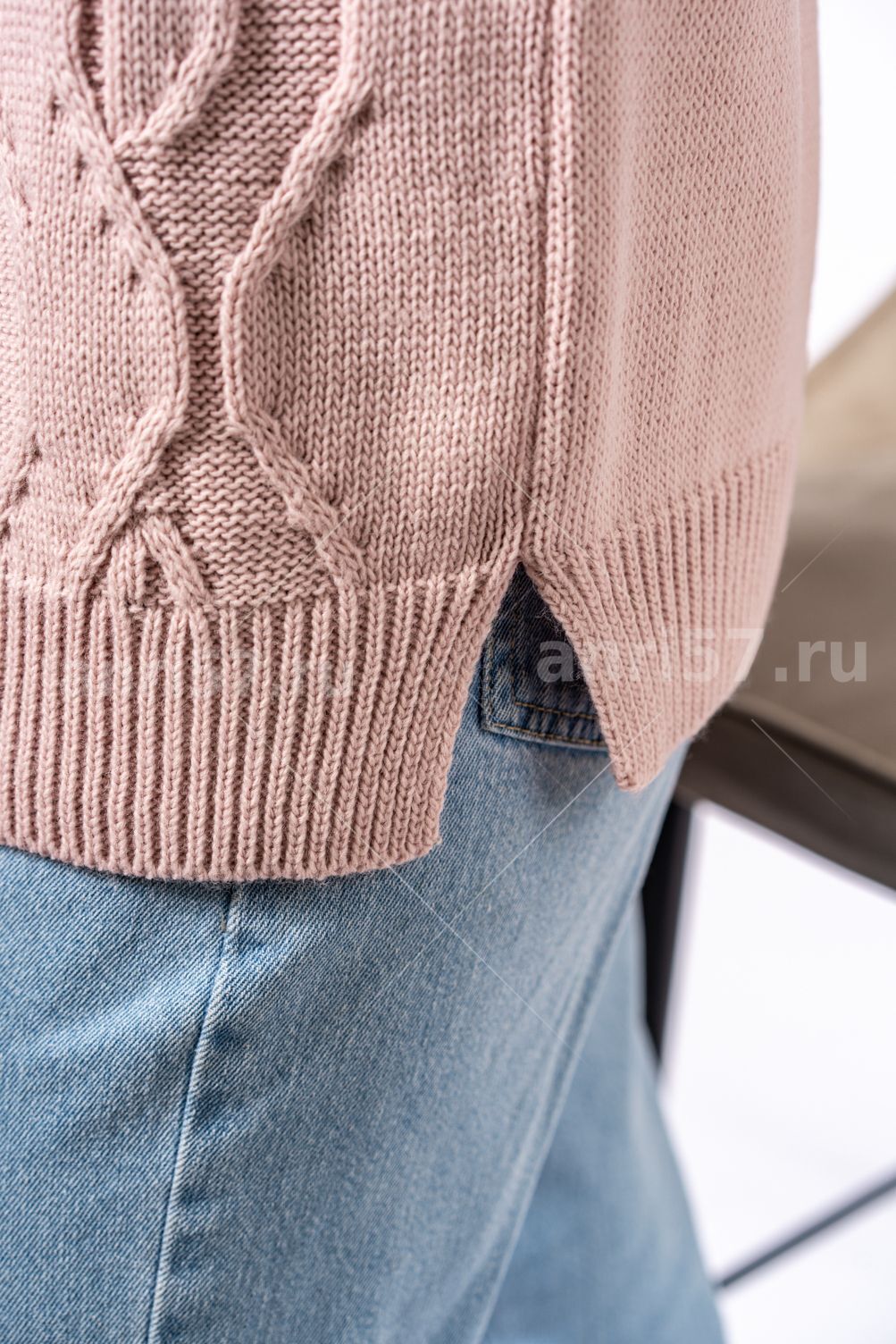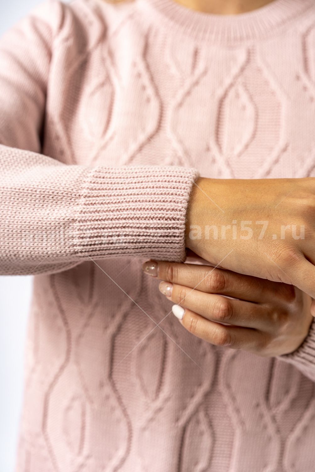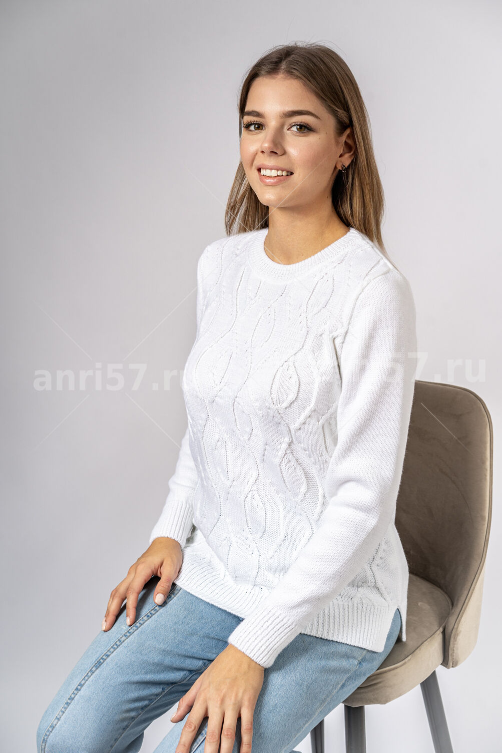 Джемпер женский ж0635. Джемпер прямого силуэта из мягкого вязаного полотна. По центру полочки ажурный узор. Горловина округлой формы с обтачкой. Рукав втачной, на "резинке" по низу. В боковых швах изделия - разрезы на ширину резинки. Состав: 30% Шерсть, 70% ПАН.