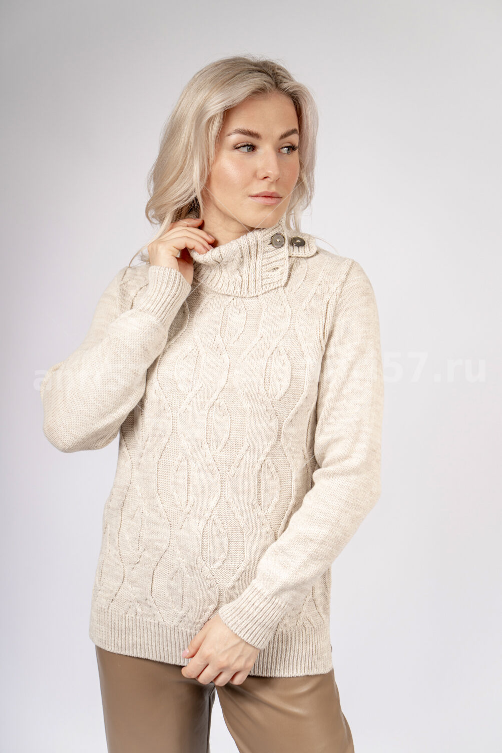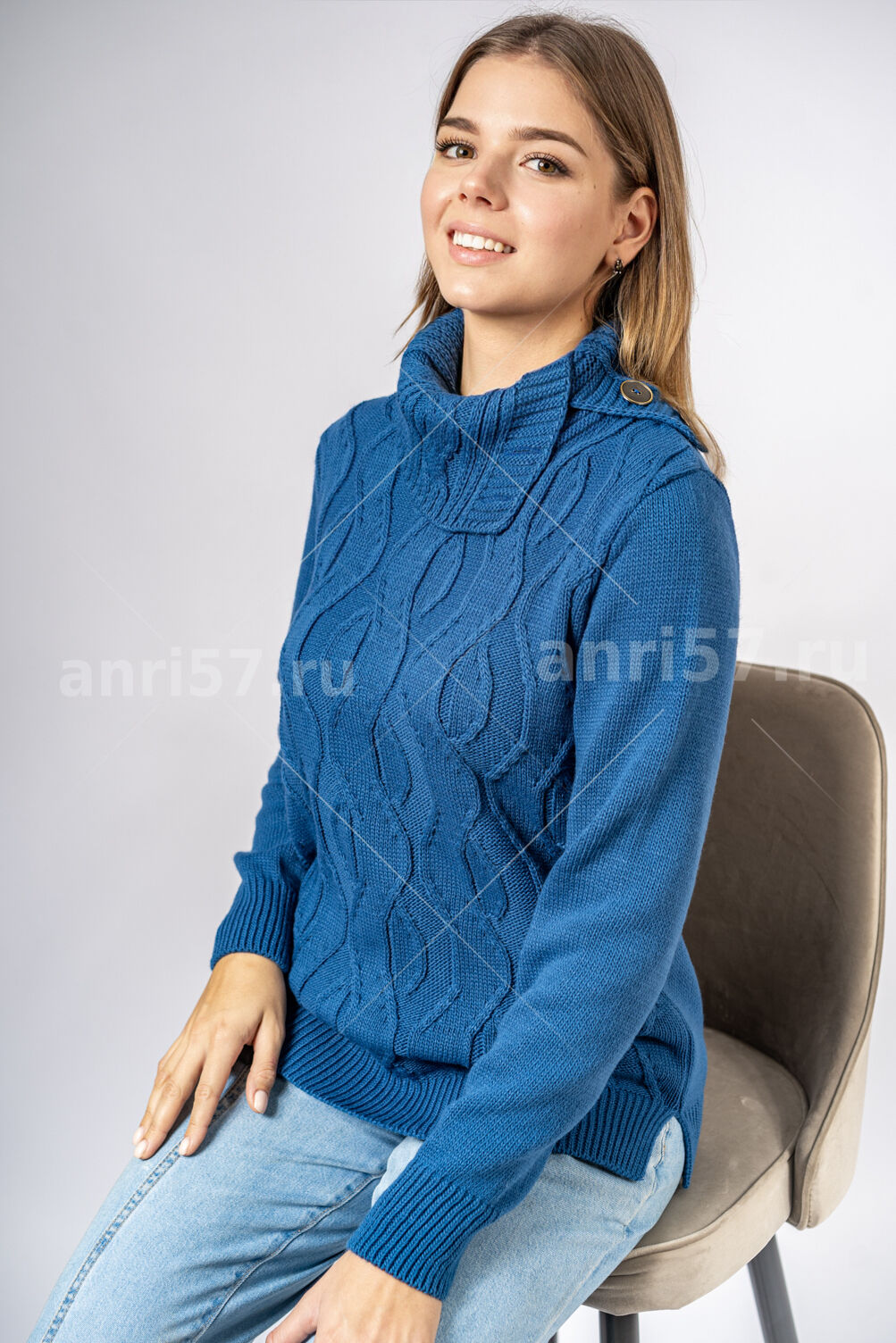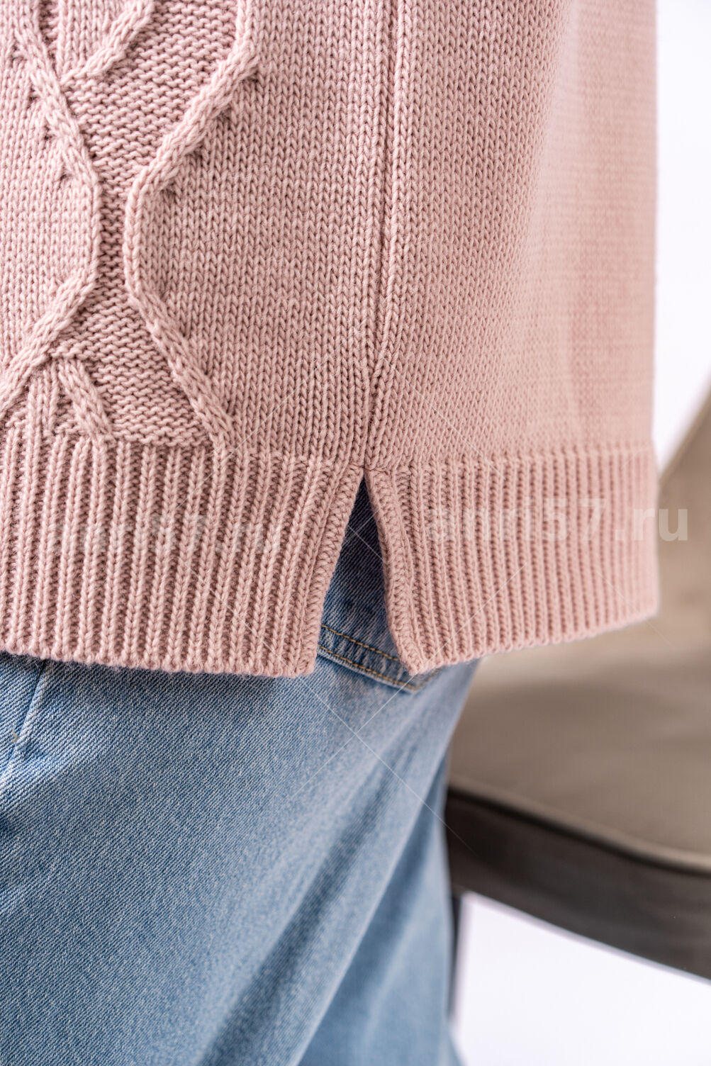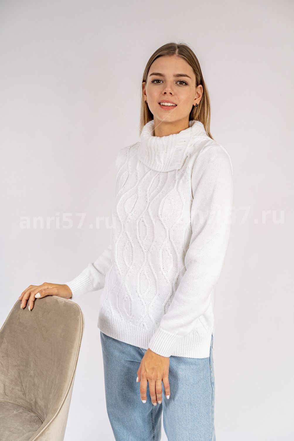 Джемпер женский ж0635х. Джемпер прямого силуэта из мягкого вязаного полотна. По центру полочки ажурный узор. Горловина округлой формы с обтачкой. Рукав втачной, на "резинке" по низу. В боковых швах изделия - разрезы на ширину резинки. Состав: 30% Шерсть, 70% ПАН.