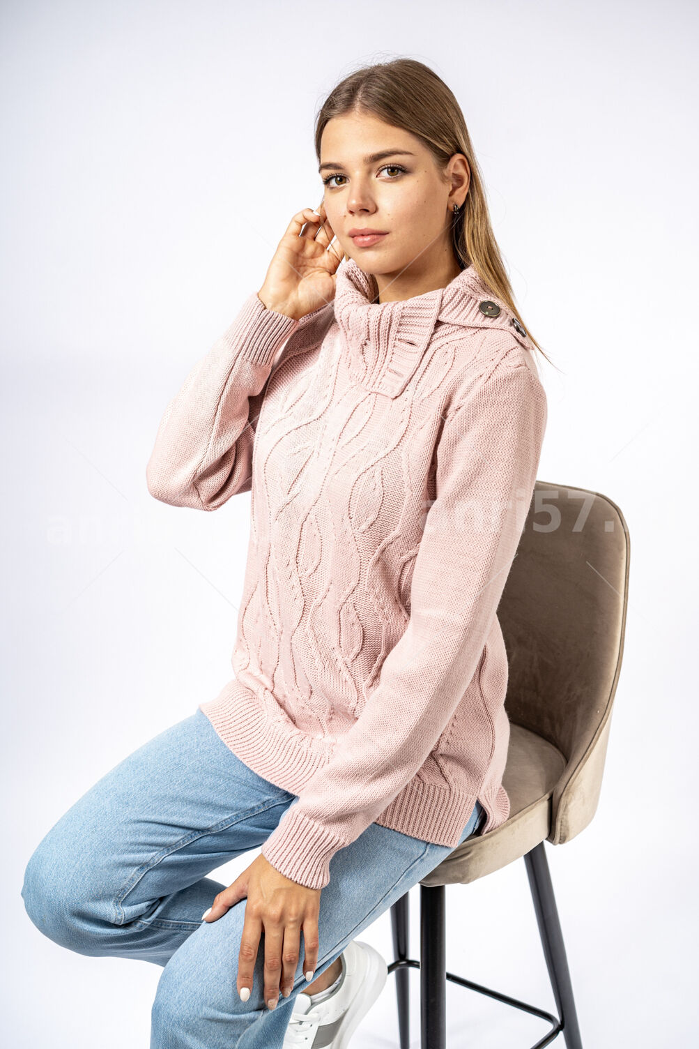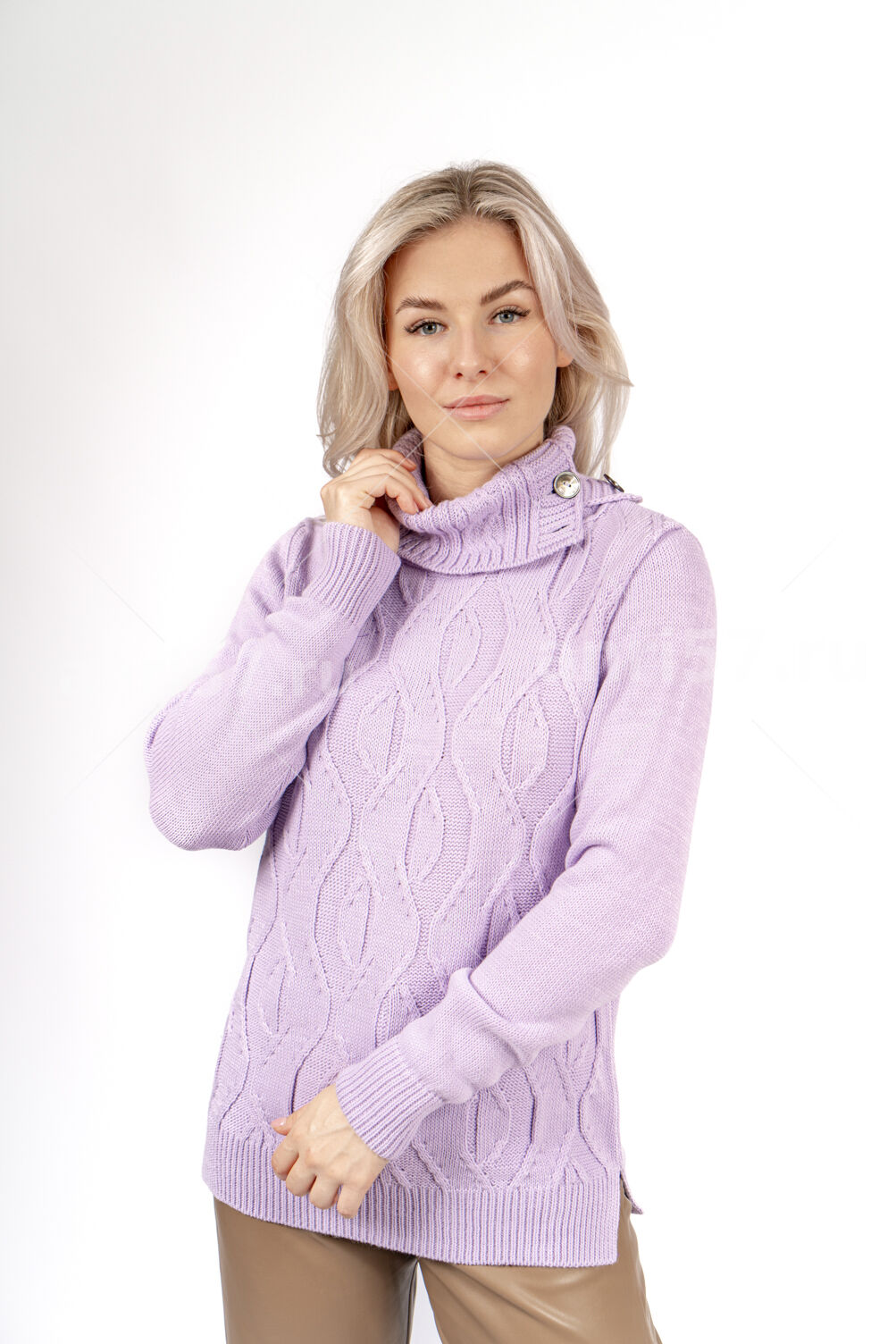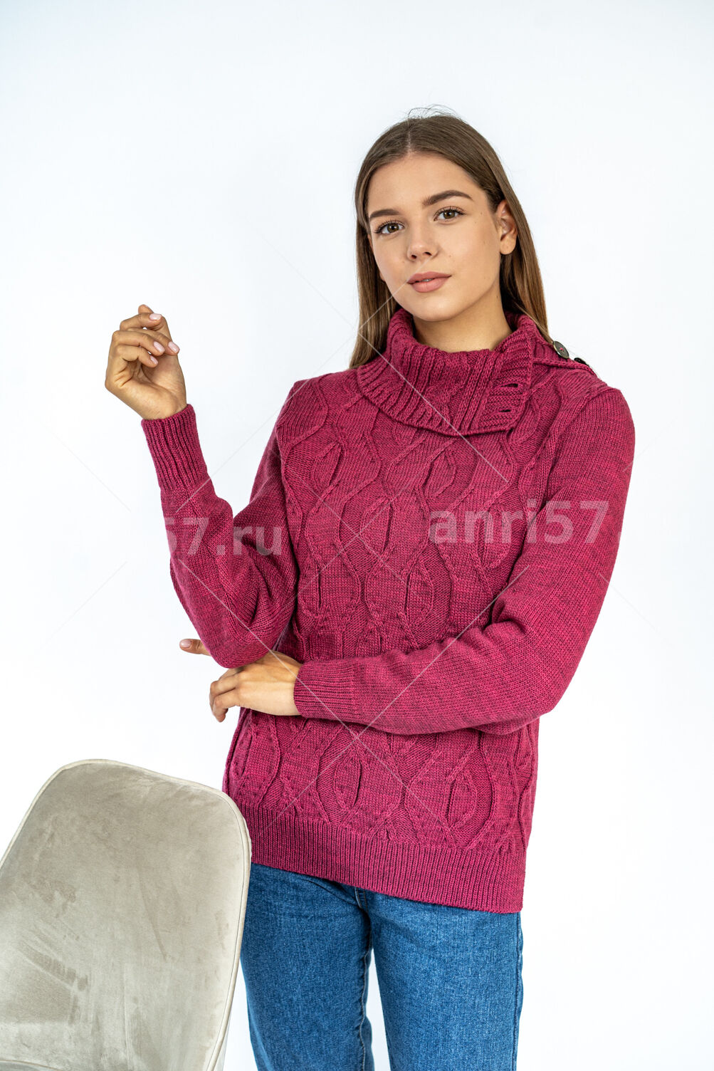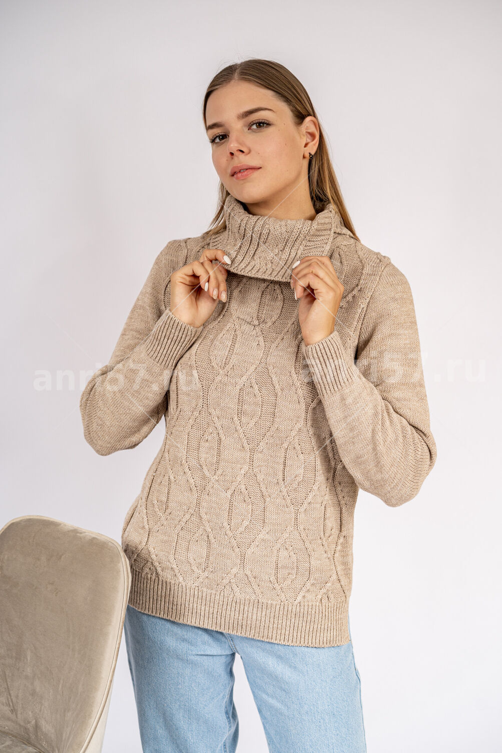 Джемпер женский ж0635х. Джемпер прямого силуэта из мягкого вязаного полотна. По центру полочки ажурный узор. Горловина округлой формы с обтачкой. Рукав втачной, на "резинке" по низу. В боковых швах изделия - разрезы на ширину резинки. Состав: 30% Шерсть, 70% ПАН.