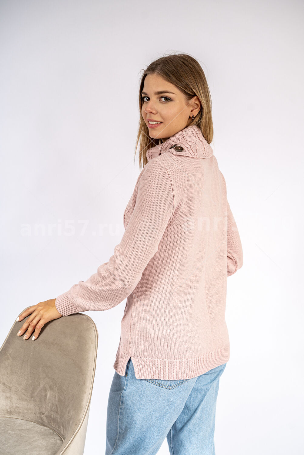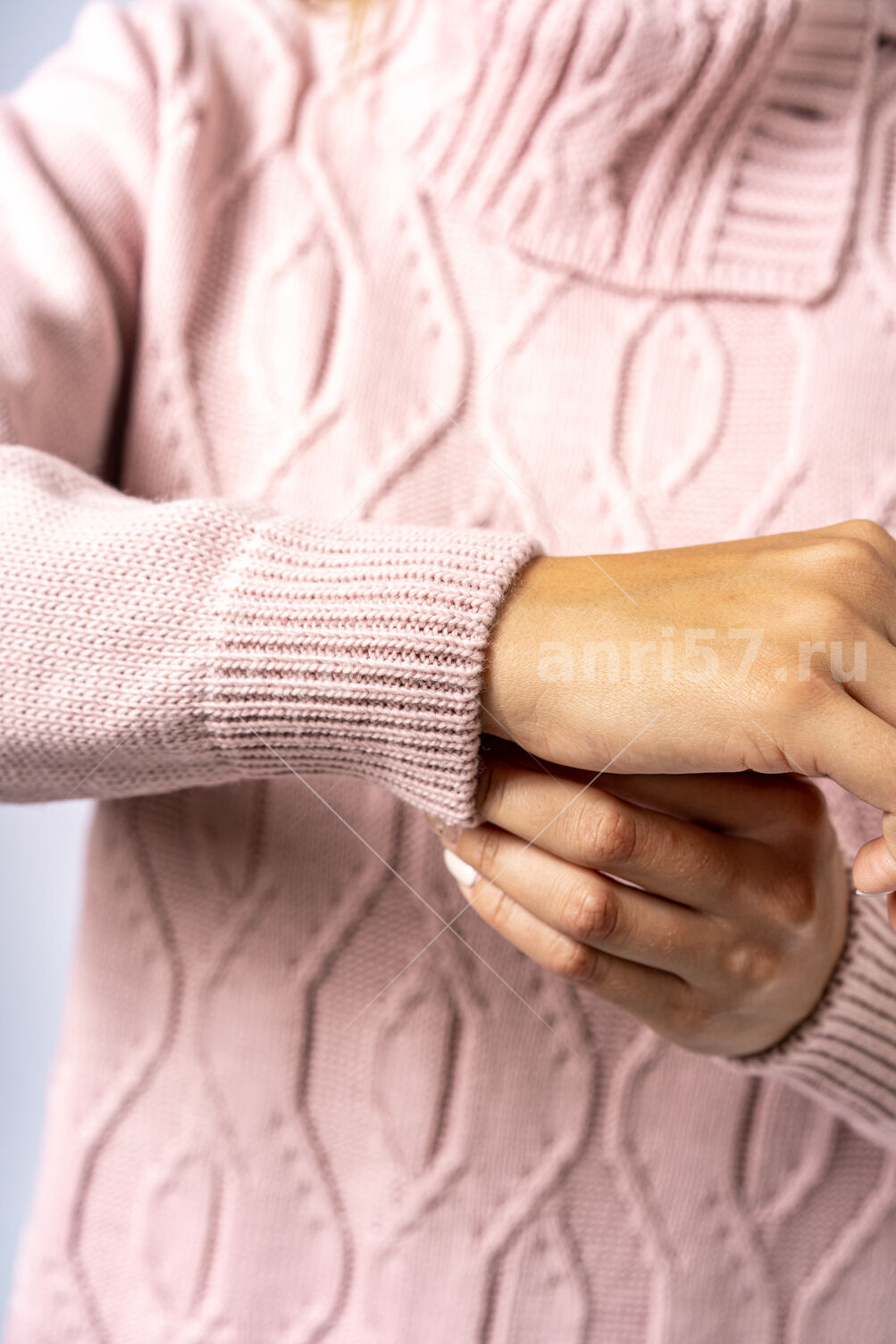 Джемпер женский ж0635х. Джемпер прямого силуэта из мягкого вязаного полотна. По центру полочки ажурный узор. Горловина округлой формы с обтачкой. Рукав втачной, на "резинке" по низу. В боковых швах изделия - разрезы на ширину резинки. Состав: 30% Шерсть, 70% ПАН.