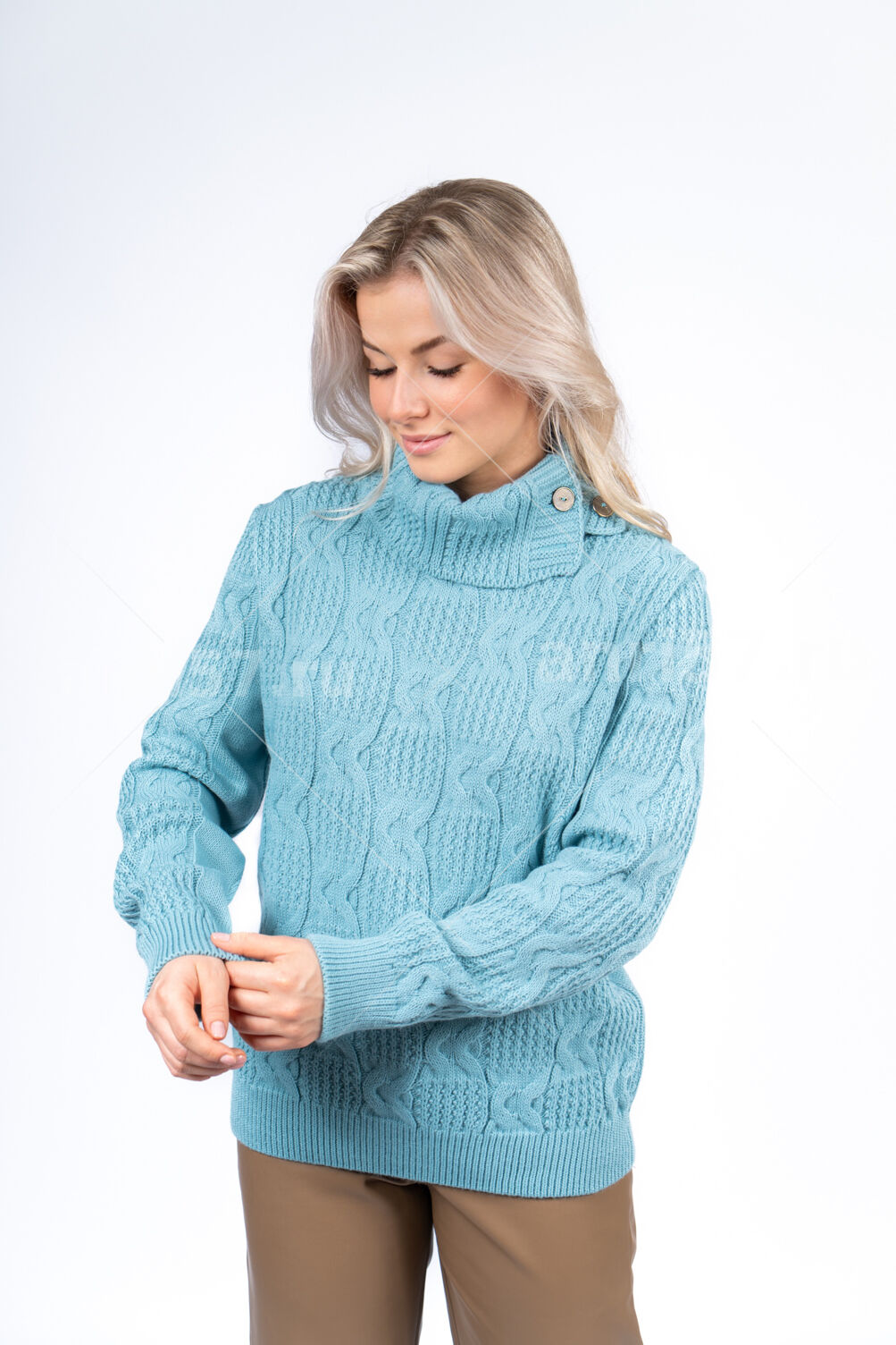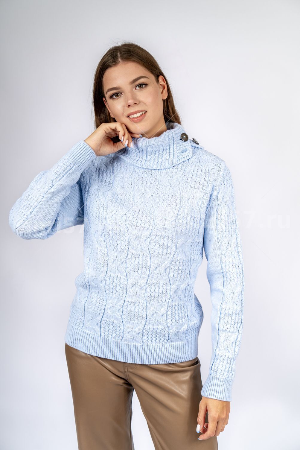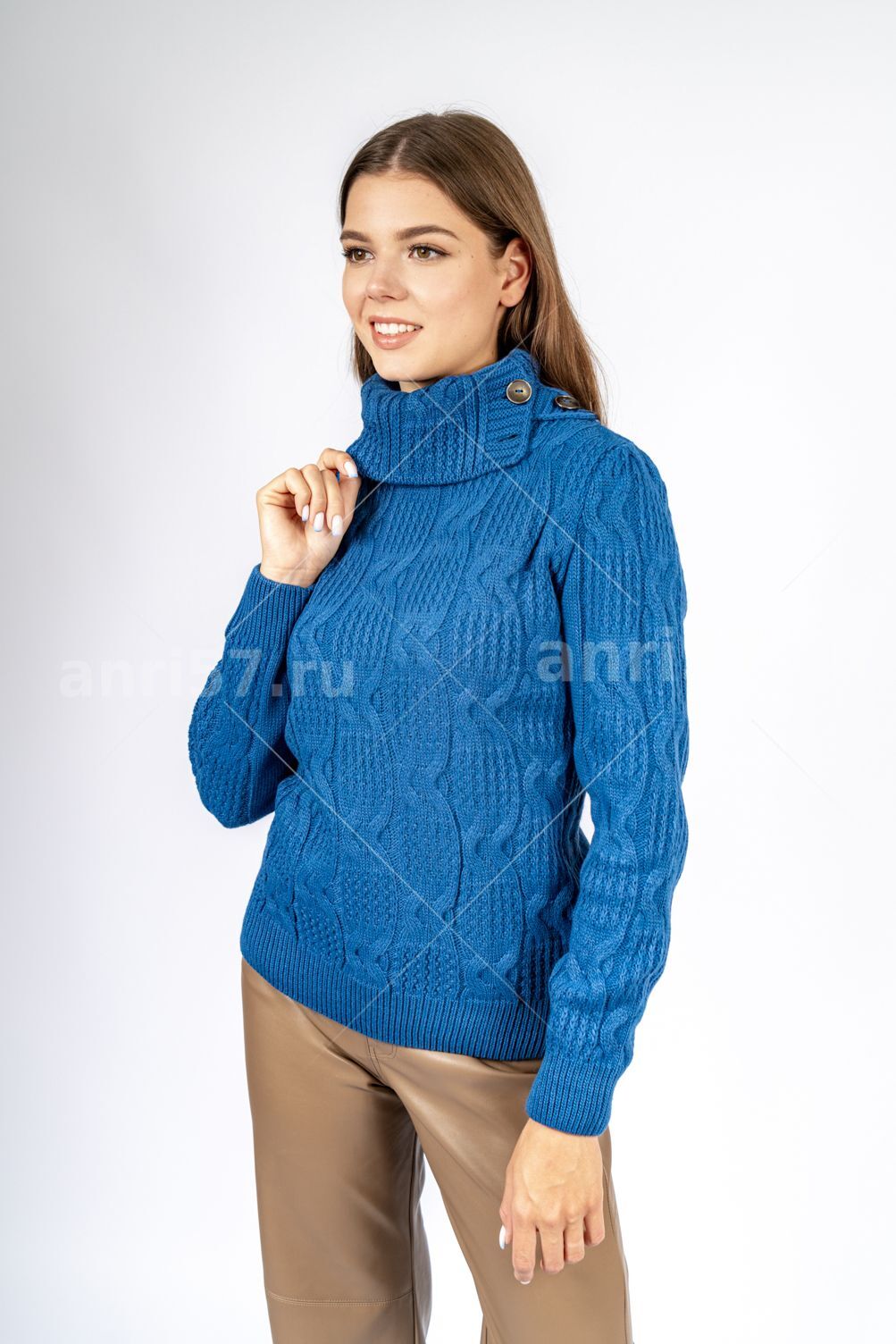 Джемпер женский ж0637х. Джемпер полуприлегающего силуэта из мягкого вязаного полотна. По полочке и центру рукава ажурный узор. Воротник хомут, застегивающийся на петли и пуговицы. Рукав втачной на резинке по низу. Состав: 30% Шерсть, 70% ПАН.