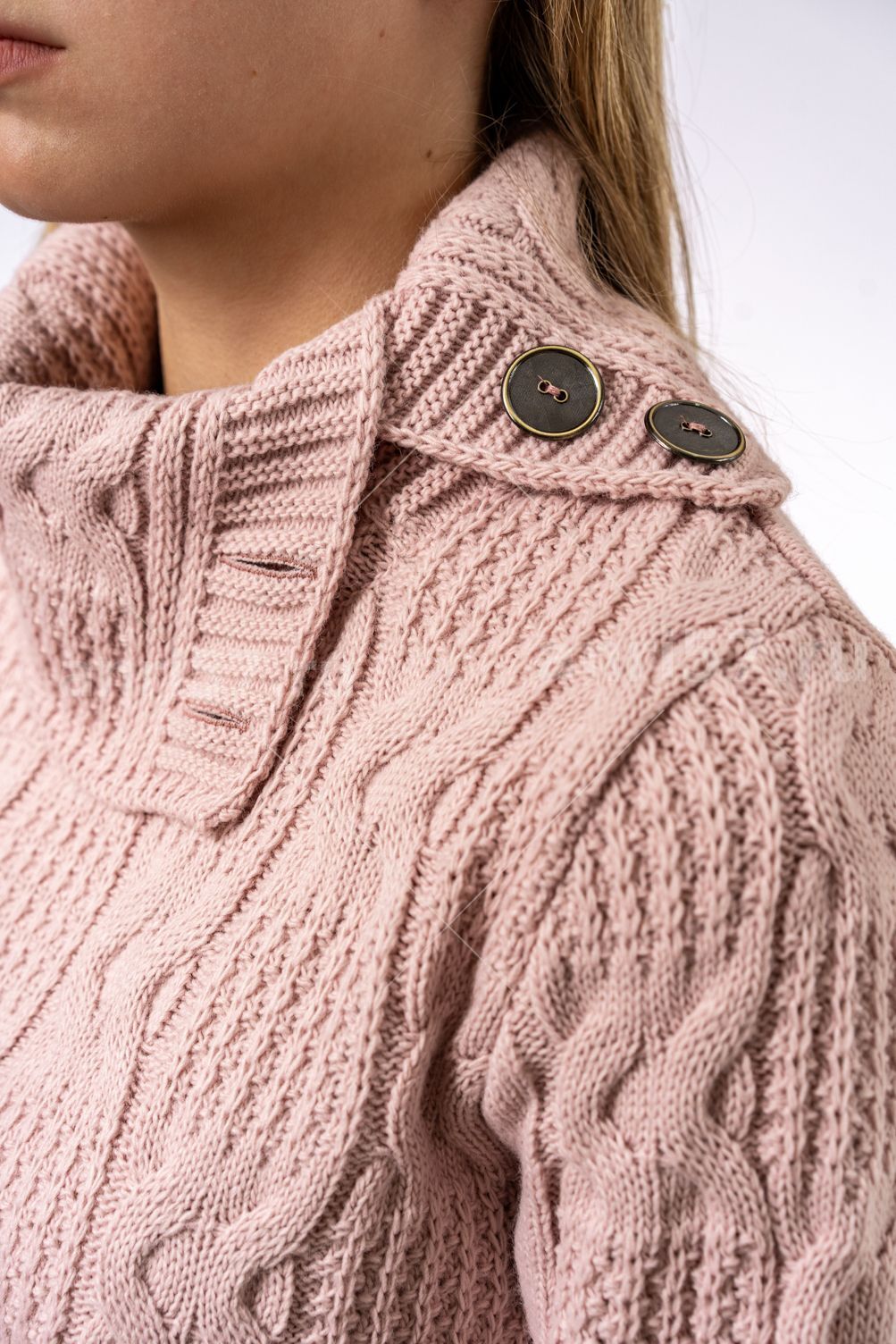 Джемпер женский ж0637х. Джемпер полуприлегающего силуэта из мягкого вязаного полотна. По полочке и центру рукава ажурный узор. Воротник хомут, застегивающийся на петли и пуговицы. Рукав втачной на резинке по низу. Состав: 30% Шерсть, 70% ПАН.