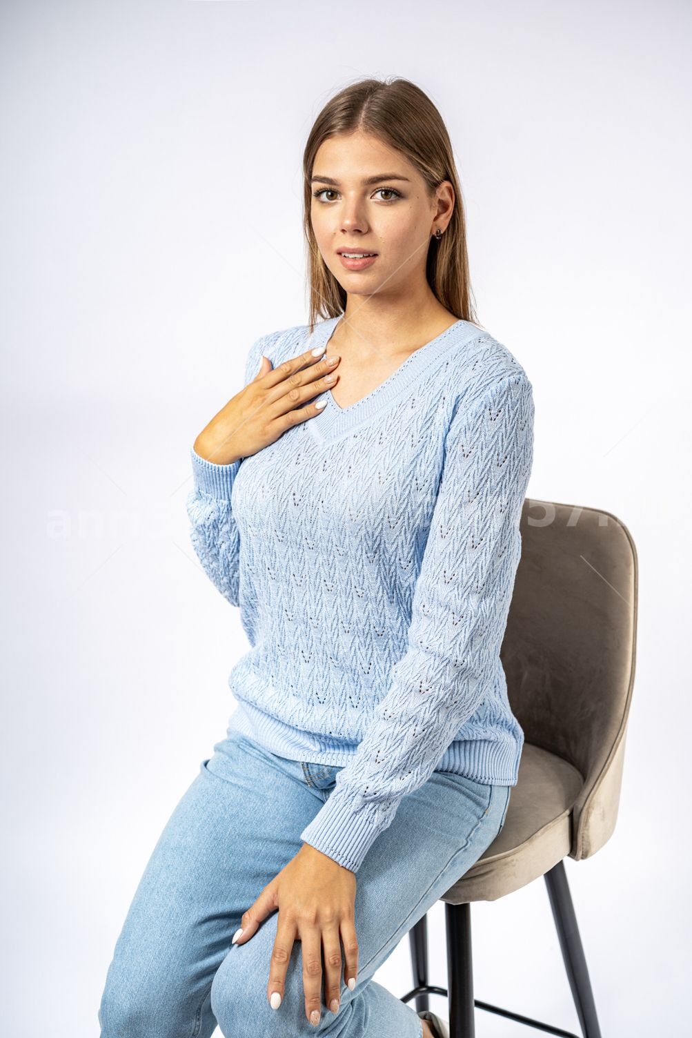 Джемпер женский ж0640. Джемпер полуприлегающего силуэта из ажурного вязаного полотна с добавлением хлопка. Низ и рукава на "резинке". Горловина на "мыс". Состав: 50% Хлопок, 50% ПАН.
