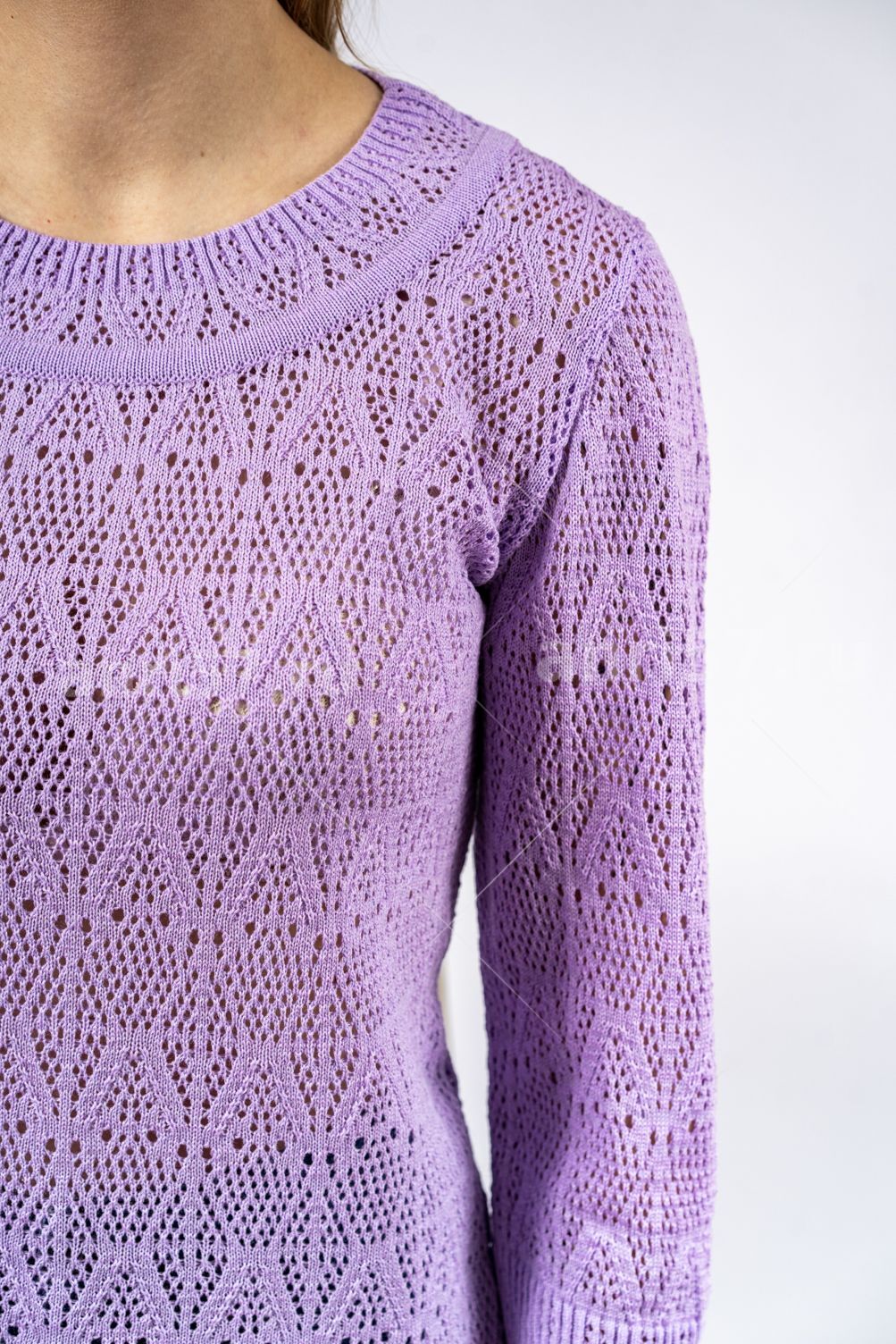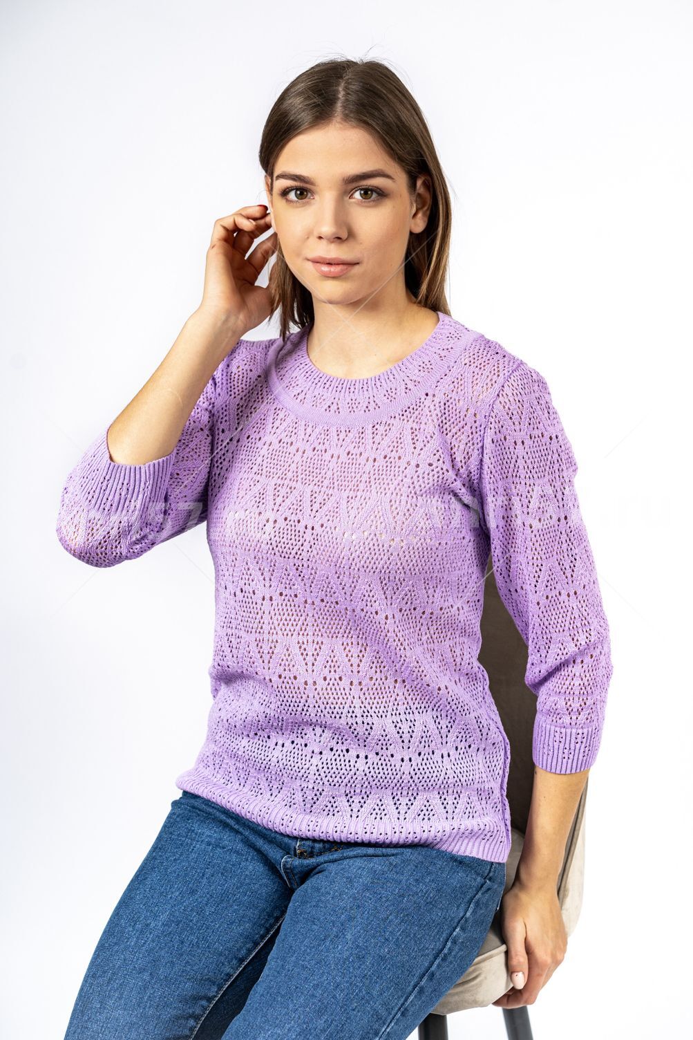 Джемпер женский ж0671. Джемпер полуприлегающего силуэта из ажурного вязаного полотна. Горловина округлой формы с обтачкой. Рукав втачной, укороченный, сетчатой фактуры. Низ изделия, низ рукава на "резинке". Состав: 50% Хлопок, 50% ПАН.