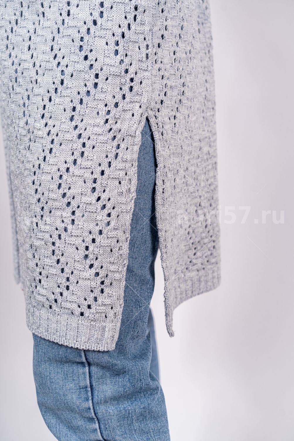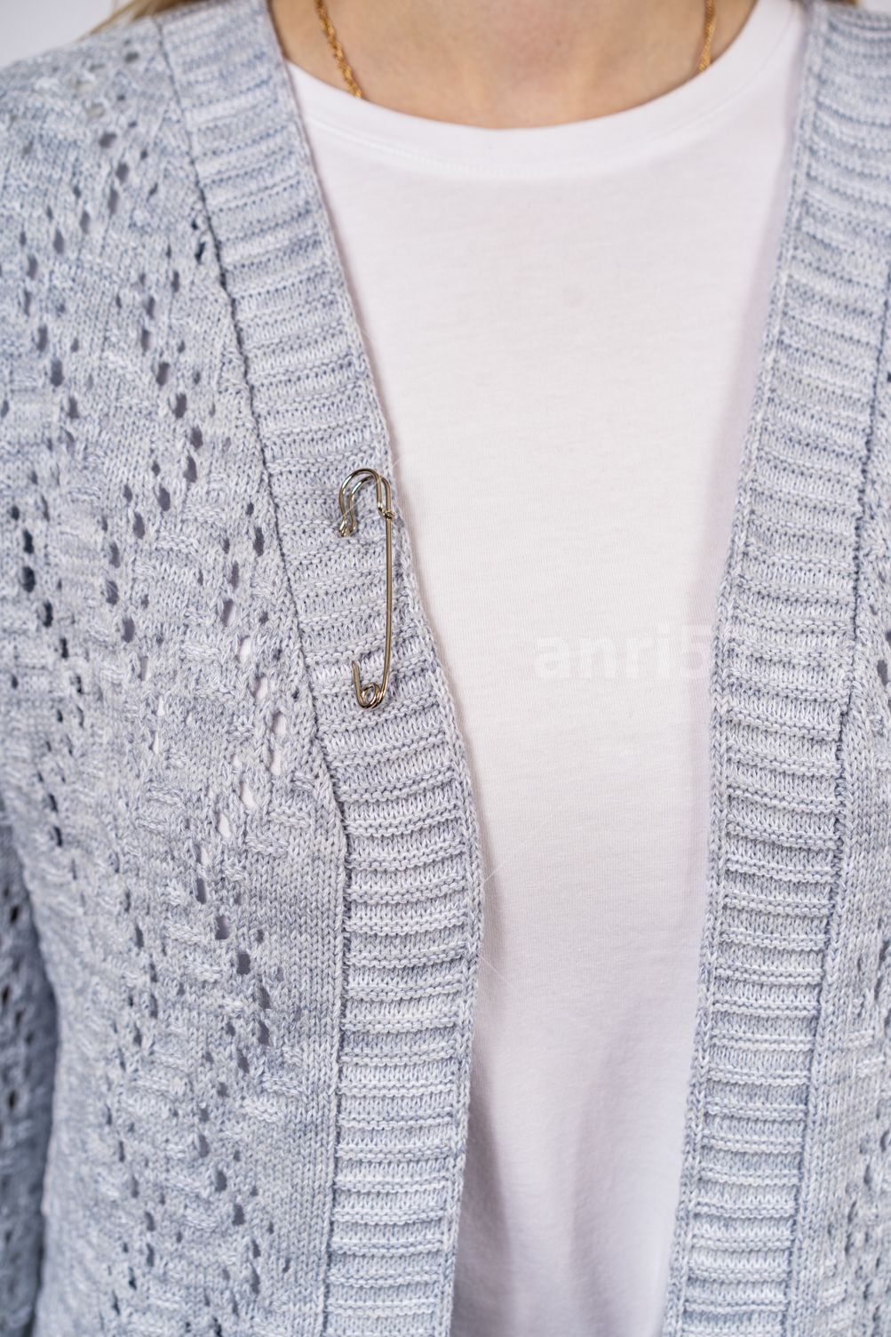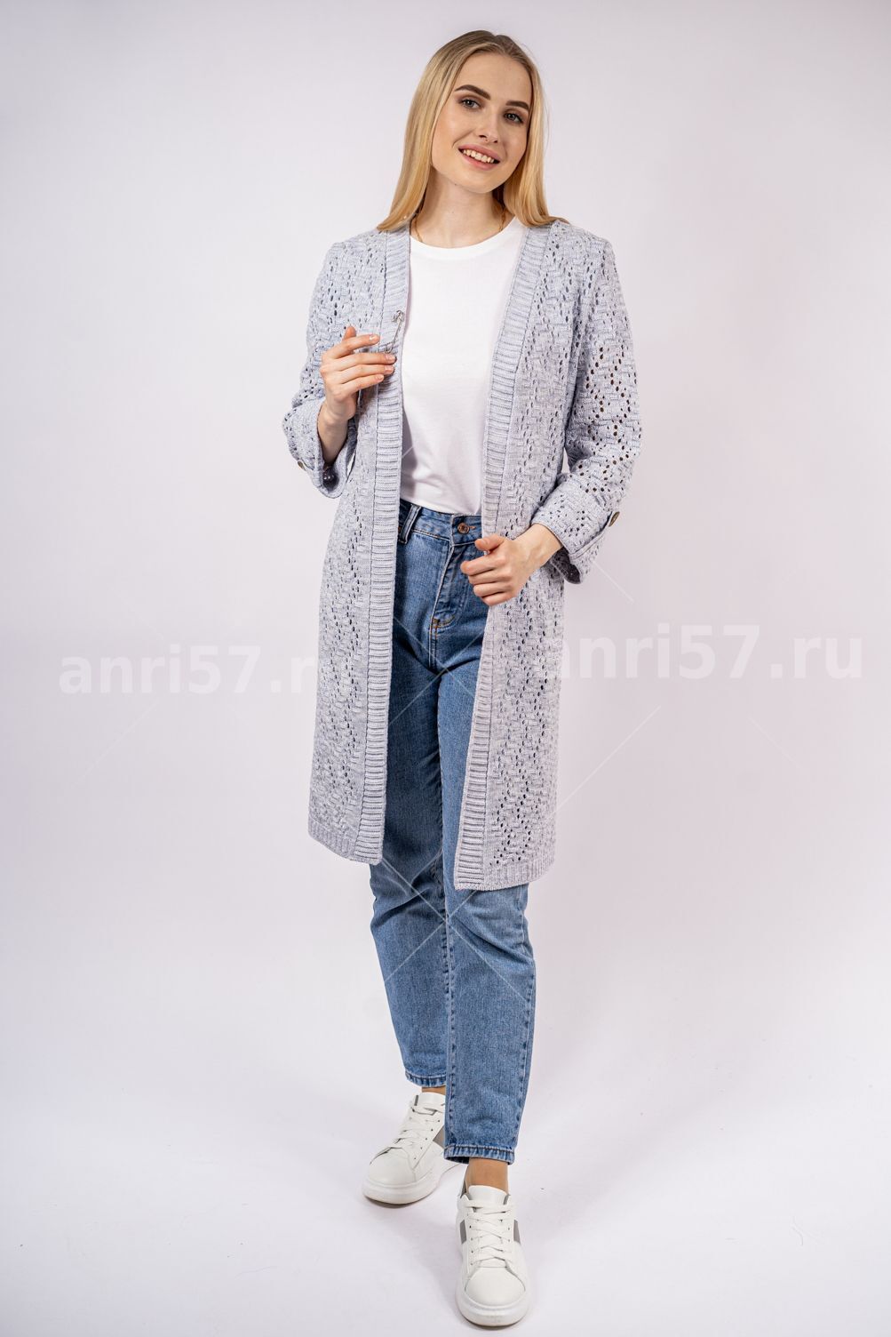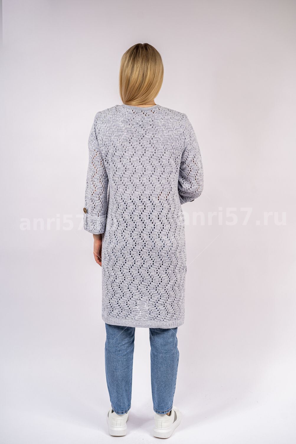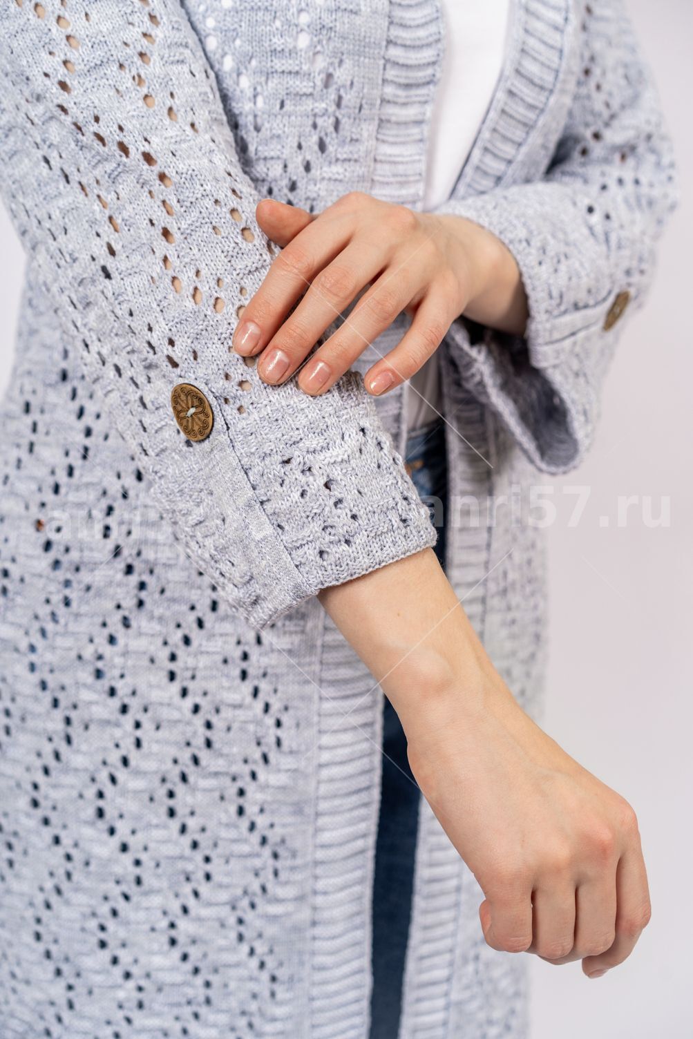Кардиган женский летний ж0354. Кардиган полуприлегающего силуэта из вязаного ажурного полотна. Застежка борта центральная, с вывязанными планками, на декоративную булавку. Рукав втачной, прямой 7/8, с отворотом по низу, пристегнутым на петлю из шнура и пуговицу. В боковых швах разрезы. Состав: 50% Хлопок 50% ПАН