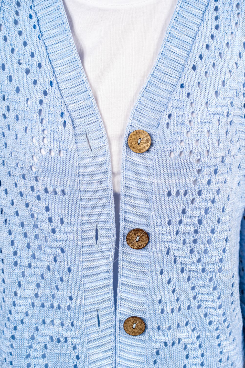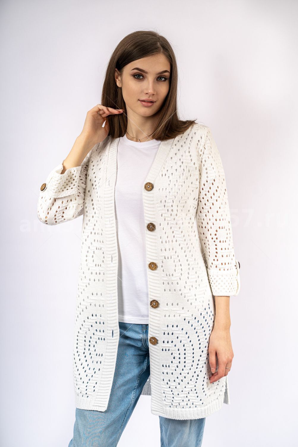 Кардиган женский ж0421. Кардиган полуприлегающего силуэта из ажурного вязаного полотна с центральной застежкой борта на петли и пуговицы. Горловина на "мыс". Рукав втачной с отворотом фиксированным на петлю и пуговицу. В боковых швах разрезы. Состав: 50% Хлопок, 50% ПАН.