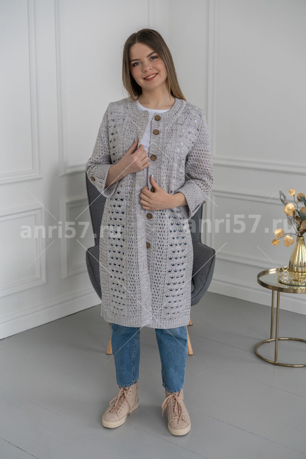 Кардиган-сетка женский ж0425. Кардиган полуприлегающего силуэта из сетчатого вязаного полотна разных фактур с центральной застежкой на петли и пуговицы. Горловина округлой формы с обтачкой. Рукав втачной с отворотом закрепленным на петлю и пуговицу. В боковых швах разрезы. Состав: 50% Хлопок, 50% ПАН.