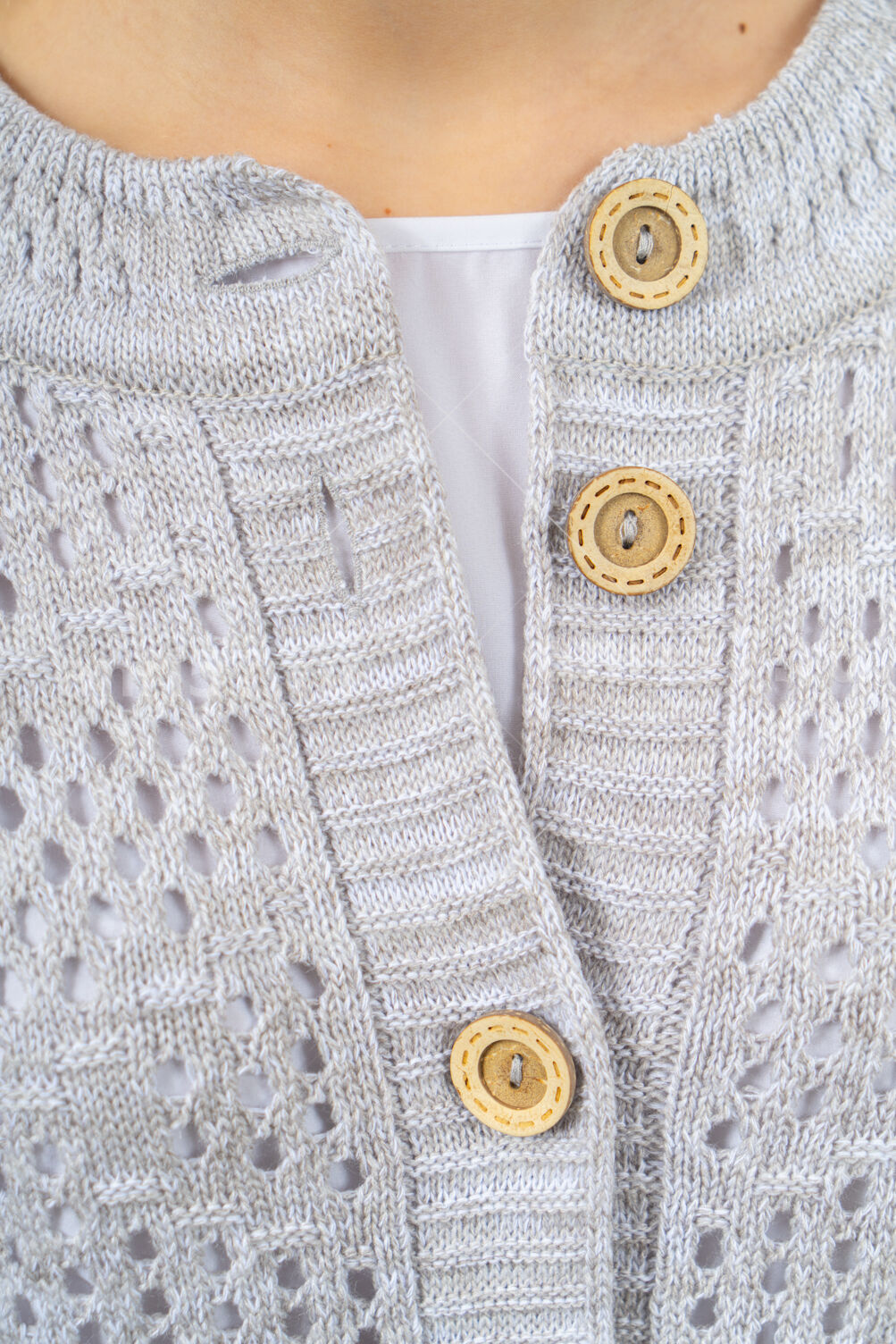 Кардиган женский ж0483. Кардиган полуприлегающего силуэта из ажурного вязаного полотна с центральной застежкой на планки с петлями и пуговицами. Горловина округлой формы с обтачкой. Рукав с отворотом пристегнутым на петлю и пуговицу. На полочках накладные карманы. В боковых швах разрезы. Состав: 50% Хлопок, 50% ПАН.