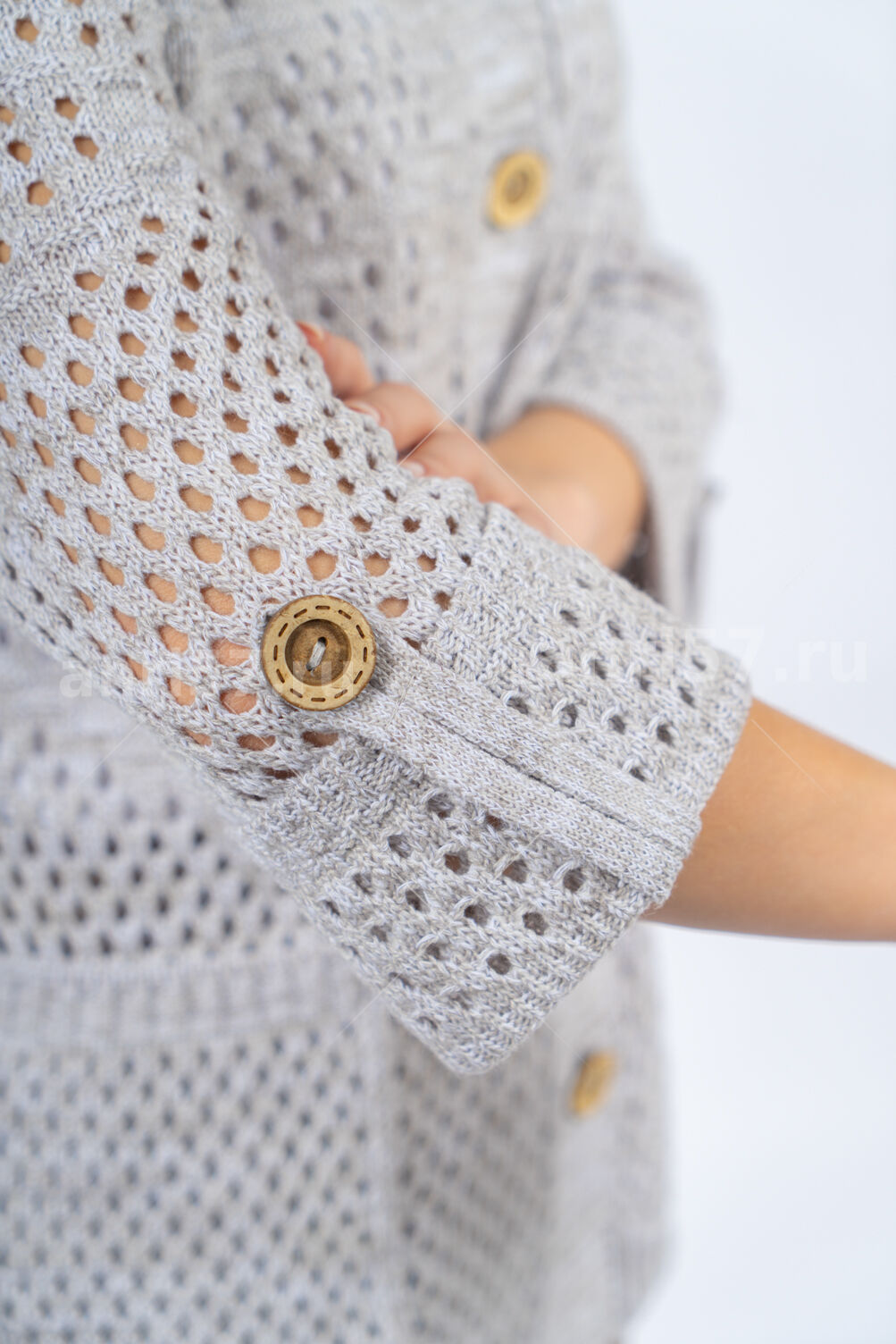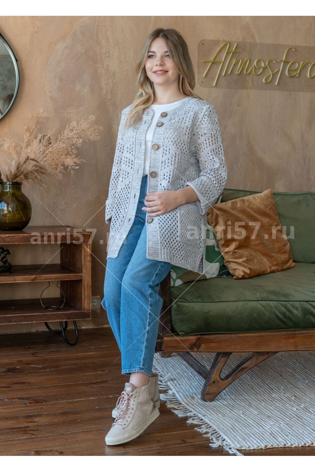 Кардиган женский ж0483. Кардиган полуприлегающего силуэта из ажурного вязаного полотна с центральной застежкой на планки с петлями и пуговицами. Горловина округлой формы с обтачкой. Рукав с отворотом пристегнутым на петлю и пуговицу. На полочках накладные карманы. В боковых швах разрезы. Состав: 50% Хлопок, 50% ПАН.