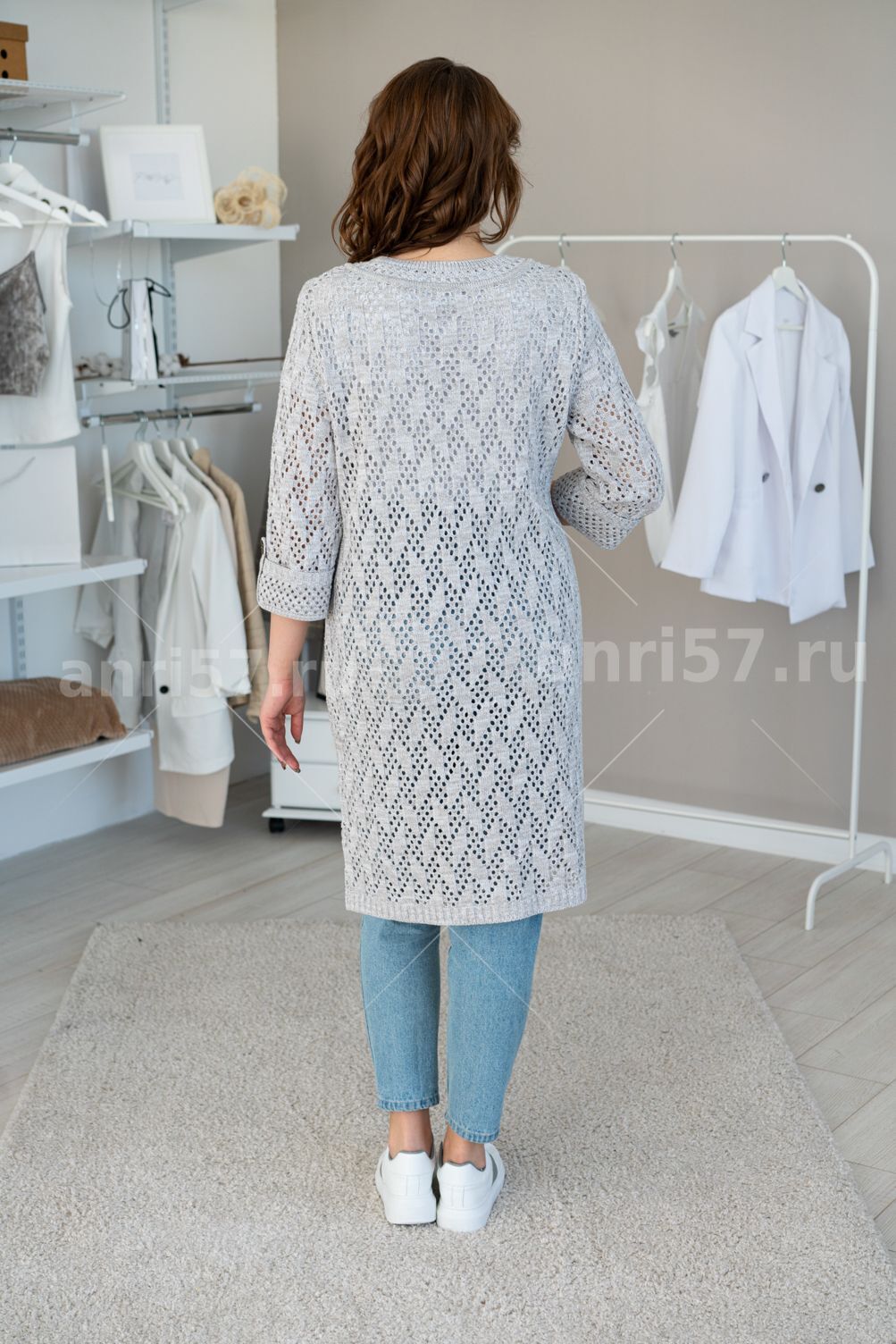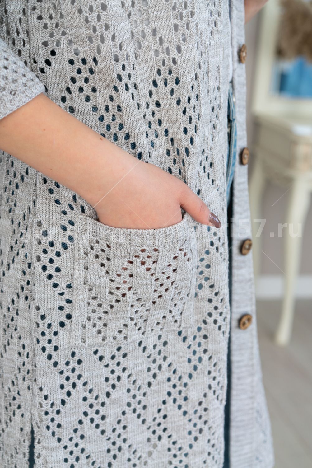 Кардиган женский ж0536. Кардиган полуприлегающего силуэта из ажурного вязаного полотна с центральной застежкой на петли и пуговицы. На полочках накладные карманы, в боковых швах разрезы. Горловина округлой формы с обтачкой. Рукав укороченный с манжетой, пристегивающейся на петлю и пуговицу. Состав: 50% Хлопок, 50% ПАН.