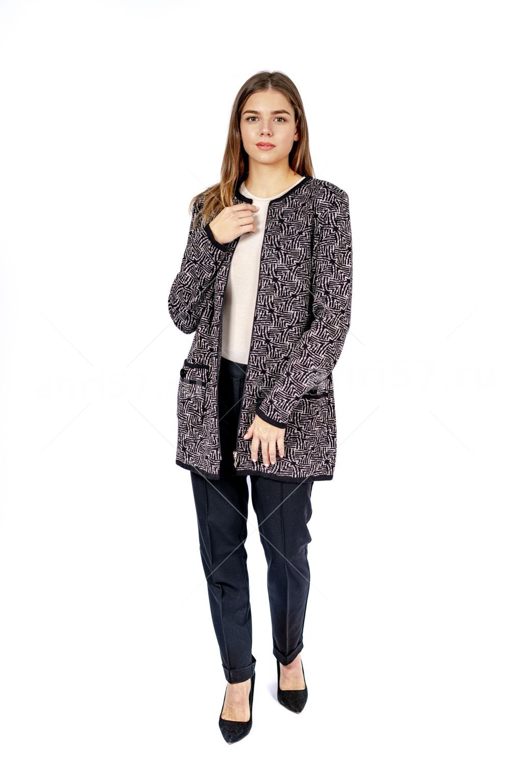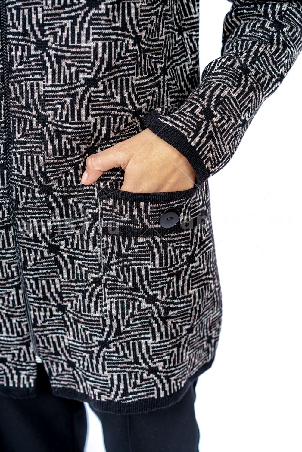 Кардиган женский ж0560. Кардиган полуприлегающего силуэта из двухцветного жаккардового вязаного полотна. Горловина округлой формы. Рукав втачной, прямой. На полочках накладные карманы с пуговицей. Центральная застежка на тесьму "молния". Состав: 30% Шерсть, 70% ПАН.