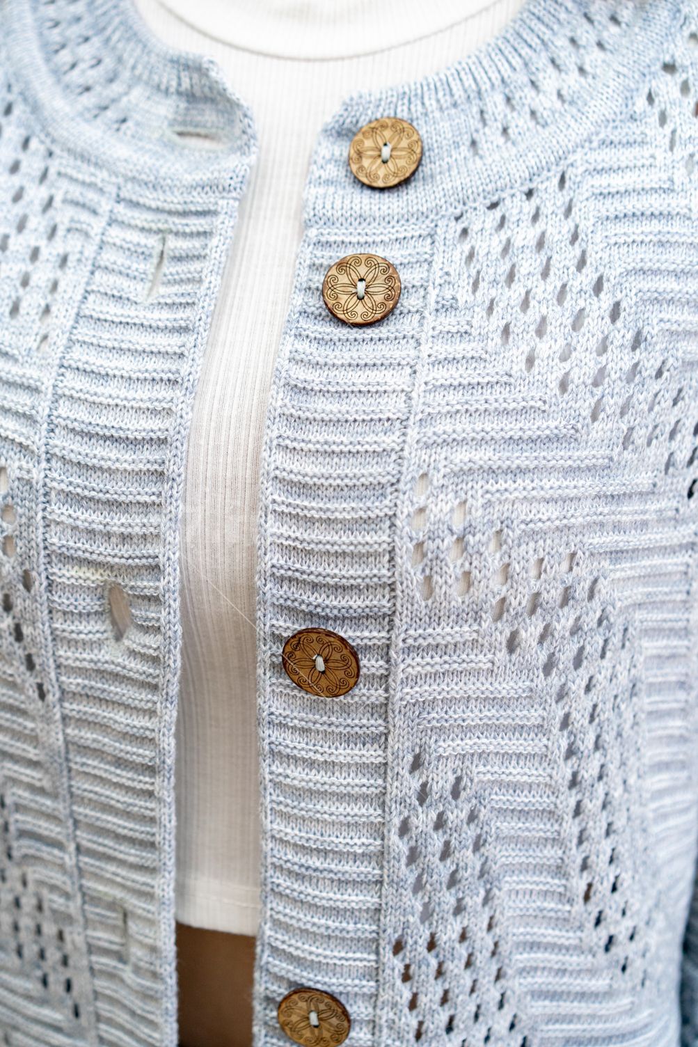 Кардиган женский ж0603.Кардиган полуприлегающего силуэта из ажурного вязаного полотна с центральной застежкой на петли и пуговицы.Горловина округлой формы, рукав втачной, прямой, с отворотом на петлю и пуговицу, укороченный. На полочках карманы.В боковых швах - шлицы.Состав:50% Хлопок, 50% ПАН.
