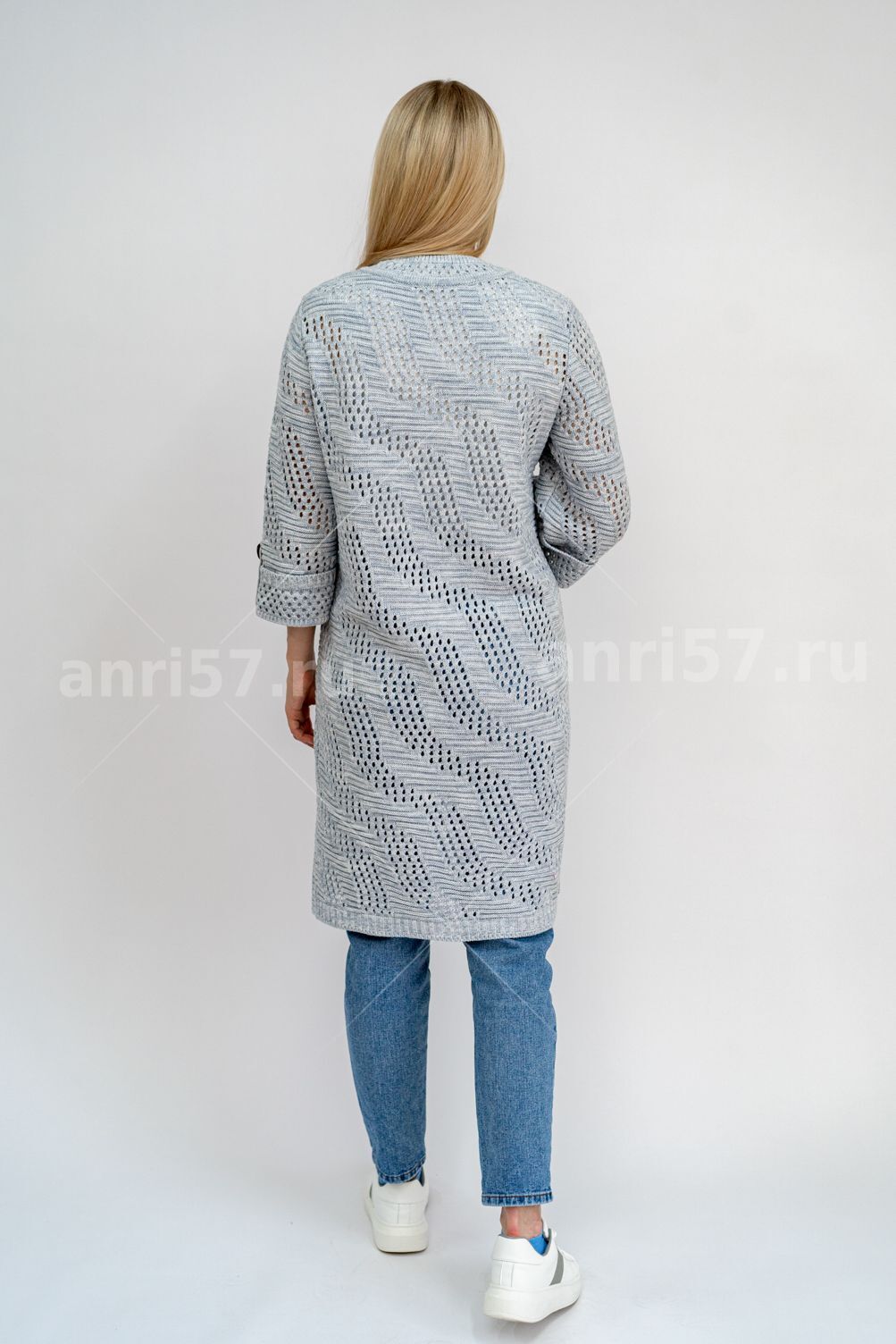 Кардиган женский ж0603.Кардиган полуприлегающего силуэта из ажурного вязаного полотна с центральной застежкой на петли и пуговицы.Горловина округлой формы, рукав втачной, прямой, с отворотом на петлю и пуговицу, укороченный. На полочках карманы.В боковых швах - шлицы.Состав:50% Хлопок, 50% ПАН.