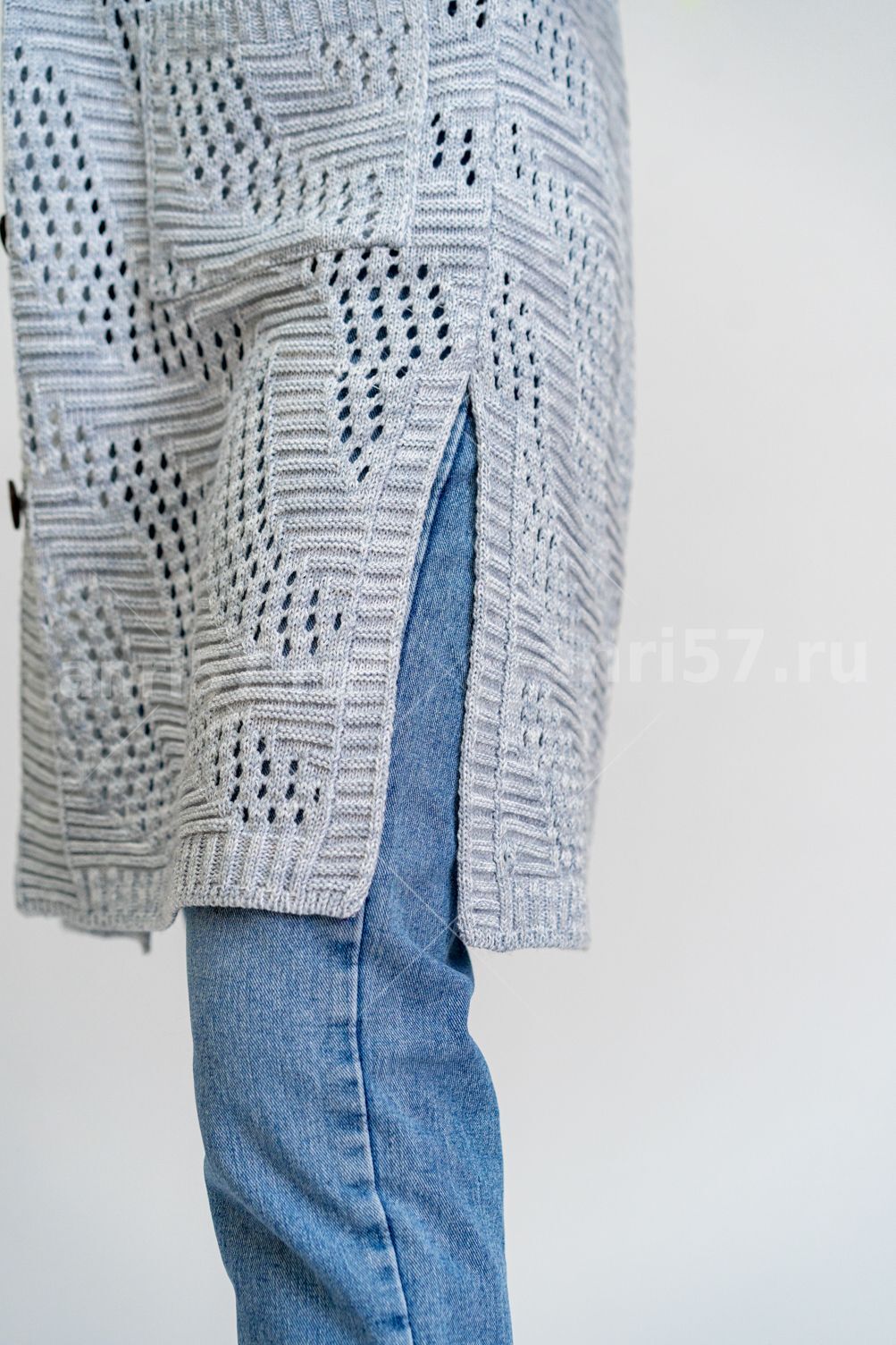 Кардиган женский ж0603.Кардиган полуприлегающего силуэта из ажурного вязаного полотна с центральной застежкой на петли и пуговицы.Горловина округлой формы, рукав втачной, прямой, с отворотом на петлю и пуговицу, укороченный. На полочках карманы.В боковых швах - шлицы.Состав:50% Хлопок, 50% ПАН.