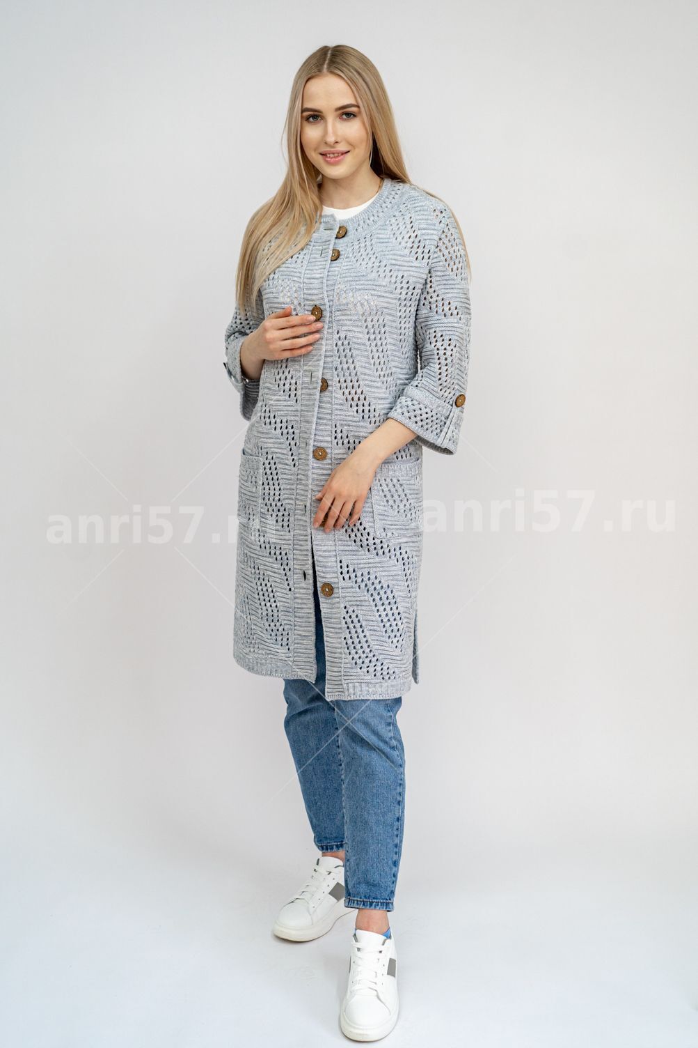 Кардиган женский ж0603.Кардиган полуприлегающего силуэта из ажурного вязаного полотна с центральной застежкой на петли и пуговицы.Горловина округлой формы, рукав втачной, прямой, с отворотом на петлю и пуговицу, укороченный. На полочках карманы.В боковых швах - шлицы.Состав:50% Хлопок, 50% ПАН.