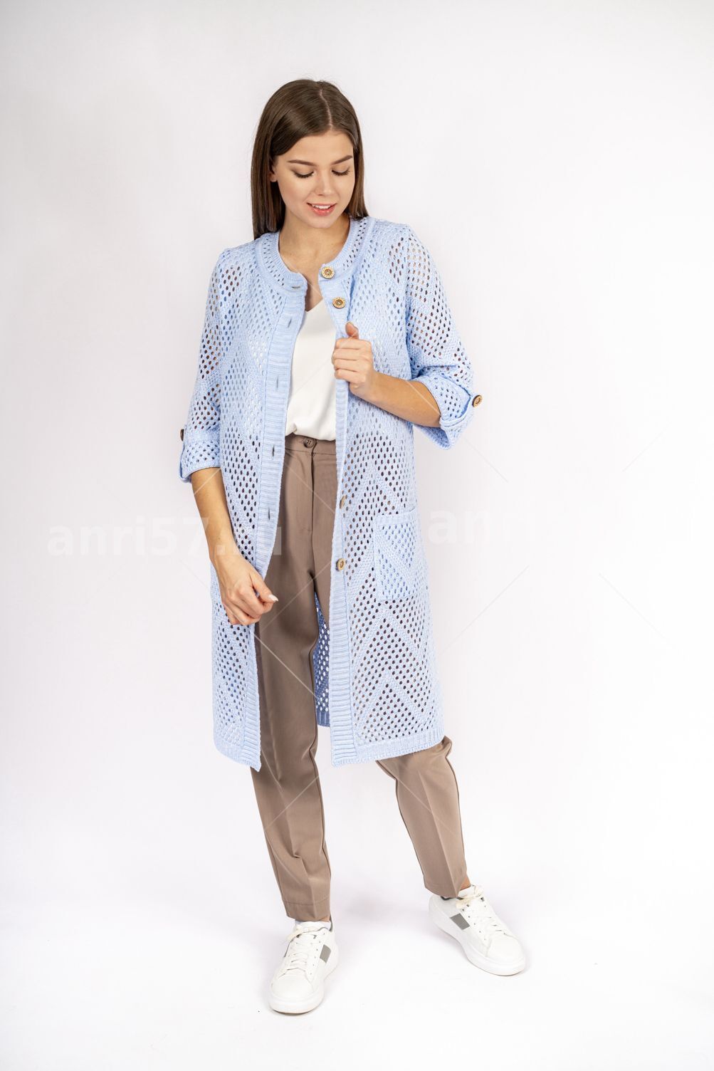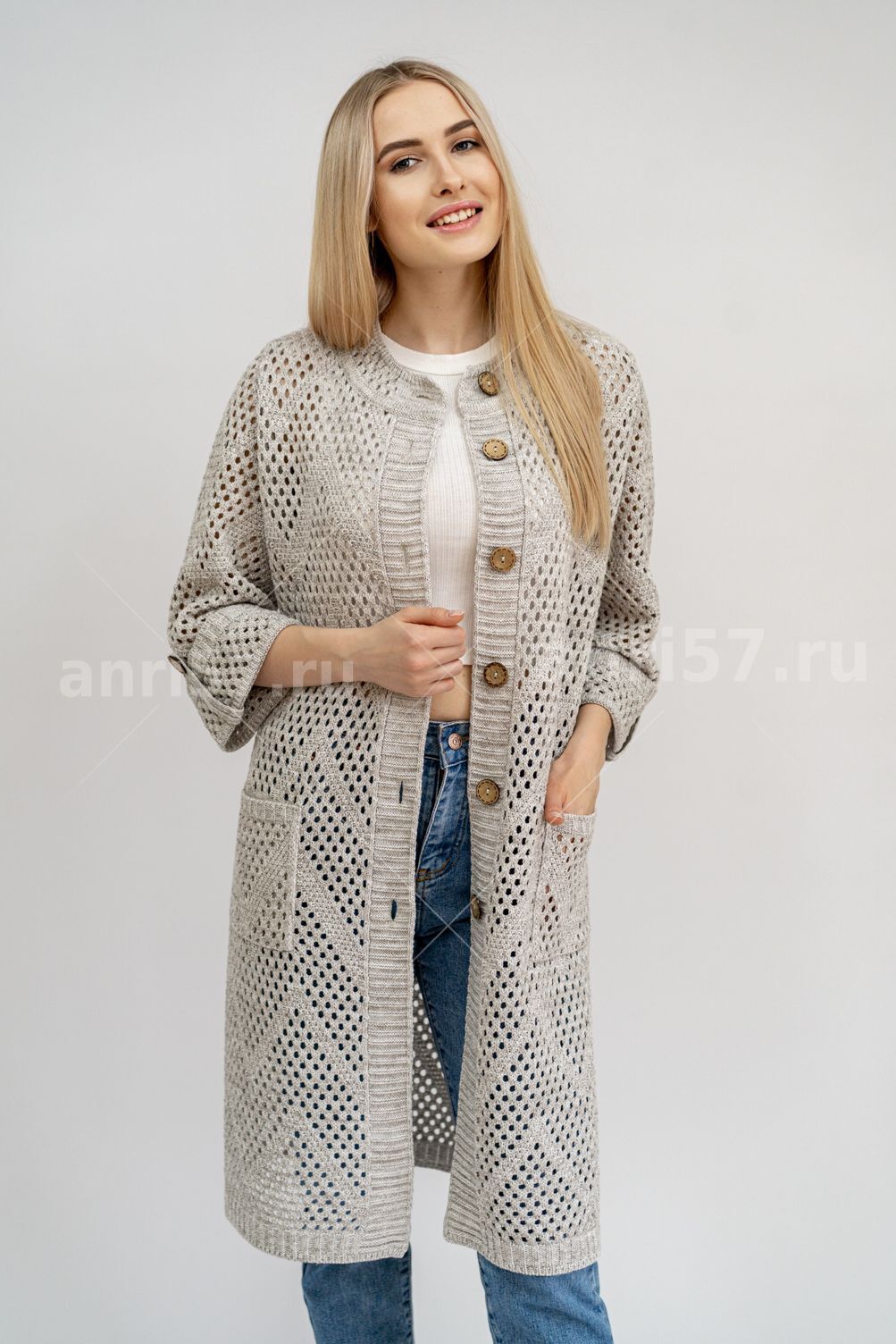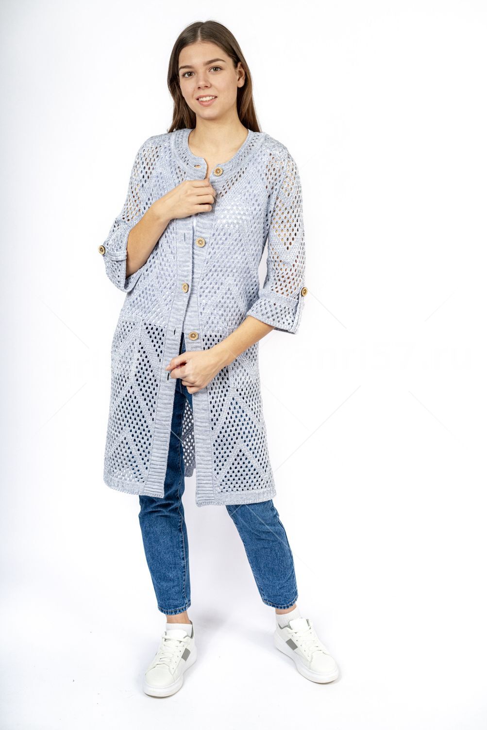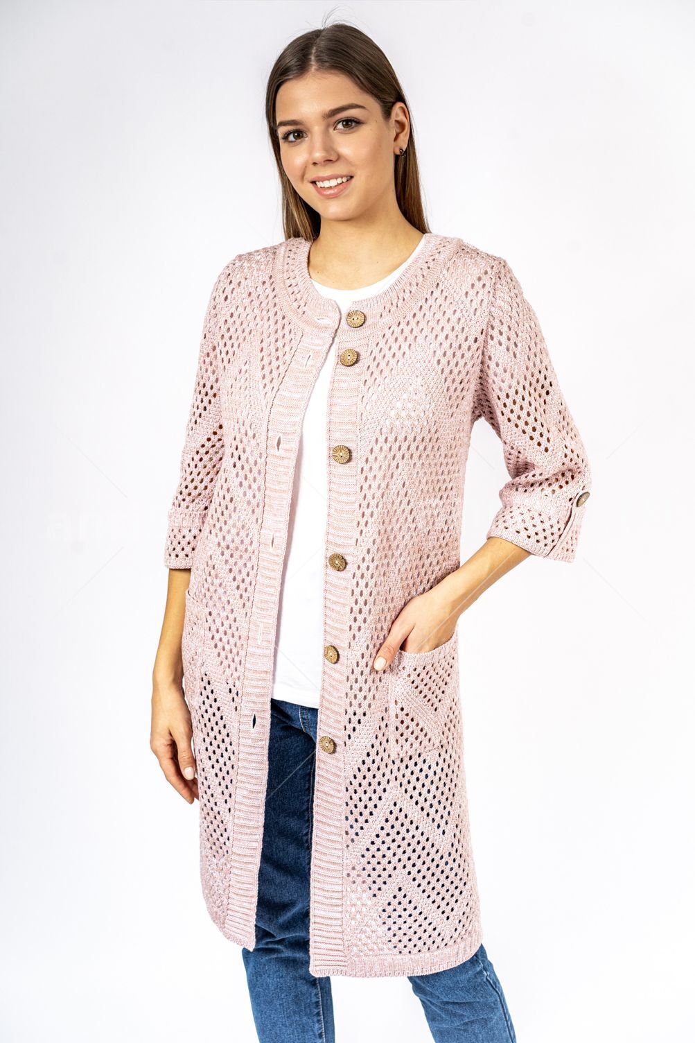 Кардиган женский ж0610.Кардиган полуприлегающего силуэта из ажурного вязаного полотна с центральной застежкой на петли и пуговицы.Горловина округлой формы, рукав втачной, прямой, с отворотом, укороченный. На полочках карманы.В боковых швах - шлицы.Состав:50% Хлопок, 50% ПАН.