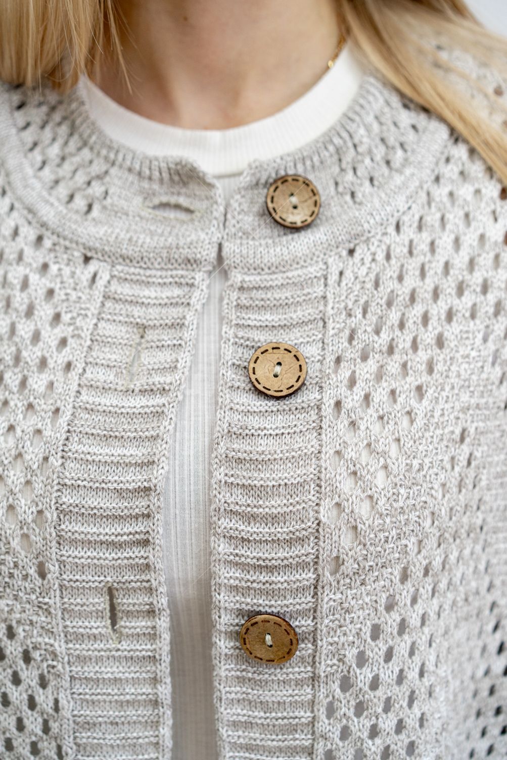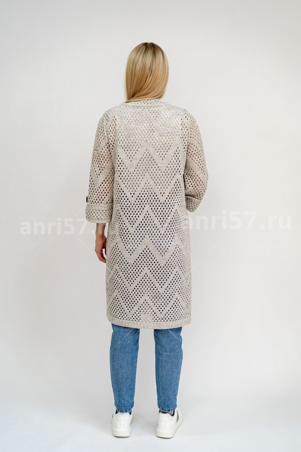 Кардиган женский ж0610.Кардиган полуприлегающего силуэта из ажурного вязаного полотна с центральной застежкой на петли и пуговицы.Горловина округлой формы, рукав втачной, прямой, с отворотом, укороченный. На полочках карманы.В боковых швах - шлицы.Состав:50% Хлопок, 50% ПАН.