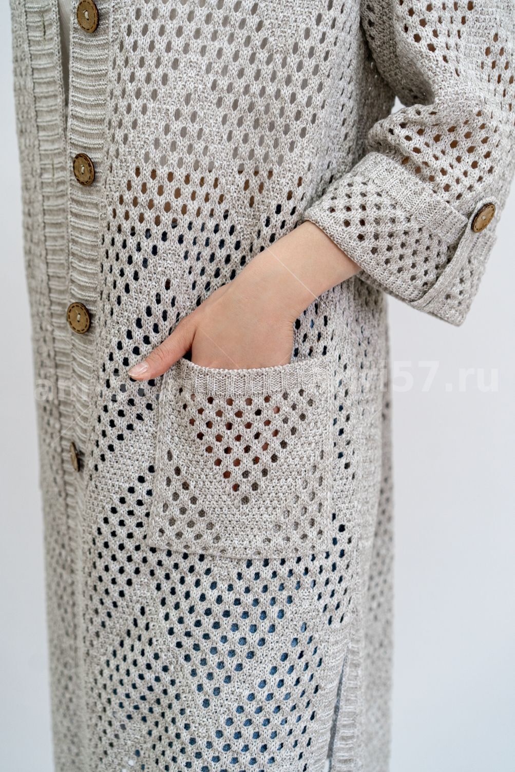 Кардиган женский ж0610.Кардиган полуприлегающего силуэта из ажурного вязаного полотна с центральной застежкой на петли и пуговицы.Горловина округлой формы, рукав втачной, прямой, с отворотом, укороченный. На полочках карманы.В боковых швах - шлицы.Состав:50% Хлопок, 50% ПАН.