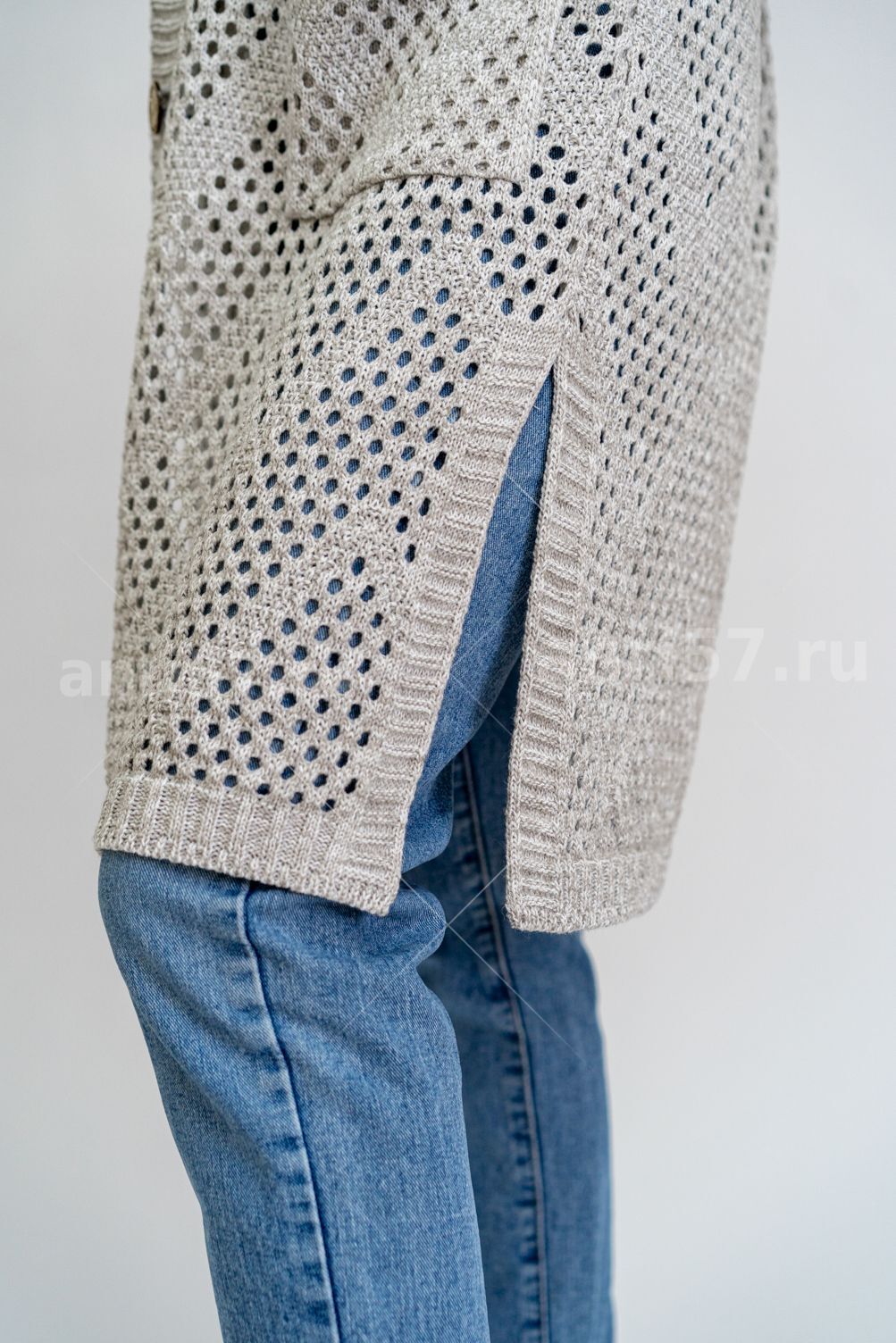 Кардиган женский ж0610.Кардиган полуприлегающего силуэта из ажурного вязаного полотна с центральной застежкой на петли и пуговицы.Горловина округлой формы, рукав втачной, прямой, с отворотом, укороченный. На полочках карманы.В боковых швах - шлицы.Состав:50% Хлопок, 50% ПАН.