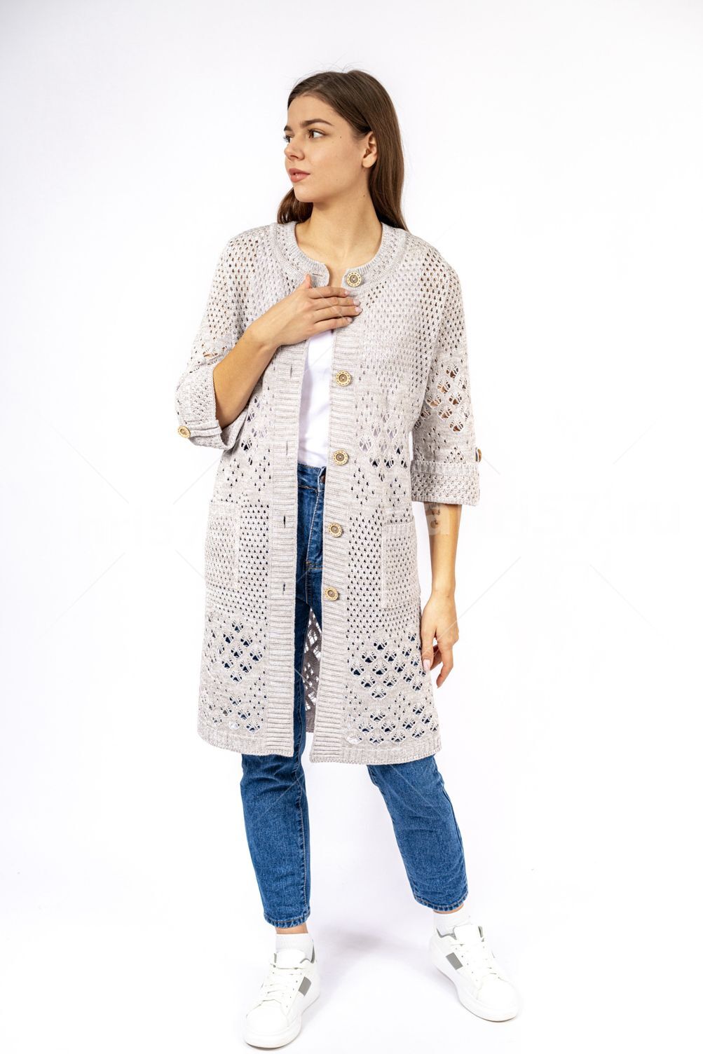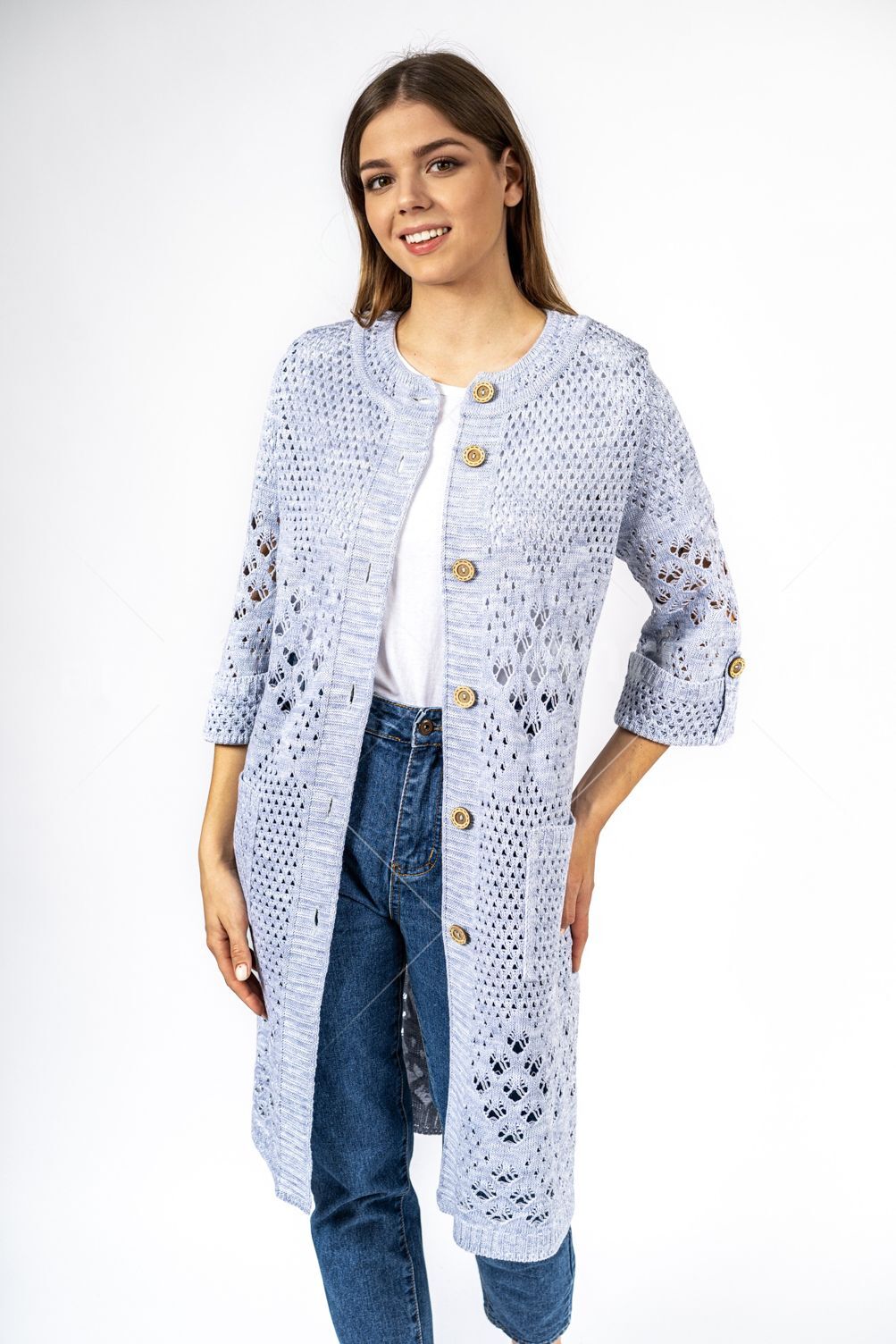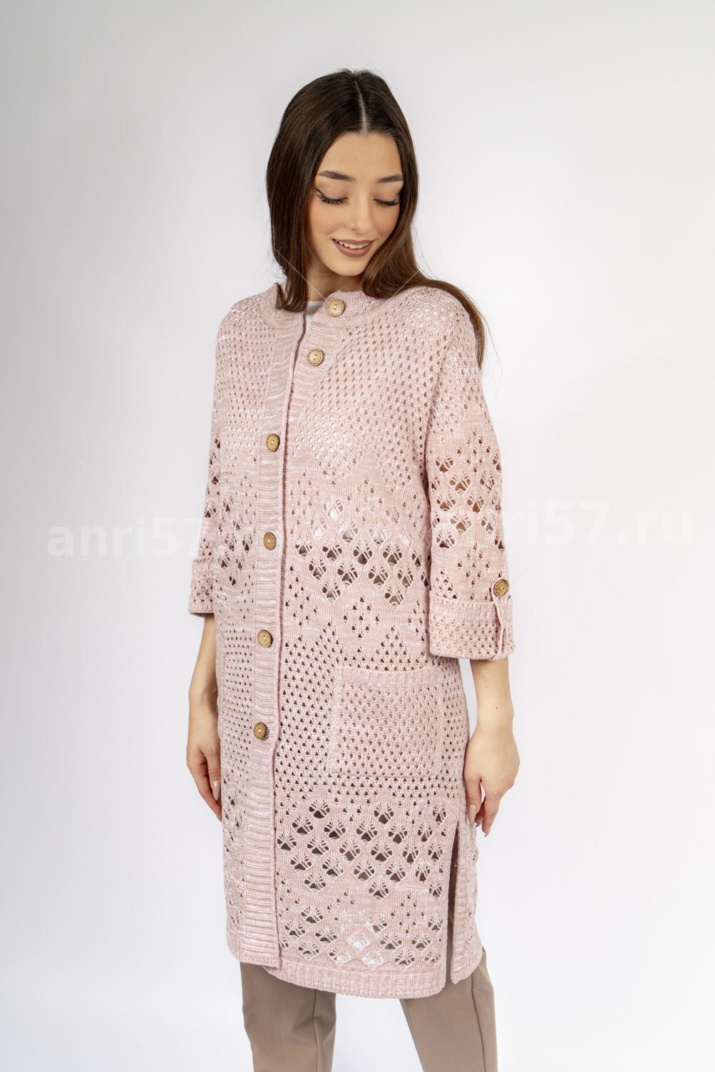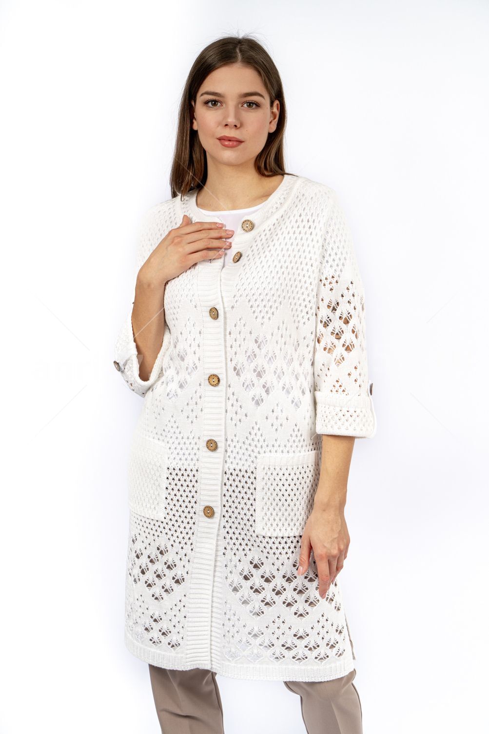 Кардиган женский ж0666.Кардиган полуприлегающего силуэта из ажурного вязаного полотна с центральной застежкой на петли и пуговицы.Горловина округлой формы, рукав втачной, прямой, с отворотом на петлю и пуговицу, укороченный. На полочках карманы.В боковых швах - шлицы.Состав:50% Хлопок, 50% ПАН.