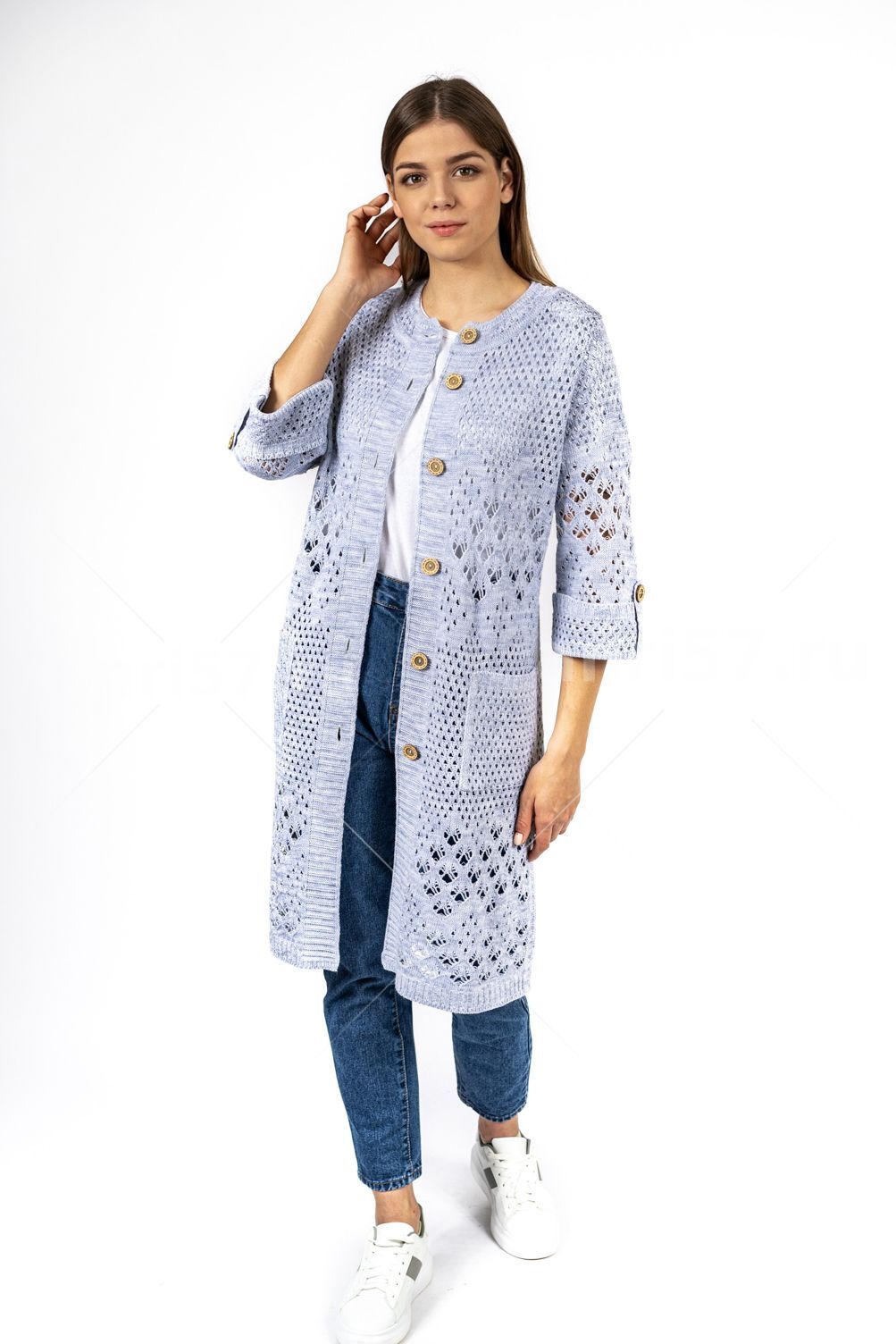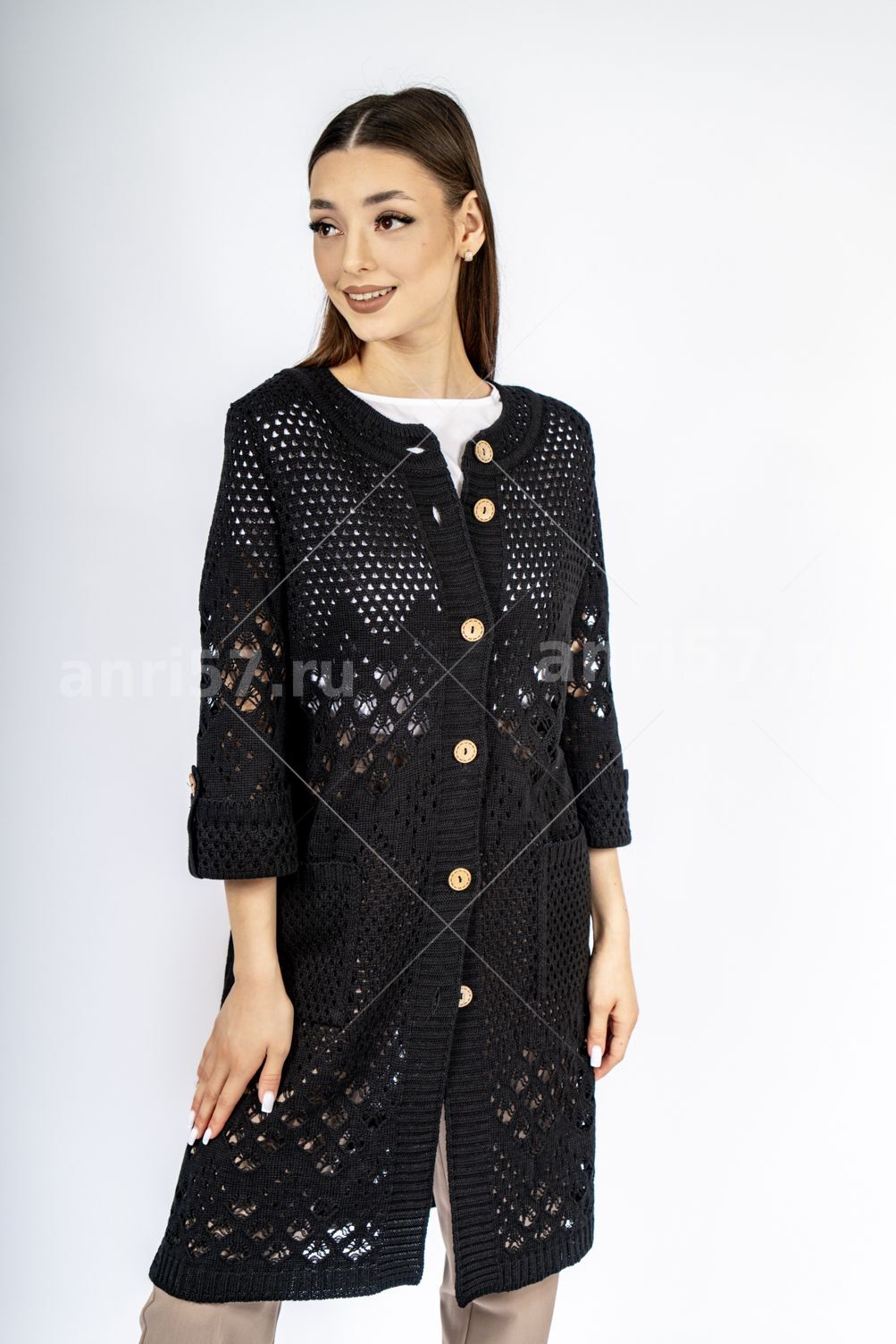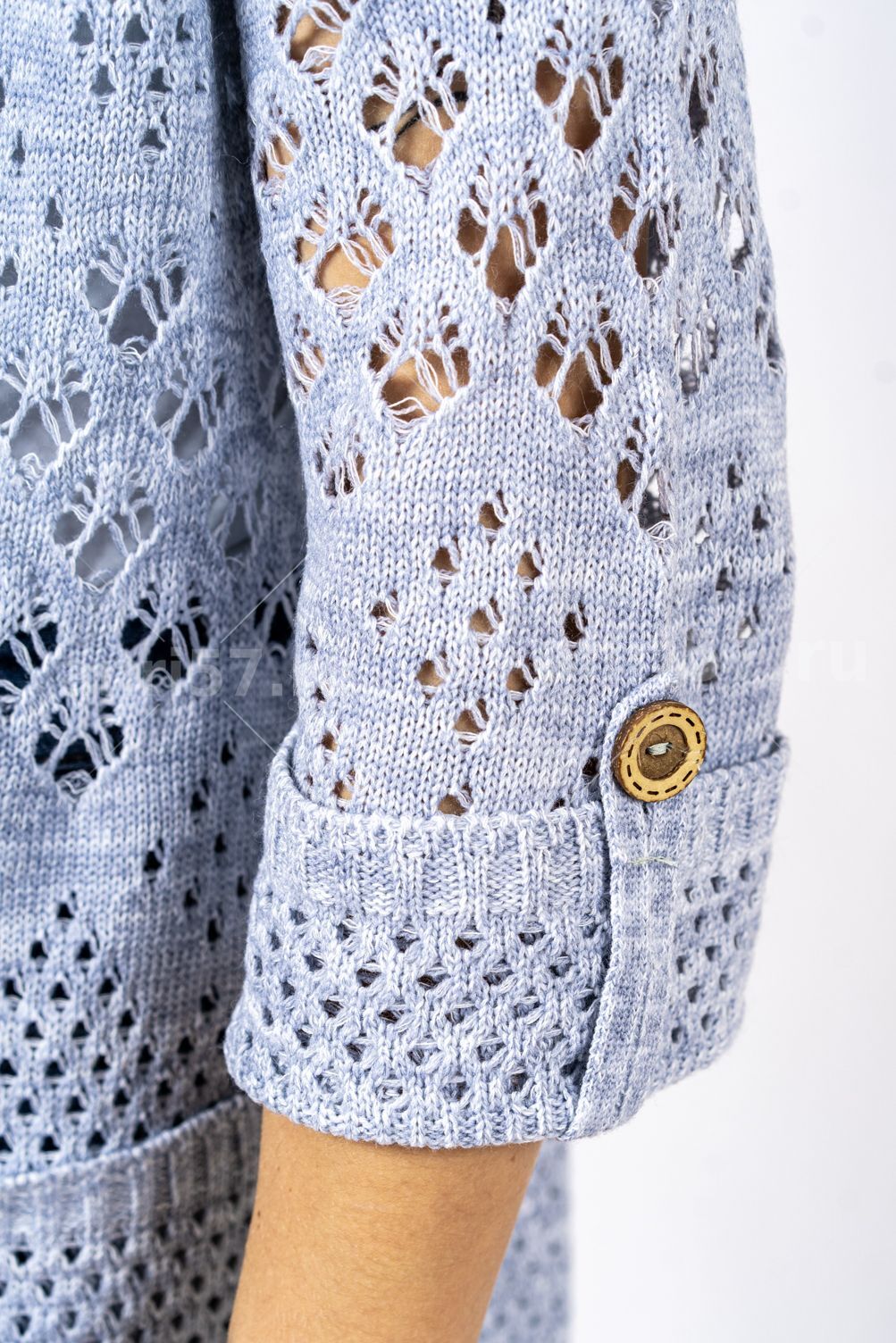Кардиган женский ж0666.Кардиган полуприлегающего силуэта из ажурного вязаного полотна с центральной застежкой на петли и пуговицы.Горловина округлой формы, рукав втачной, прямой, с отворотом на петлю и пуговицу, укороченный. На полочках карманы.В боковых швах - шлицы.Состав:50% Хлопок, 50% ПАН.