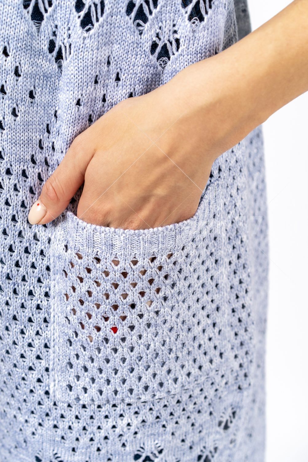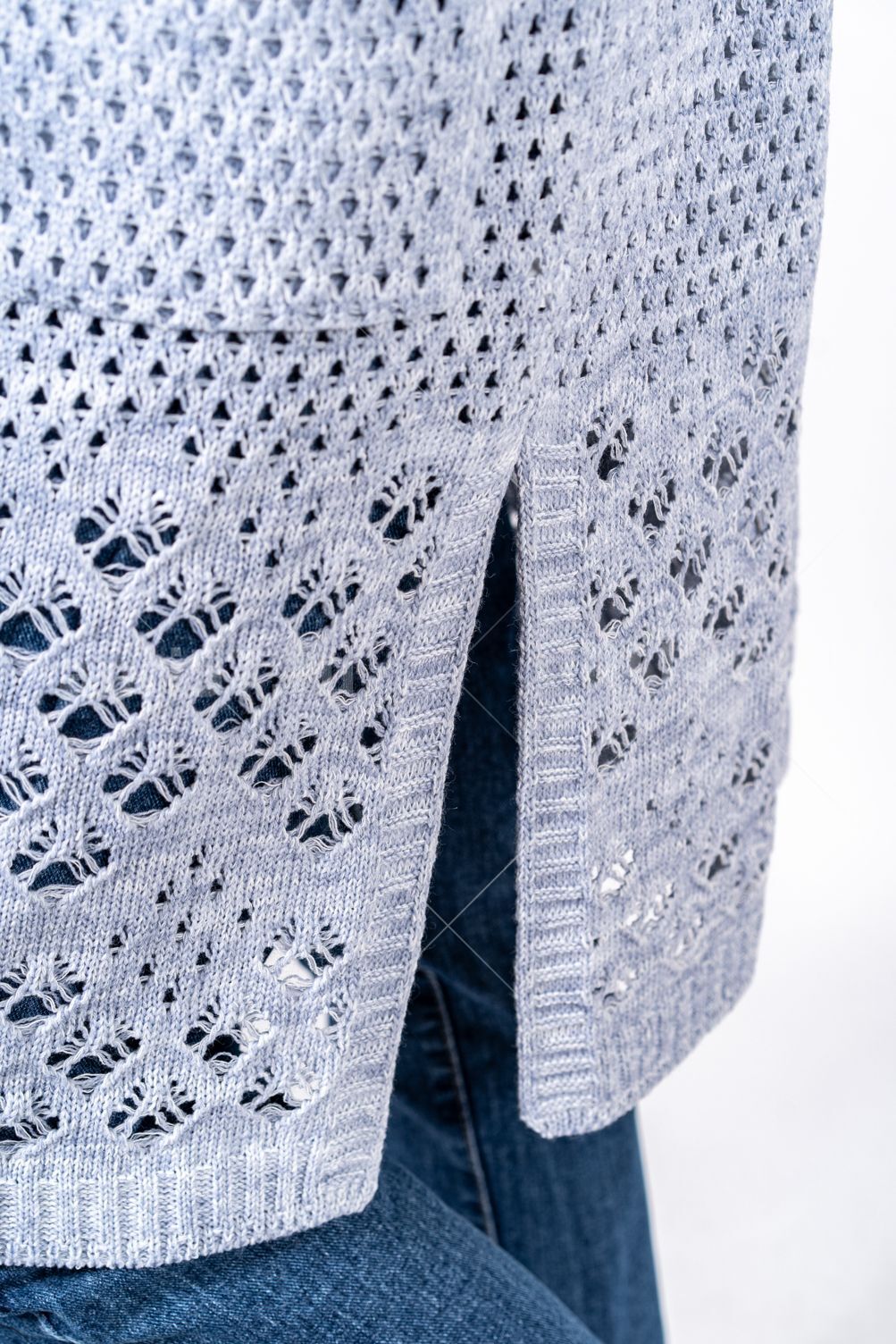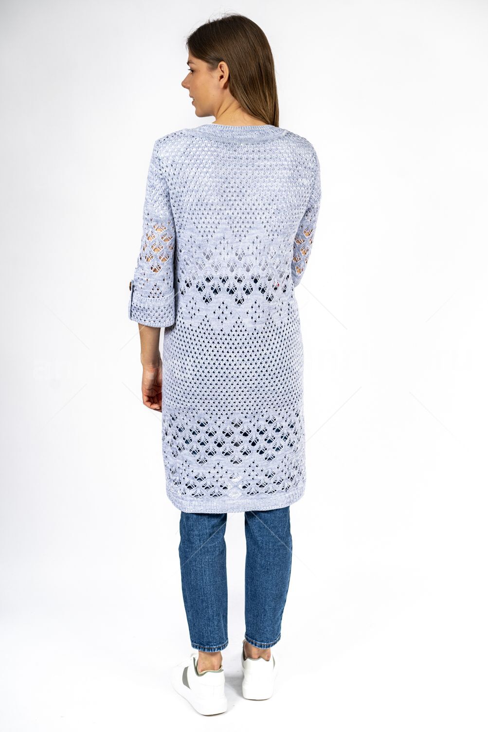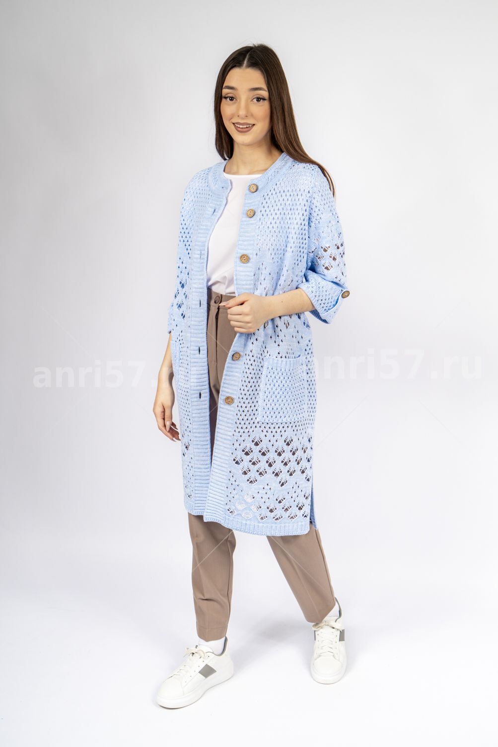Кардиган женский ж0666.Кардиган полуприлегающего силуэта из ажурного вязаного полотна с центральной застежкой на петли и пуговицы.Горловина округлой формы, рукав втачной, прямой, с отворотом на петлю и пуговицу, укороченный. На полочках карманы.В боковых швах - шлицы.Состав:50% Хлопок, 50% ПАН.