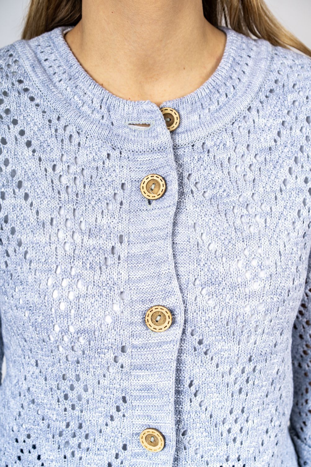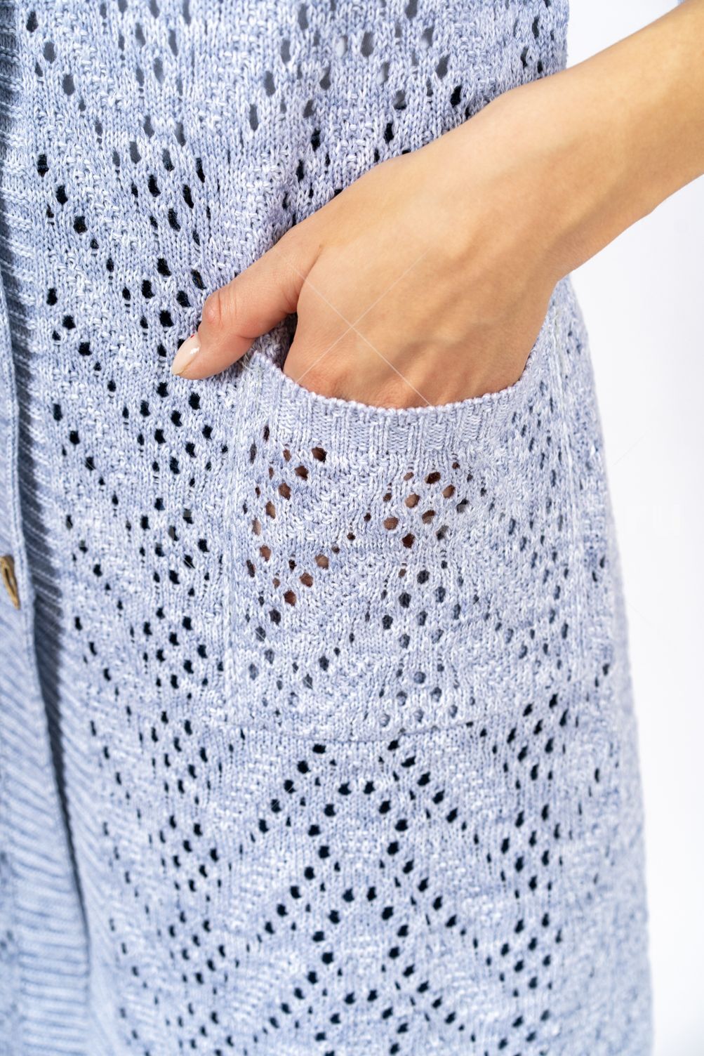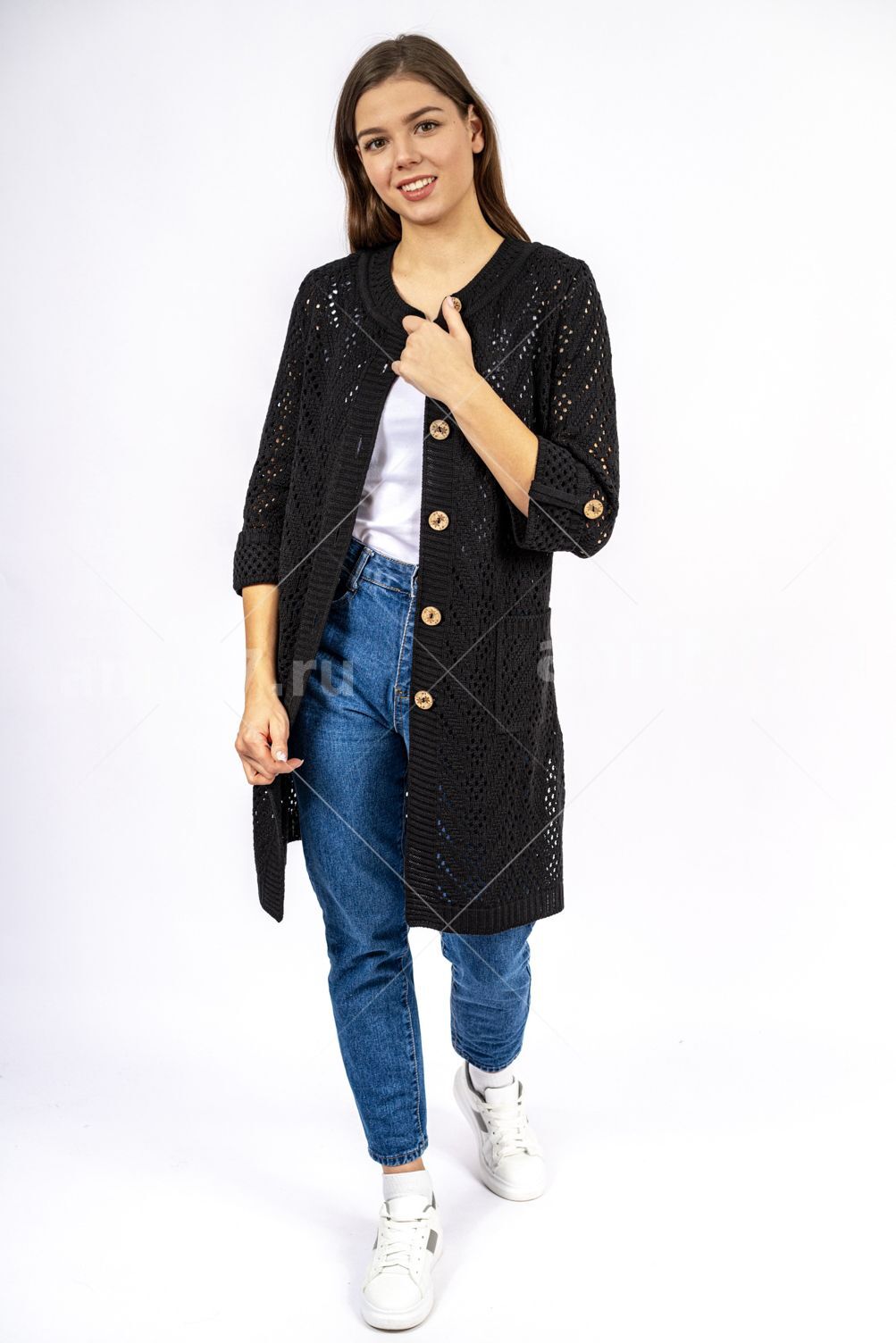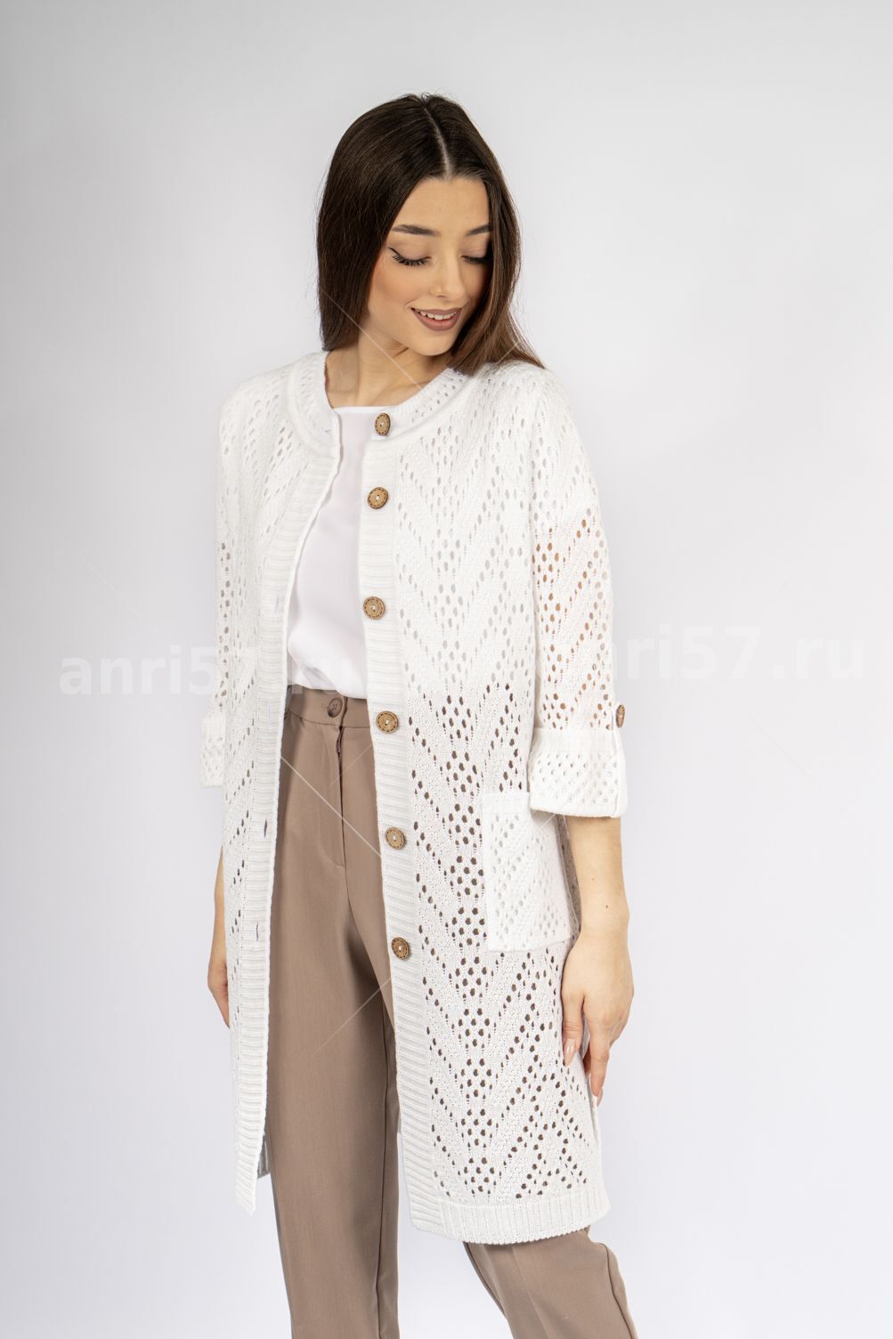 Кардиган женский ж0669.Кардиган полуприлегающего силуэта из ажурного вязаного полотна с центральной застежкой на петли и пуговицы.Горловина округлой формы, рукав втачной, прямой, с отворотом на петлю и пуговицу, укороченный. На полочках карманы.В боковых швах - шлицы.Состав:50% Хлопок, 50% ПАН.