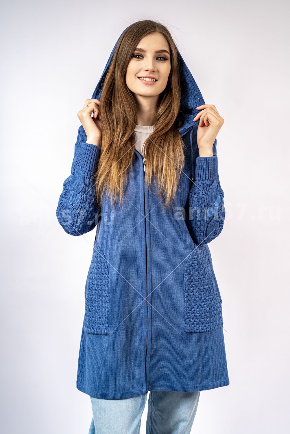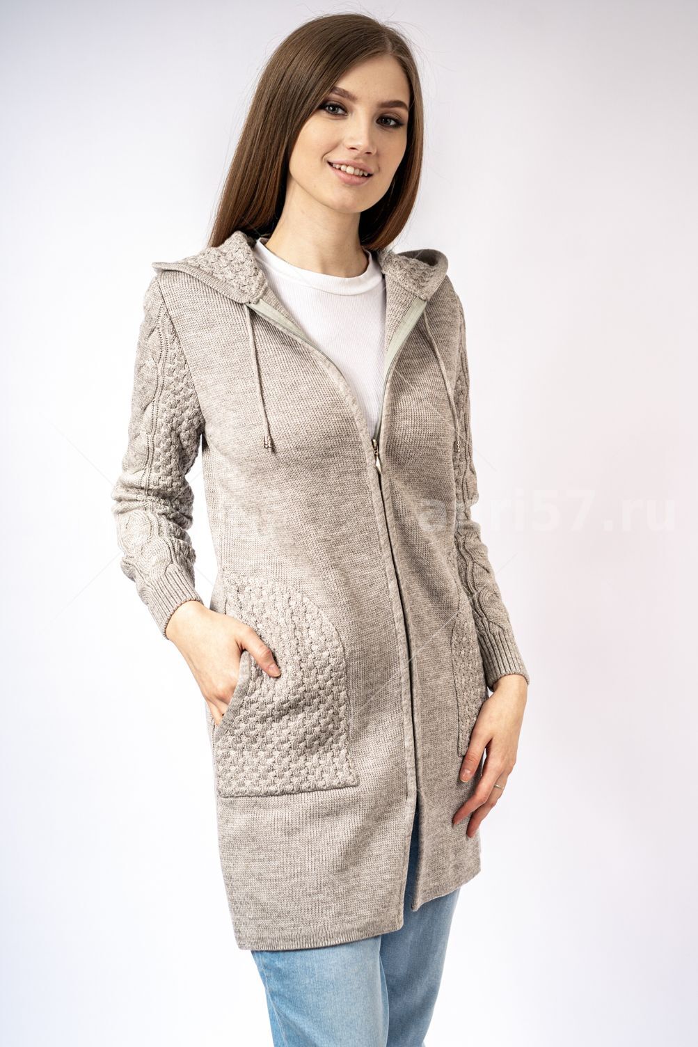 Парка женская ж0313капюшон. Парка - силуэт трапециевидный. Застежка борта центральная на тесьму молния.Карманы накладные в боковой шов с окантованным тесьмой входом. Рукав втачной с резинкой по низу. Парка с капюшоном со шнурком. Карманы, рукав, капюшон - фактурной вязки. Состав: 30% Шерсть, 70% ПАН.