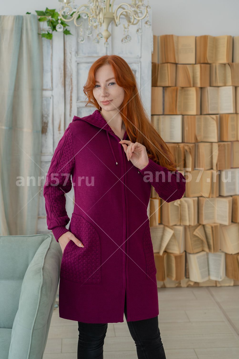 Парка женская ж0313капюшон. Парка - силуэт трапециевидный. Застежка борта центральная на тесьму молния.Карманы накладные в боковой шов с окантованным тесьмой входом. Рукав втачной с резинкой по низу. Парка с капюшоном со шнурком. Карманы, рукав, капюшон - фактурной вязки. Состав: 30% Шерсть, 70% ПАН.
