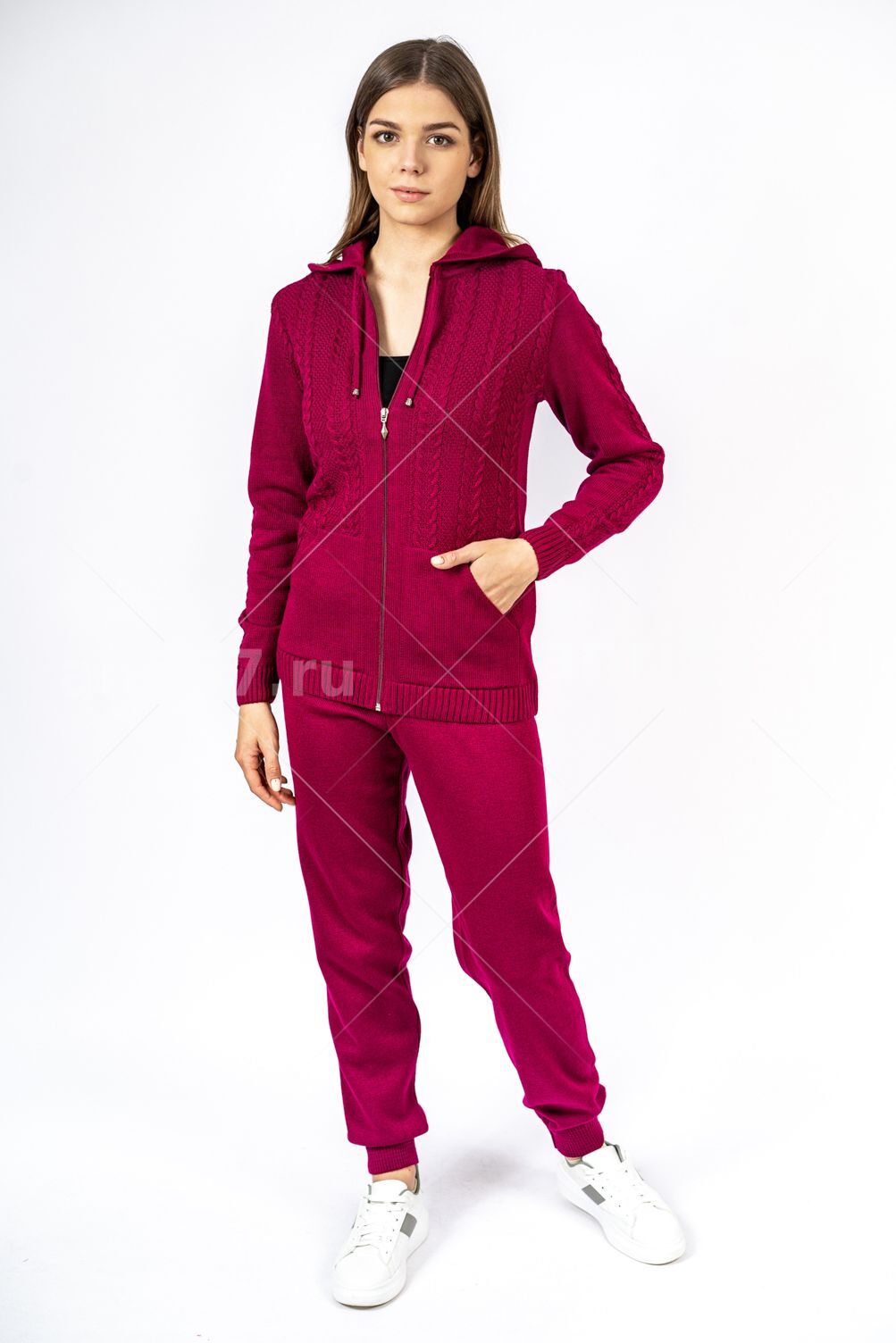 Спортивный костюм женский ж0554. Костюм спортивный из вязаного полотна, состоит из куртки с капюшоном, с центральной застежкой на тесьму "молния" и брюк. Куртка с вывязанными карманами, с фактурным узором на полочке и по рукаву. Брюки на эластичной тесьме по поясу и на "резинке" по низу, зауженного силуэта. Состав: 30% Шерсть, 70% ПАН.