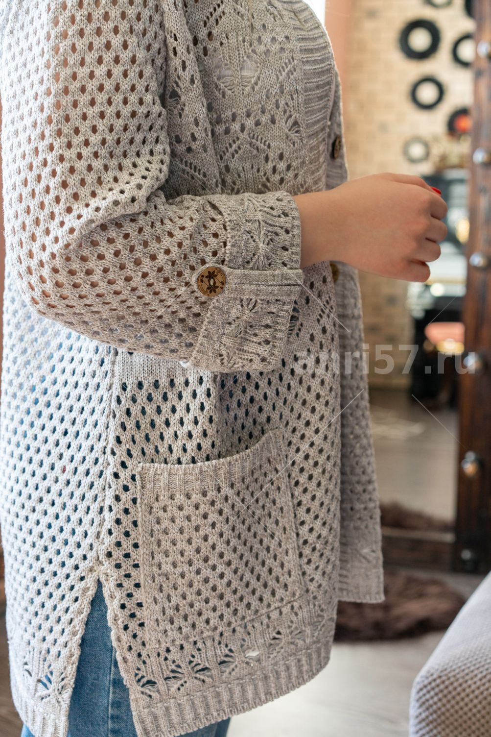Жакет женский ж0484.Жакет полуприлегающего силуэта из ажурного вязаного полотна с центральной застежкой на петли и пуговицы.Горловина округлой формы.На полочках накладные карманы.В боковых швах разрезы.Рукав втачной,укороченный с отворотом пристегнутым на петлю и пуговицу.Состав:50% Хлопок, 50% ПАН.