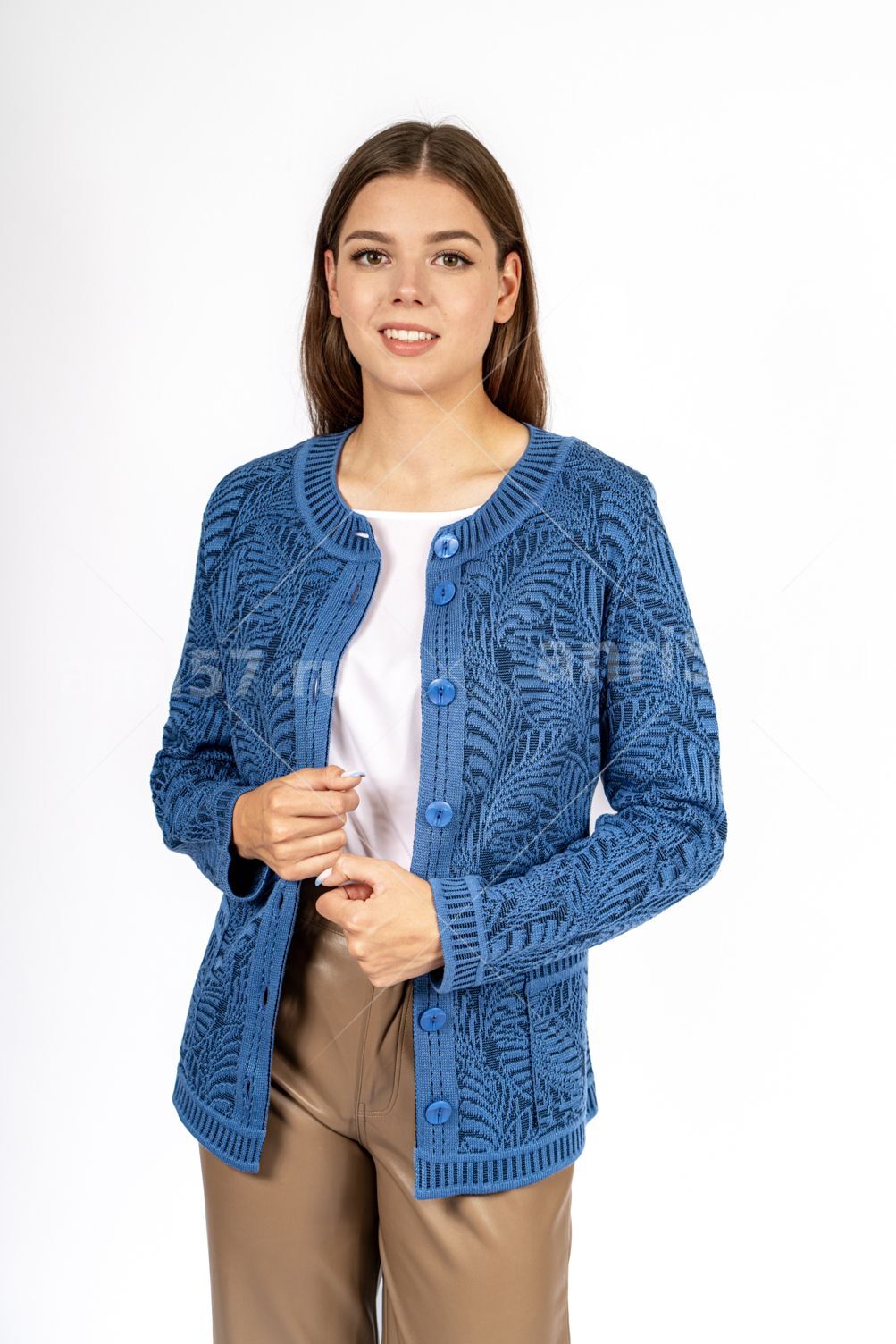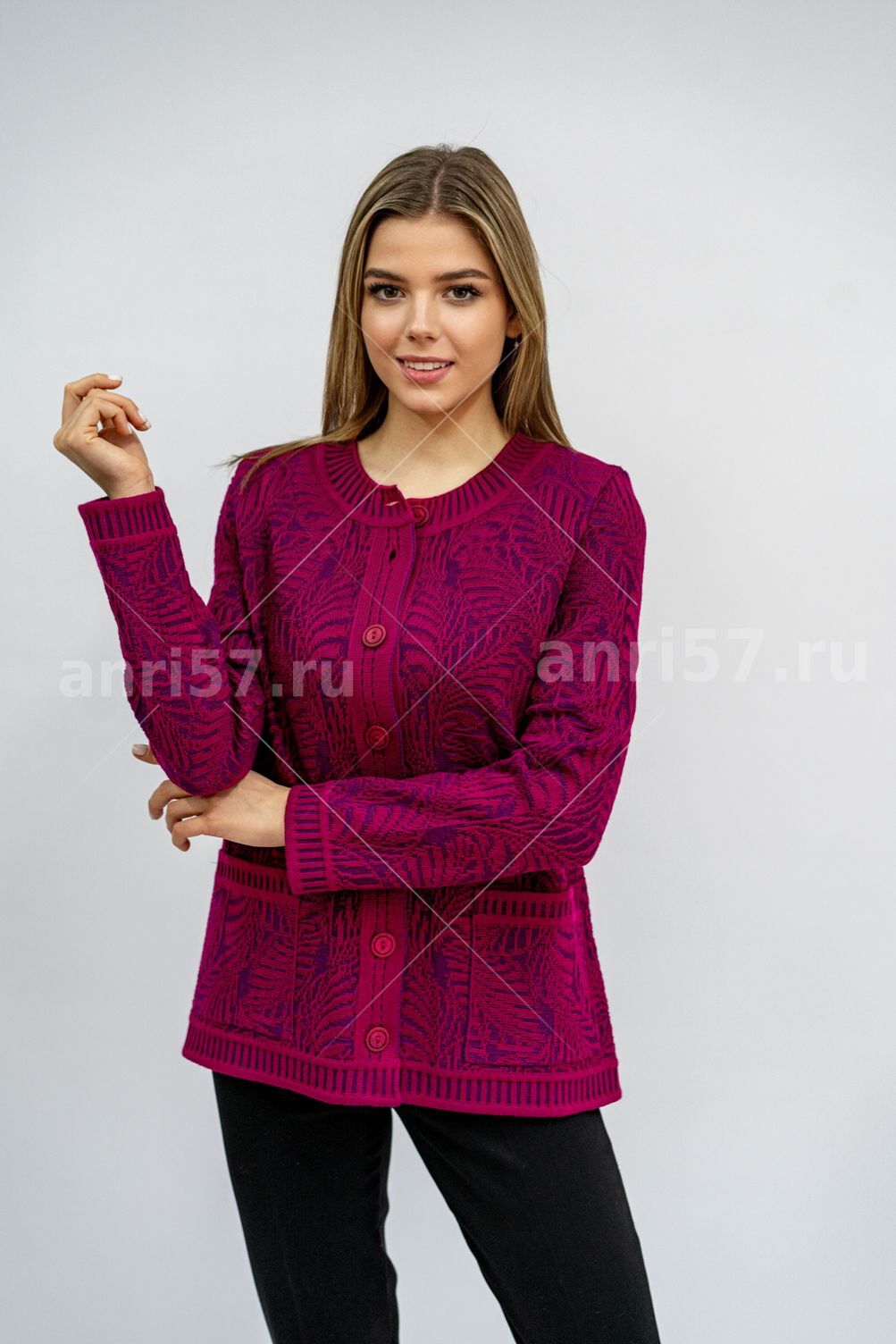 Жакет женский ж0514. Жакет полуприлегающего силуэта из жаккардового вязаного полотна двух цветов с центральной застежкой на петли и пуговицы. Горловина округлой формы с обтачкой. Рукав втачной, прямой. На полочках накладные карманы. Состав: 30% Шерсть, 70% ПАН.