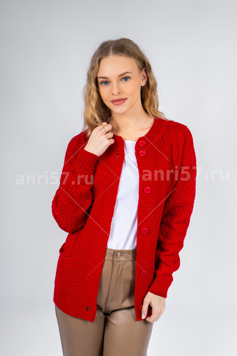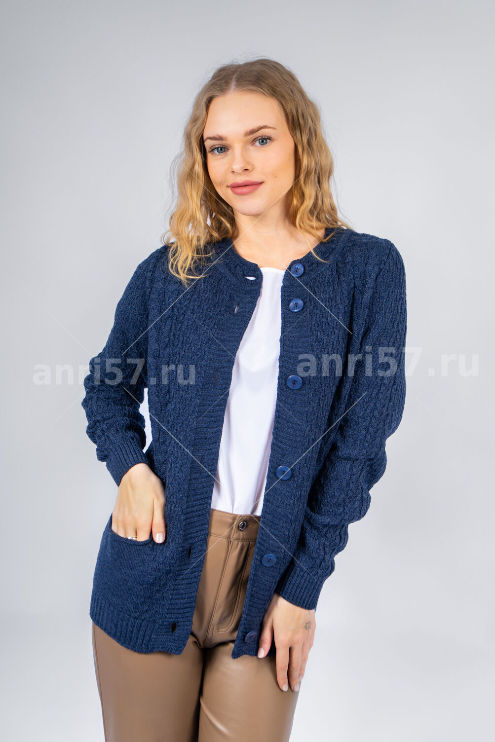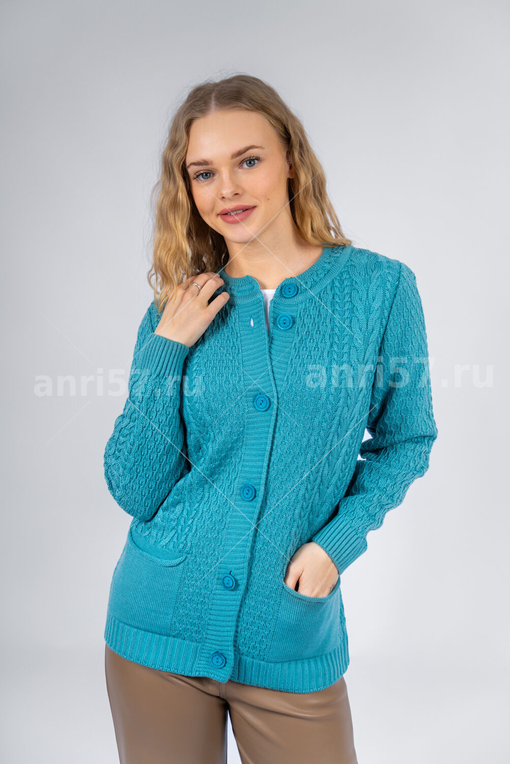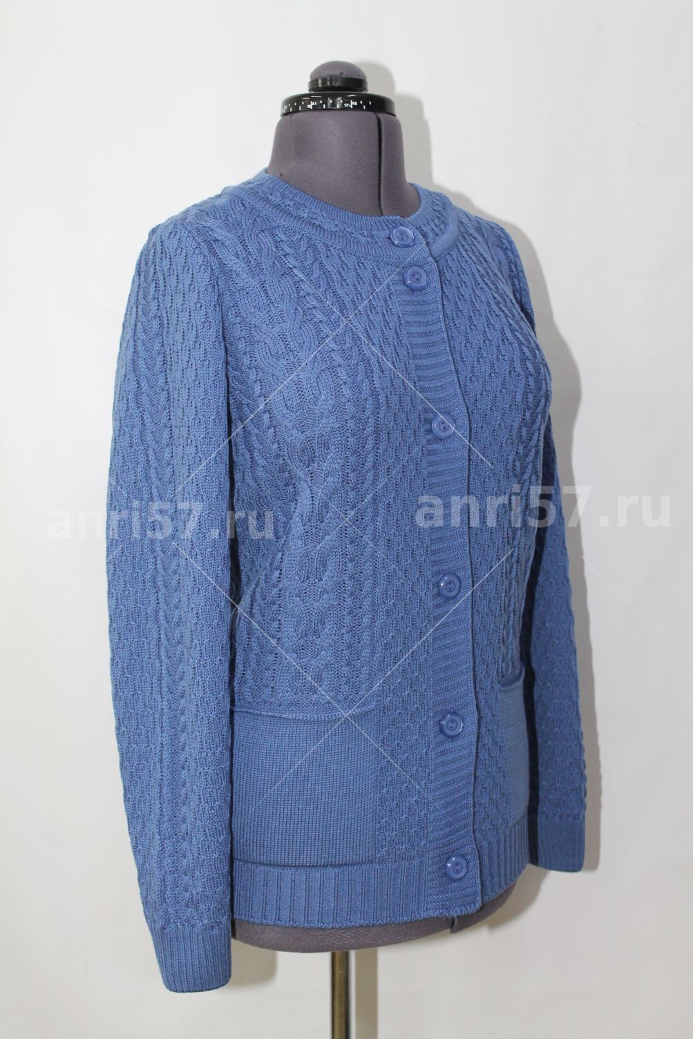 Жакет женский ж0584. Жакет полуприлегающего силуэта из вязаного полотна с центральной застежкой на петли и пуговицы. Горловина округлой формы. Карманы вывязаны. Рукав втачной, на "резинке" по низу. Состав: 30: Шерсть, 70% ПАН.
