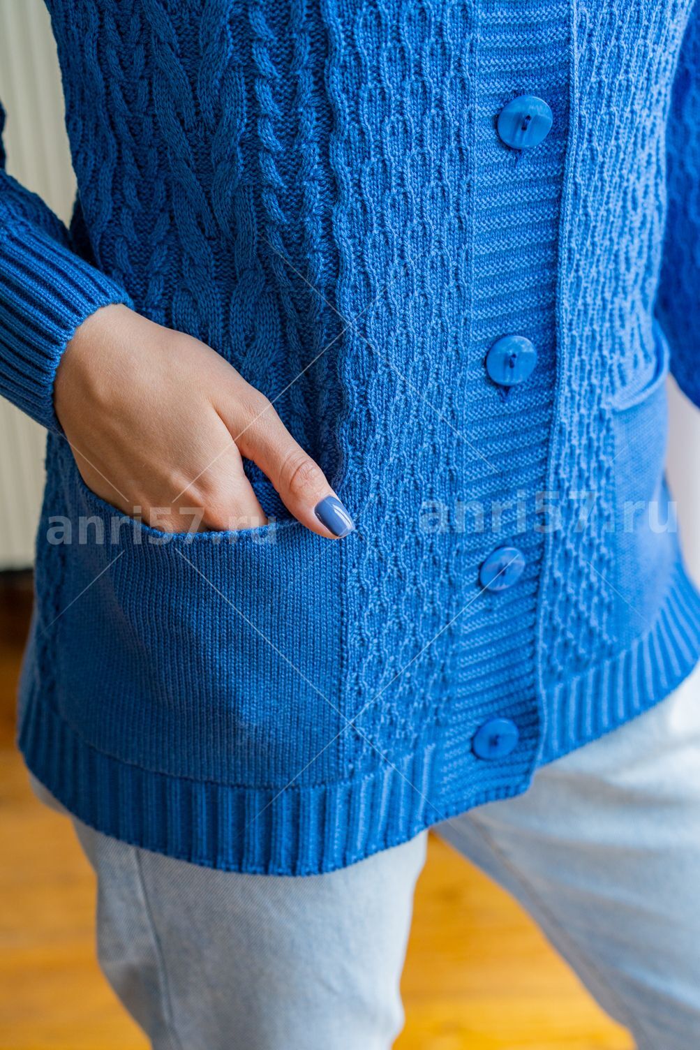 Жакет женский ж0584. Жакет полуприлегающего силуэта из вязаного полотна с центральной застежкой на петли и пуговицы. Горловина округлой формы. Карманы вывязаны. Рукав втачной, на "резинке" по низу. Состав: 30: Шерсть, 70% ПАН.