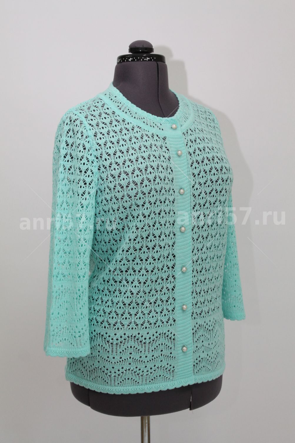 Жакет женский ж0611. Жакет полуприлегающего силуэта из тонкого, вязаного, ажурного полотна, с центральной застежкой на петли и пуговицы. Горловина округлой формы. Рукав прямой, втачной, укороченный. Состав: 50% Хлопок, 50% ПАН.