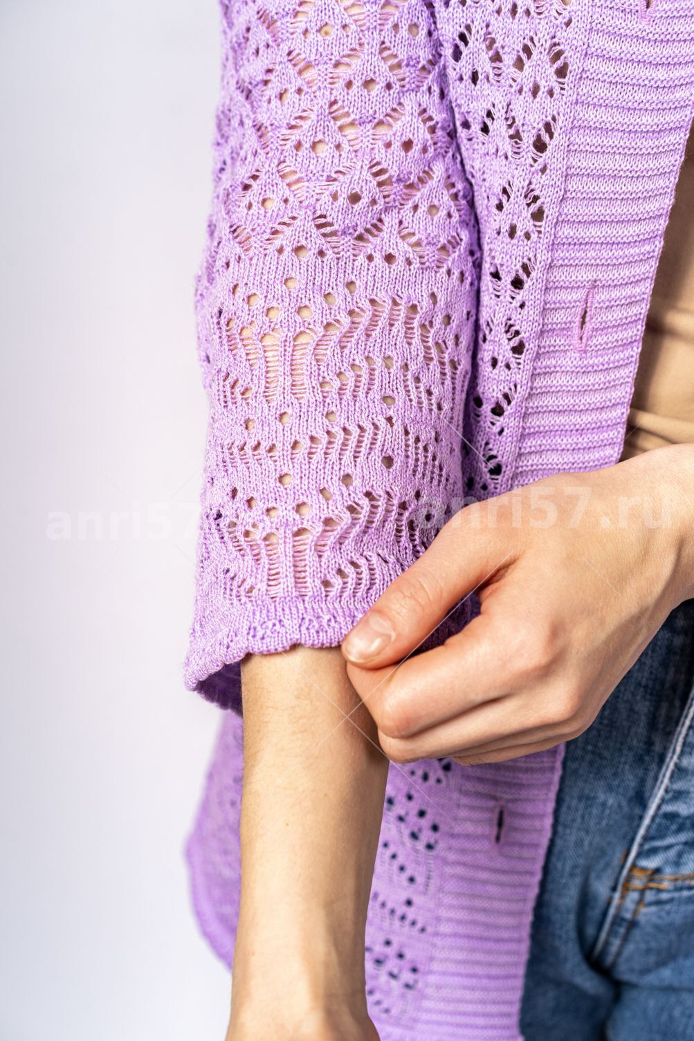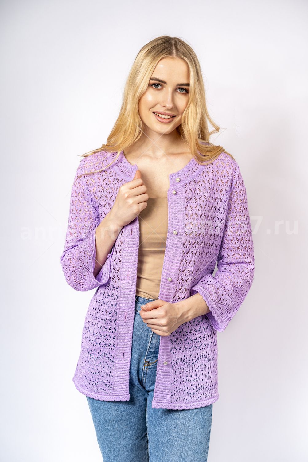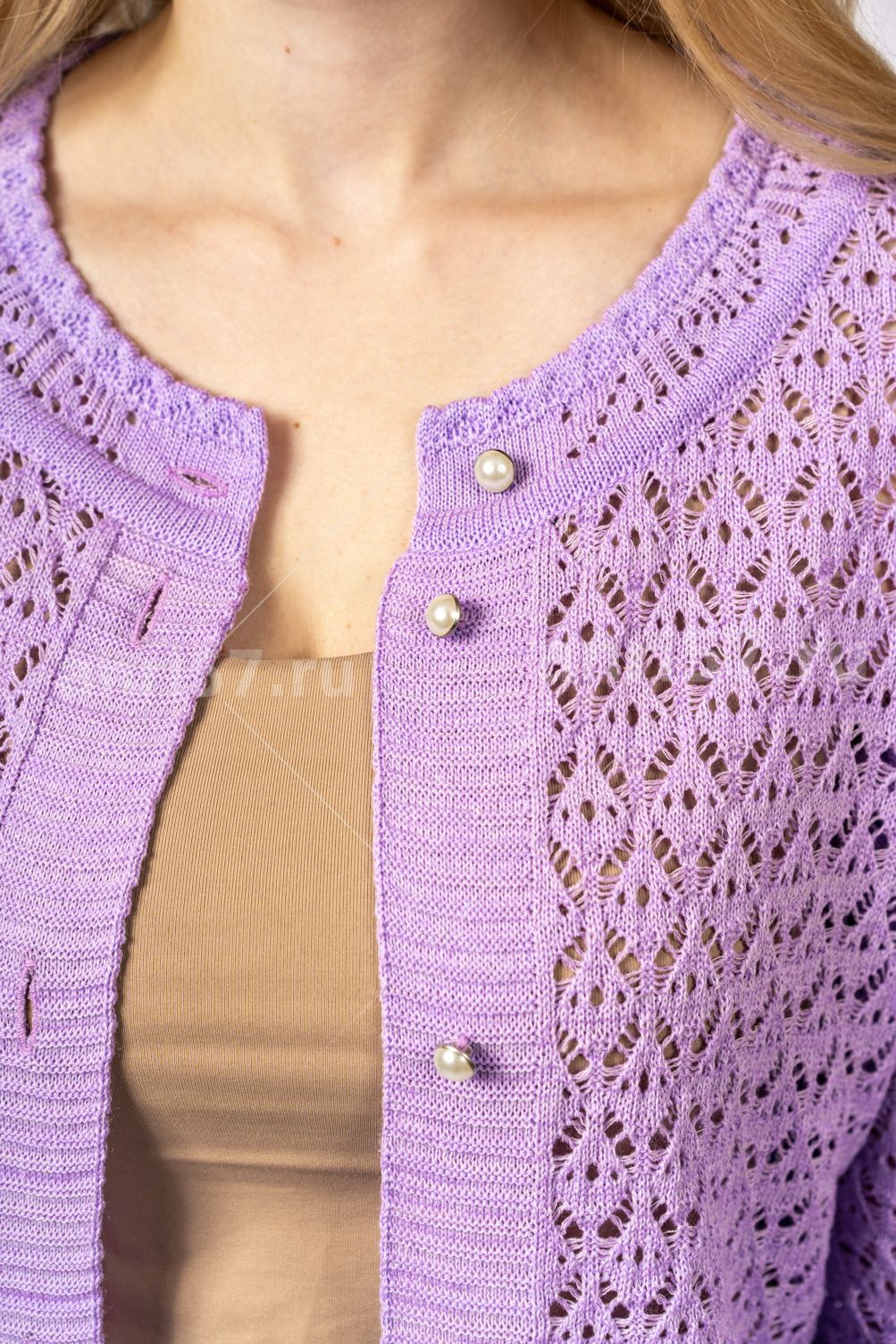 Жакет женский ж0611. Жакет полуприлегающего силуэта из тонкого, вязаного, ажурного полотна, с центральной застежкой на петли и пуговицы. Горловина округлой формы. Рукав прямой, втачной, укороченный. Состав: 50% Хлопок, 50% ПАН.