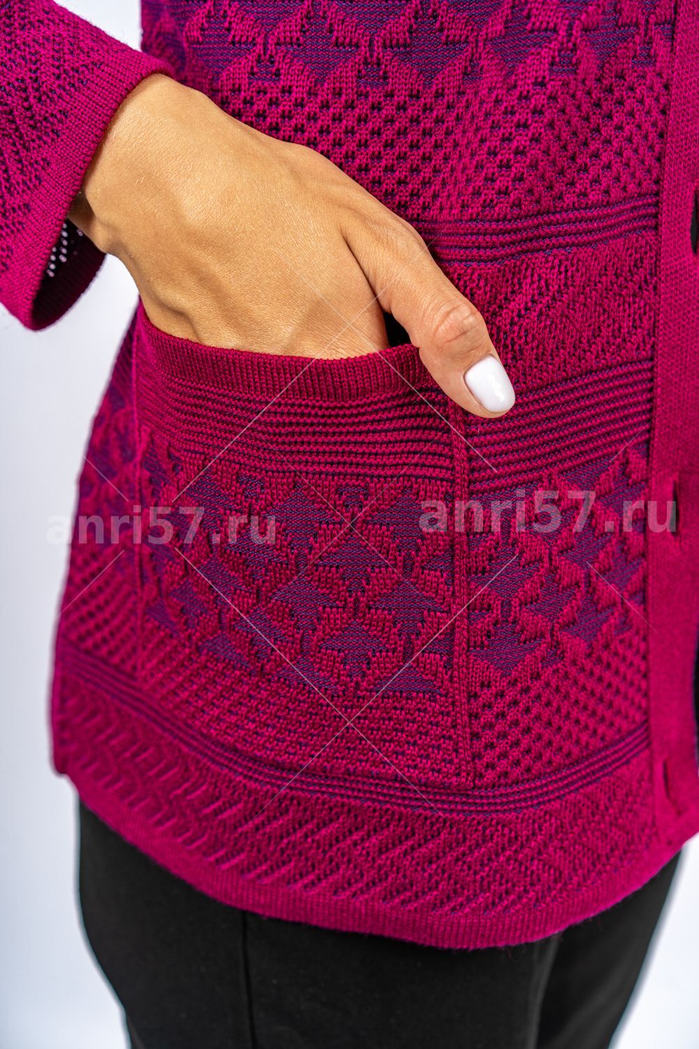 Жакет женский ж0628.Жакет полуприлегающего силуэта из жаккардового двухцветного вязаного полотна, с центральной застежкой на петли и пуговицы. Горловина округлой формы с обтачкой.Рукав втачной, прямой.На полоках накладные карманы.Состав: 30% Шерсть, 70% ПАН.