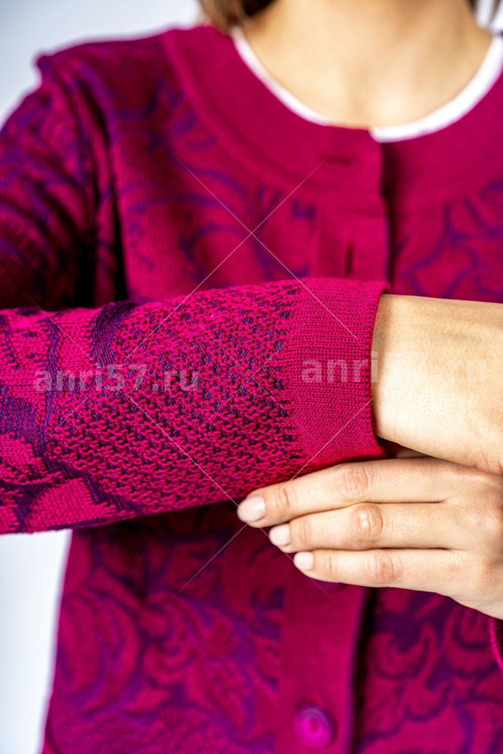 Жакет женский ж0663. Жакет полуприлегающего силуэта из жаккардового вязаного полотна двух цветов с центральной застежкой на петли и пуговицы. Горловина округлой формы с обтачкой. Рукав втачной, прямой. На полочках накладные карманы. Состав: 30% Шерсть, 70% ПАН.
