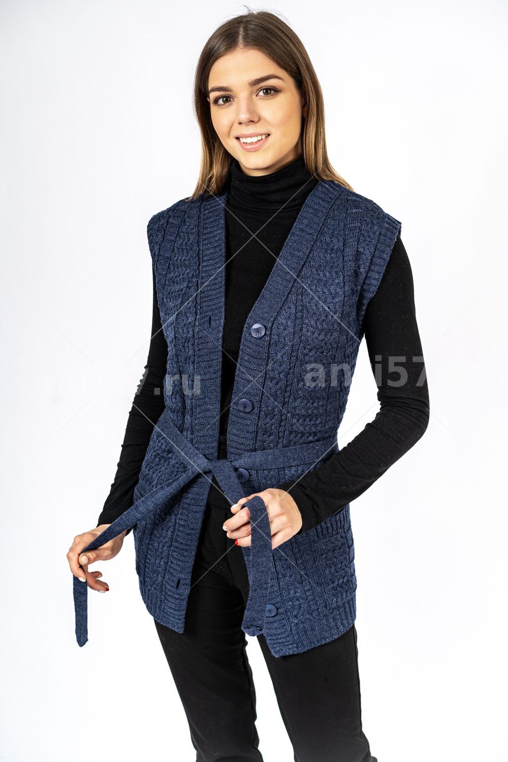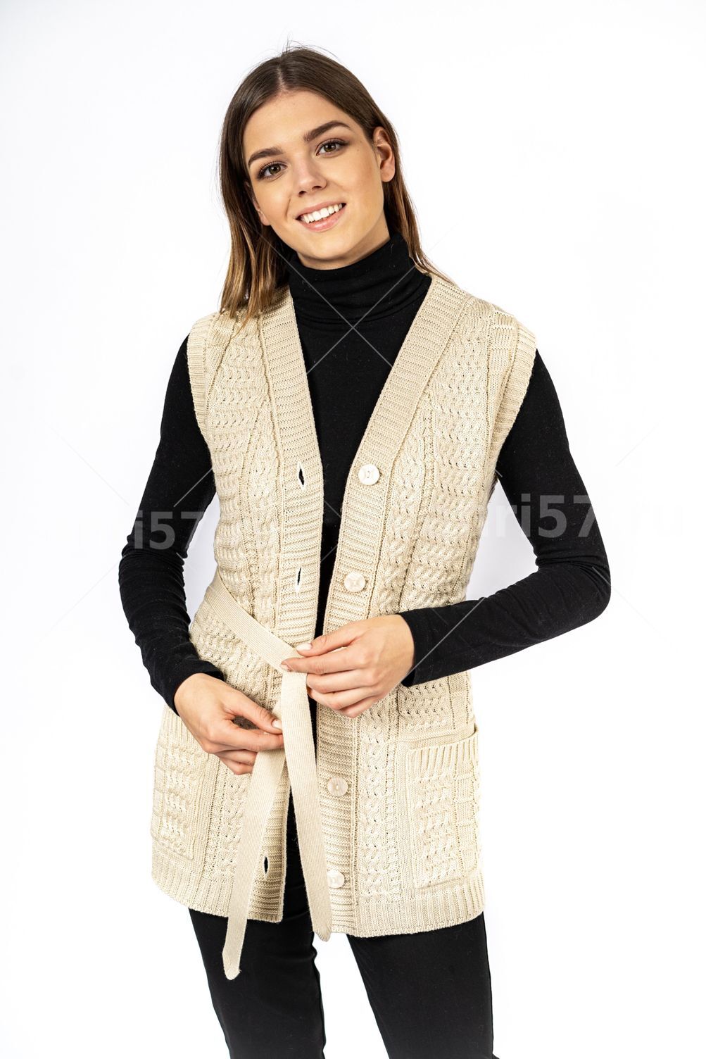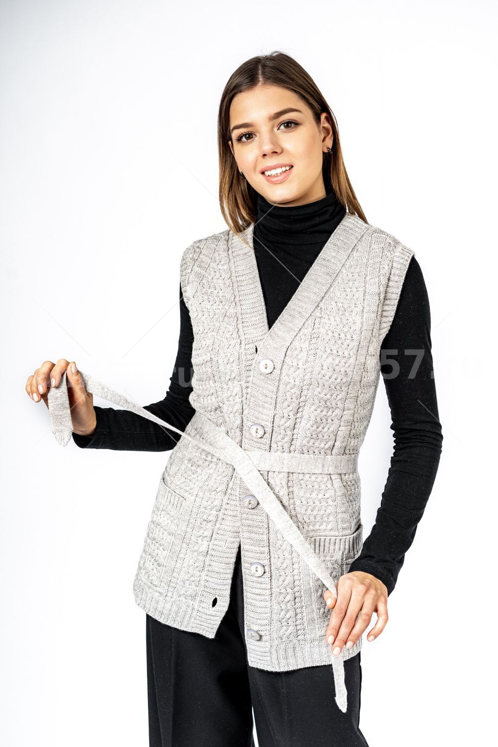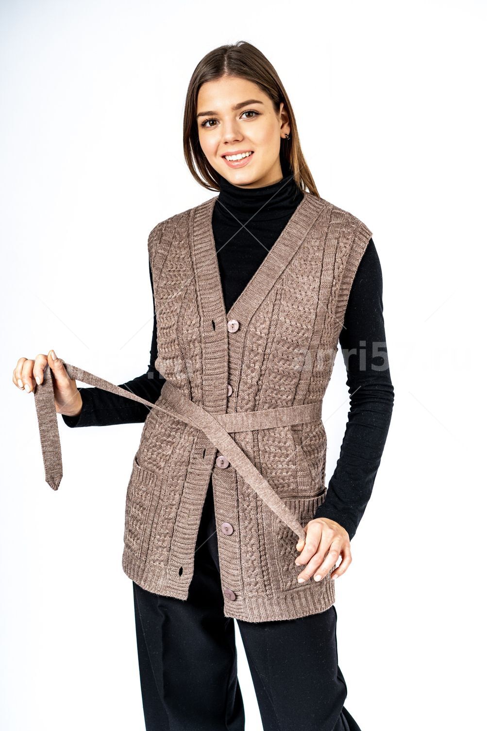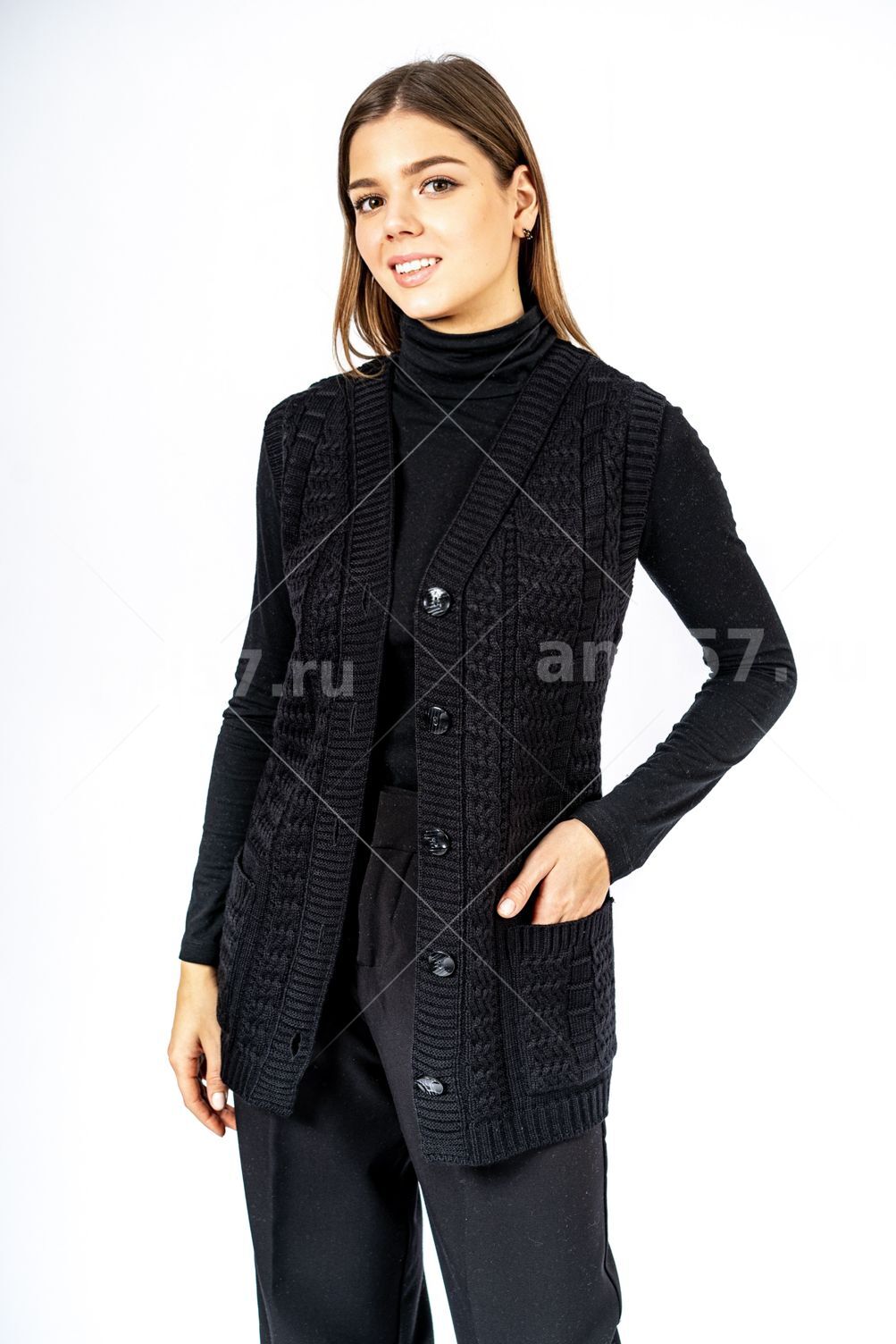 Жилет женский ж0208Великан. Жилет полуприлегающего силуэта с центральной застежкой на петли и пуговицы. Полочки с накладными карманами. Состав: 30% Шерсть, 70% ПАН.