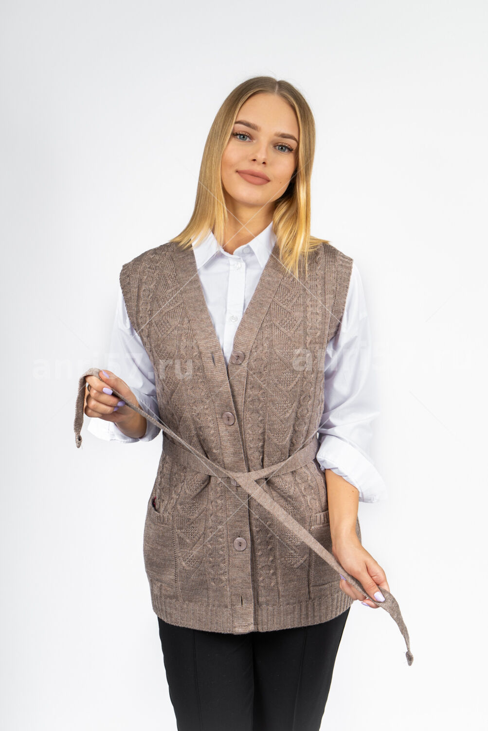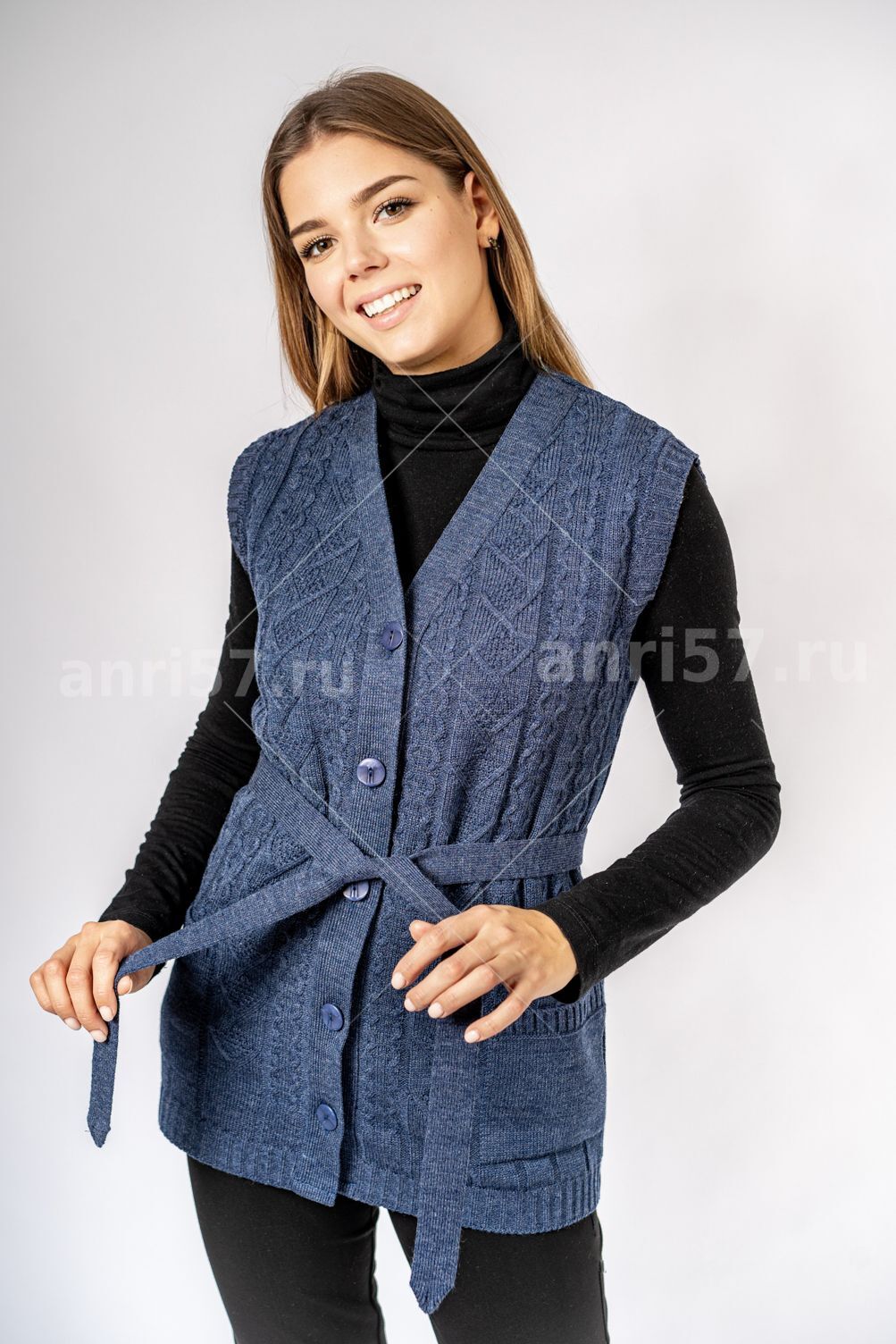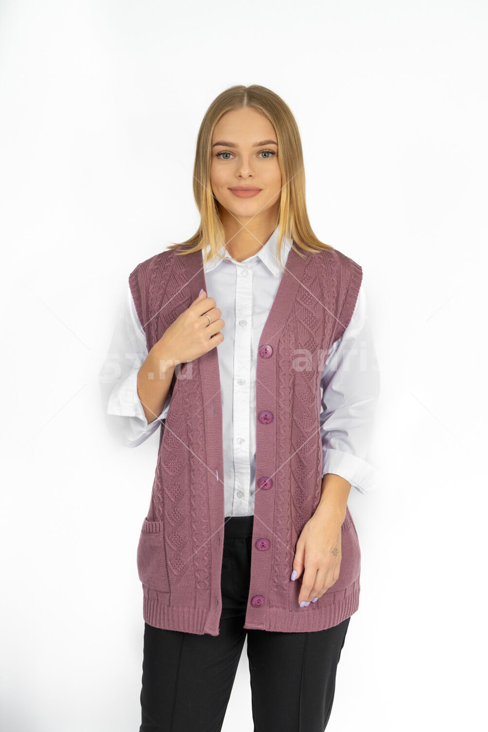 Жилет женский на пуговицах с карманами ж0312. Жилет вязаный, полуприлегающего силуэта с застежкой на петли и пуговицы. На полочках вывязаны карманы, край бортов с планками. Проймы с притачными обтачками. Состав: 30% Шерсть, 70% ПАН.