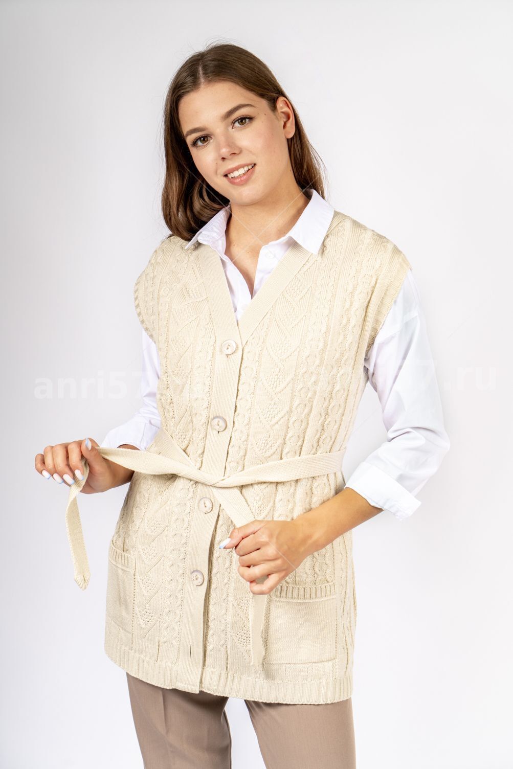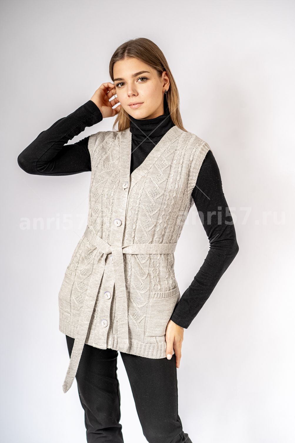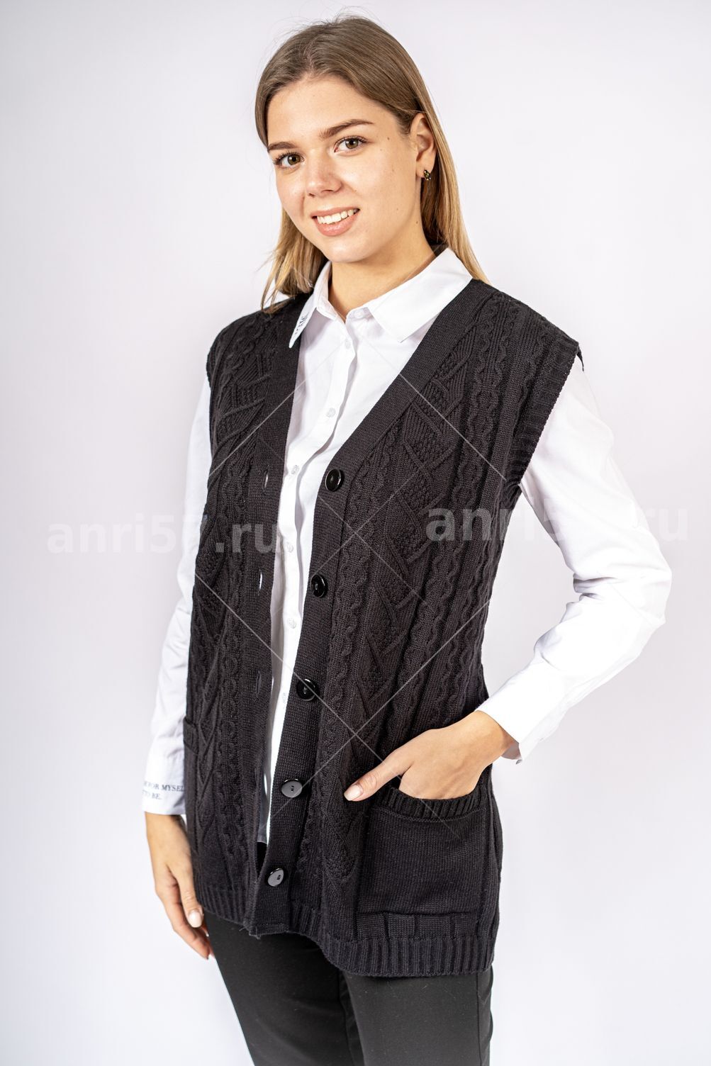 Жилет женский на пуговицах с карманами ж0312Великан. Жилет вязаный, полуприлегающего силуэта с застежкой на петли и пуговицы. На полочках вывязаны карманы, край бортов с планками. Проймы с притачными обтачками. Состав: 30% Шерсть, 70% ПАН.