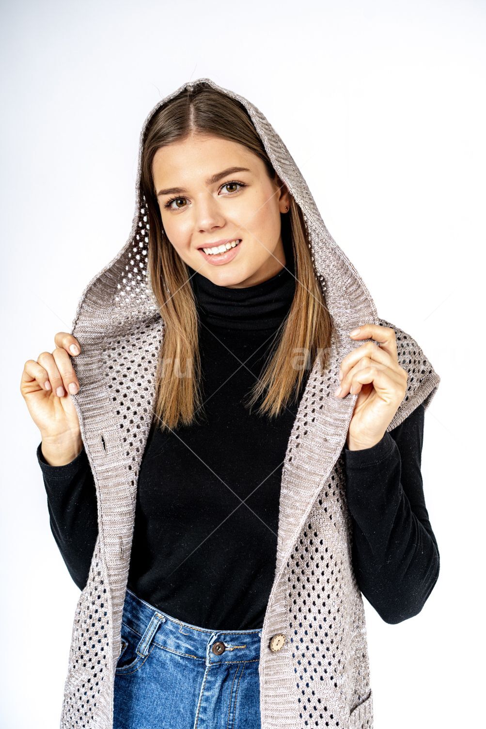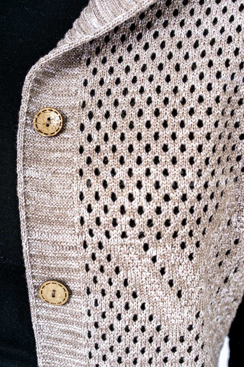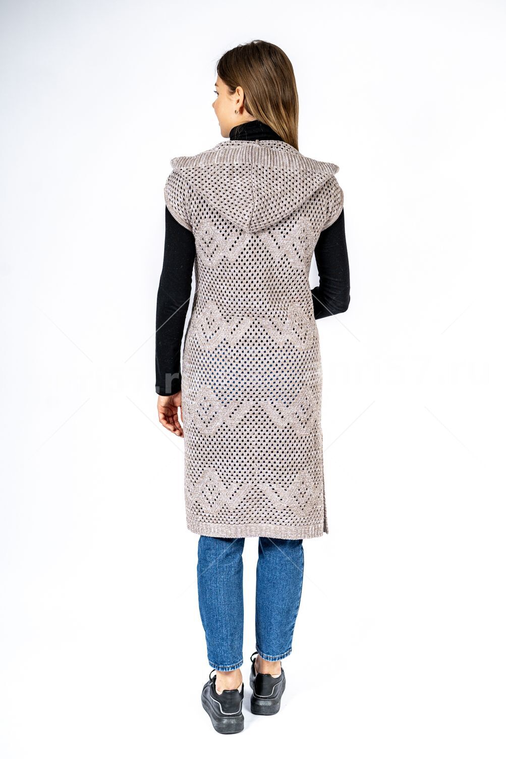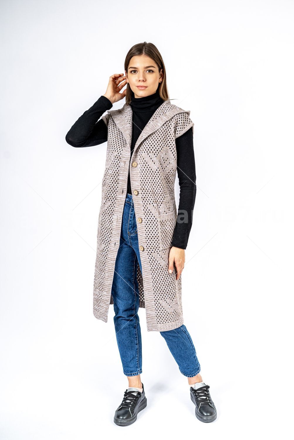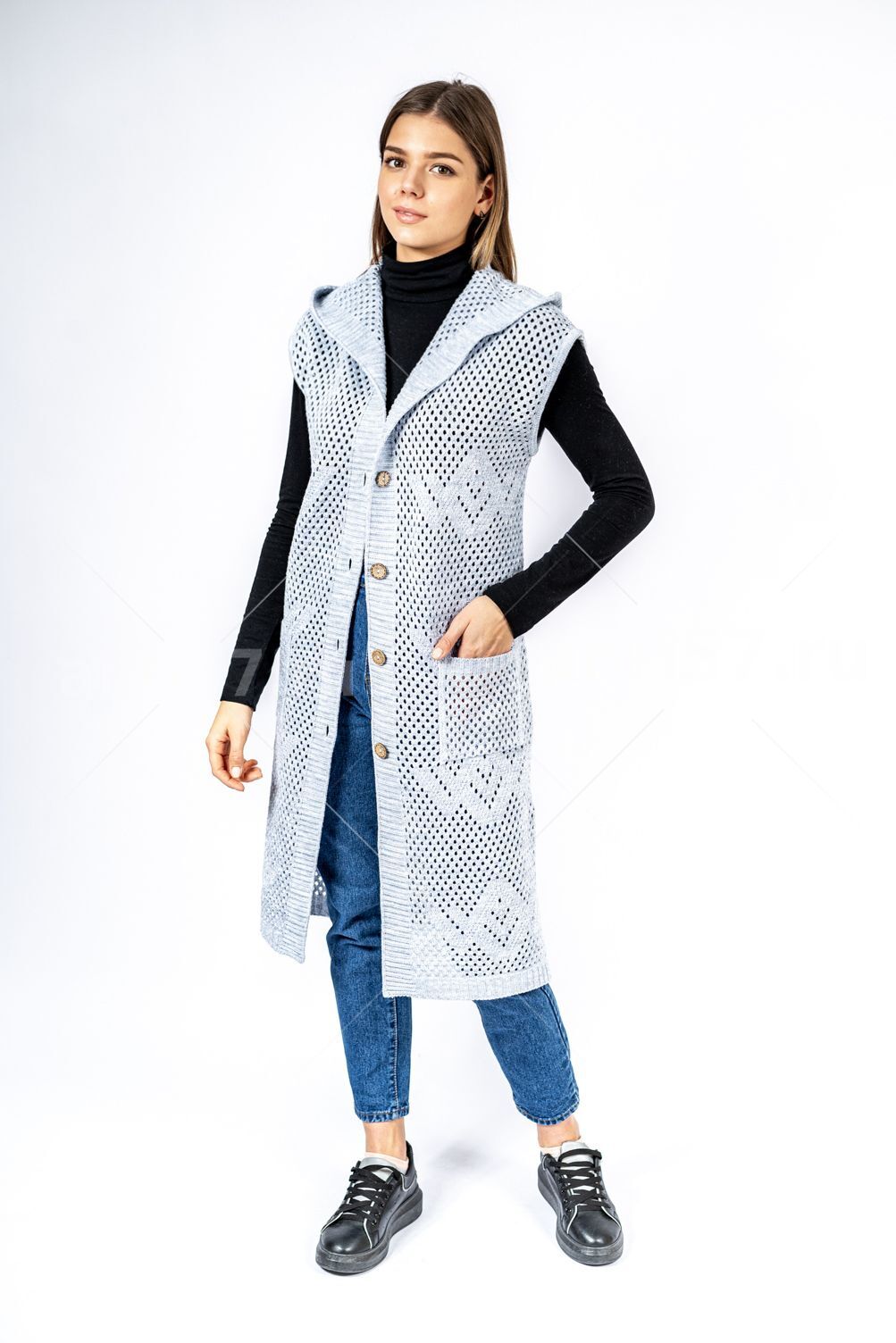 Жилет женский ж0613. Жилет прямого силуэта с цельнокроенным капюшоном, с центральной застежкой на петли и пуговицы из ажурного вязаного полотна. На полочках накладные карманы, в боковых швах разрезы. Состав: 50% Хлопок, 50% ПАН.